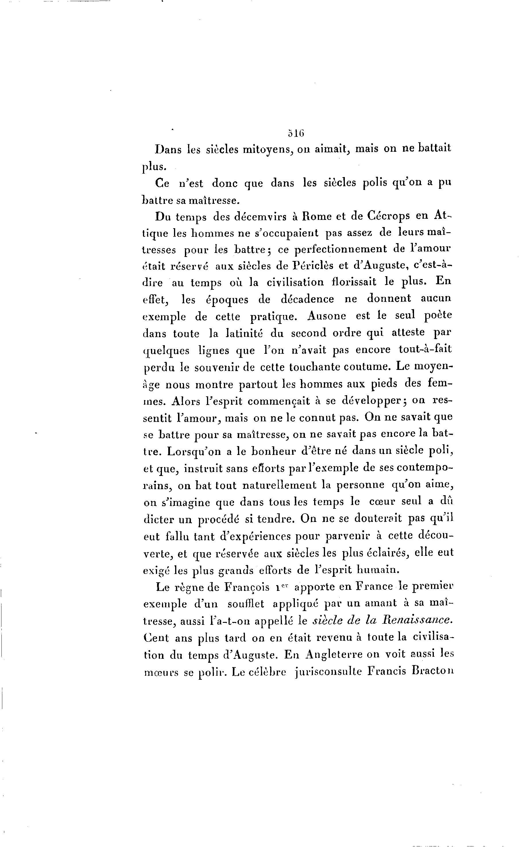 516 D a n s les siècles mitoyens, on aimait, mais on ne battait plus. Ce n'est donc que dans les siècles polis q u ' o n a pu b a t t r e sa maîtresse. Du temps des décemvirs à Rome et de Cécrops en At-- tique les h o m m e s ne s'occupaient pas assez de leurs maî- tresses pour les battre 3 ce perfectionnement de l'amour était réservé aux siècles de Périclès et d'Auguste, c'est-à - dire au temps où la civilisation florissait le plus. En effet, les époques de décadence ne donnent aucun exemple de cette pratique. Ausone est le seul poète dans toute la latinité du second o r d r e qui atteste par quelques lignes que l'on n'avait pas encore tout-à -fait p e r d u le souvenir de cette touchante coutume. Le moyen- à ge nous m o n t r e p a r t o u t les hommes aux pieds des fem- mes. Alors l'esprit commençait à se développer 5 on res- sentit l'amour, mais on ne le c o n n u t pas. O n ne savait que se b a t t r e pour sa maîtresse, on ne savait pas encore la b a t - t r e . L o r s q u ' o n a le b o n h e u r d'être né dans un siècle p o l i , et q u e , instruit sans efforts par l'exemple de ses c o n t e m p o - rains, on bat tout n a t u r e l l e m e n t la personne qu'on aime, on s'imagine que dans tous les temps le cœur seul a dû dicter u n procédé si t e n d r e . O n ne se douterait pas qu'il eut fallu tant d'expériences pour parvenir à cette décou- verte, et que réservée aux siècles les plus éclairés, elle eut exigé les plus grands efforts de l'esprit h u m a i n . Le règne de François 1 " a p p o r t e en F r a n c e le p r e m i e r exemple d ' u n soufflet appliqué par u n amant à sa maî- tresse, aussi l'a-t-on appelle le siècle de la Renaissance. Cent ans plus t a r d on en était revenu à toute la civilisa- tion du temps d'Auguste. E n Angleterre on voit aussi les mœurs se polir. Le célèbre jurisconsulte Francis Bracton