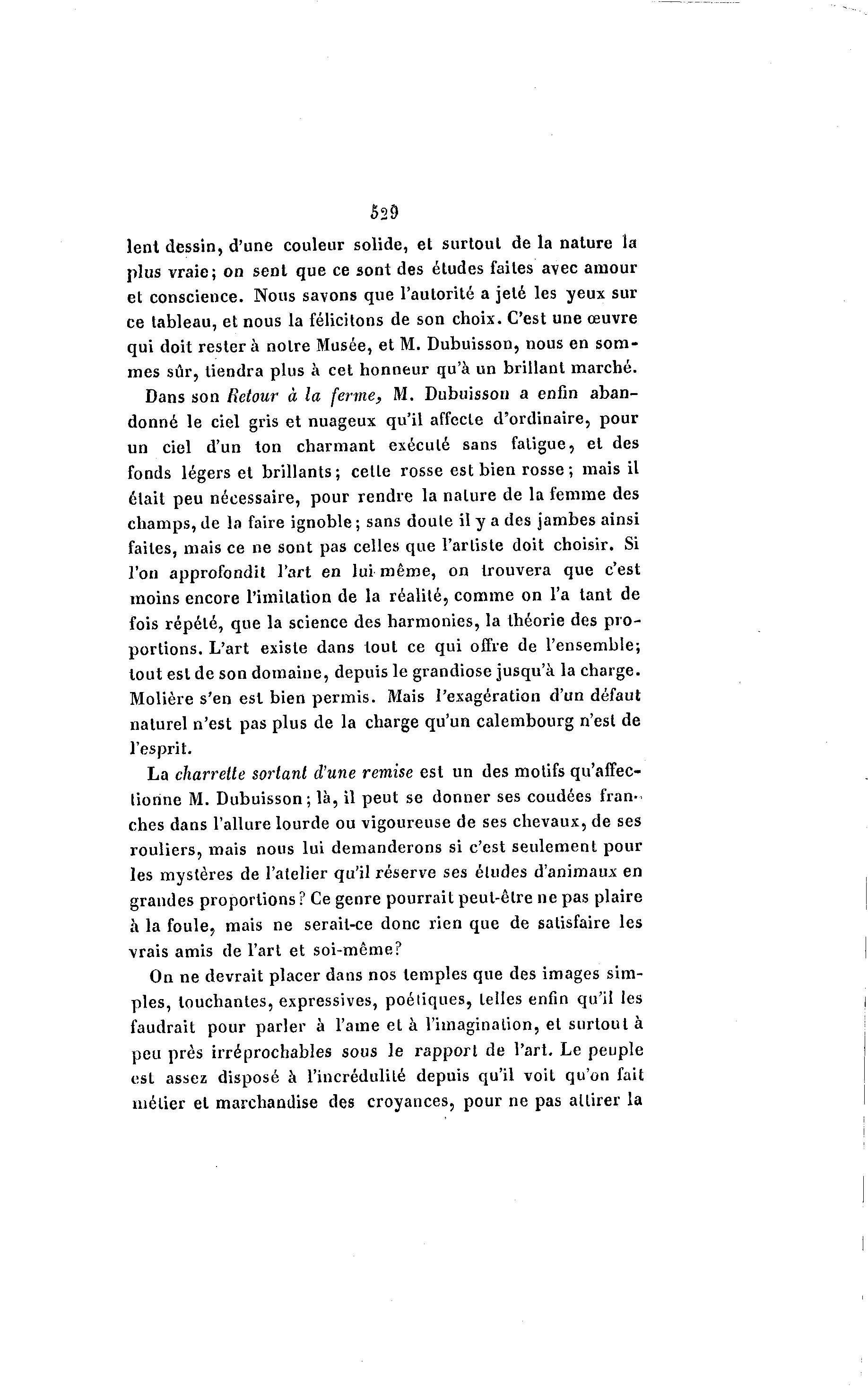 ê29 lent dessin, d'une couleur solide, et surtout de la nature la plus vraie; on sent que ce sont des études faites avec amour et conscience. Nous savons que l'autorité a jeté les yeux sur ce tableau, et nous la félicitons de son choix. C'est une œuvre qui doit r e s t e r a notre Musée, et M. Dubuisson, nous en som- mes sûr, tiendra plus à cet honneur qu'à un brillant marché. Dans son Retour à la ferme, M. Dubuisson a enfin aban- donné le ciel gris et nuageux qu'il affecte d'ordinaire, pour un ciel d'un ton charmant exécuté sans fatigue, et des fonds légers et brillants; cette rosse est bien rosse ; mais il élait peu nécessaire, pour rendre la nature de la femme des champs, de la faire ignoble ; sans doute il y a des jambes ainsi faites, mais ce ne sont pas celles que l'artiste doit choisir. Si l'on approfondit l'art en lui même, on trouvera que c'est moins encore l'imitation de la réalité, comme on l'a tant de fois répété, que la science des harmonies, la théorie des p r o - portions. L'art existe dans tout ce qui offre de l'ensemble; tout est de son domaine, depuis le grandiose jusqu'à la charge. Molière s'en est bien permis. Mais l'exagération d'un défaut naturel n'est pas plus de la charge qu'un calembourg n'est de l'esprit. La charrette sortant d'une remise est un des motifs qu'affec- tionne M. Dubuisson; là , il peut se donner ses coudées fran- ches dans l'allure lourde ou vigoureuse de ses chevaux, de ses rouliers, mais nous lui demanderons si c'est seulement pour les mystères de l'atelier qu'il réserve ses éludes d'animaux en grandes proportions ? Ce genre pourrait peut-être ne pas plaire à la foule, mais ne serait-ce donc rien que de satisfaire les vrais amis de l'art et soi-même? On ne devrait placer dans nos temples que des images sim- ples, louchantes, expressives, poéliques, telles enfin qu'il les faudrait pour parler à l'ame et à l'imagination, et surtout à peu près irréprochables sous le rapport de l'art. Le peuple est assez disposé à l'incrédulité depuis qu'il voit qu'on fait métier et marchandise des croyances, pour ne pas attirer la
