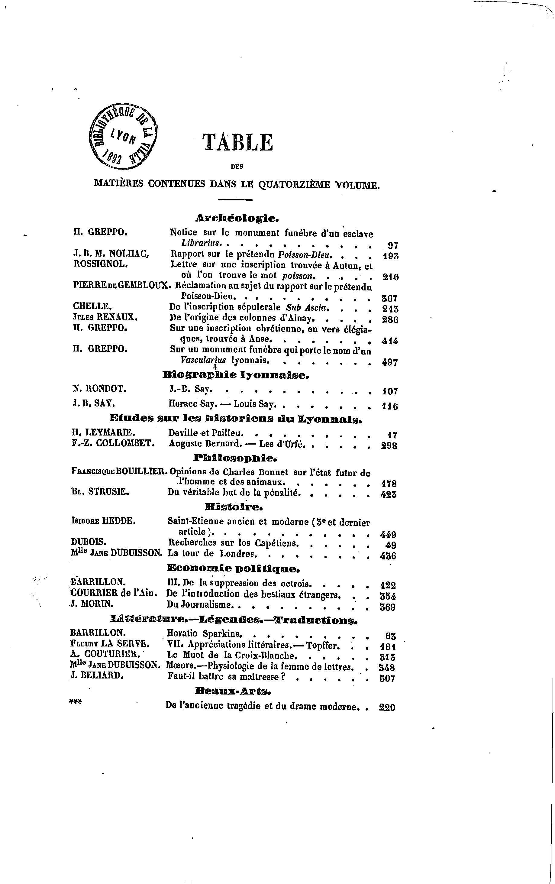 MATIÈRES CONTENUES DANS LE QUATORZIÈME VOLUME.