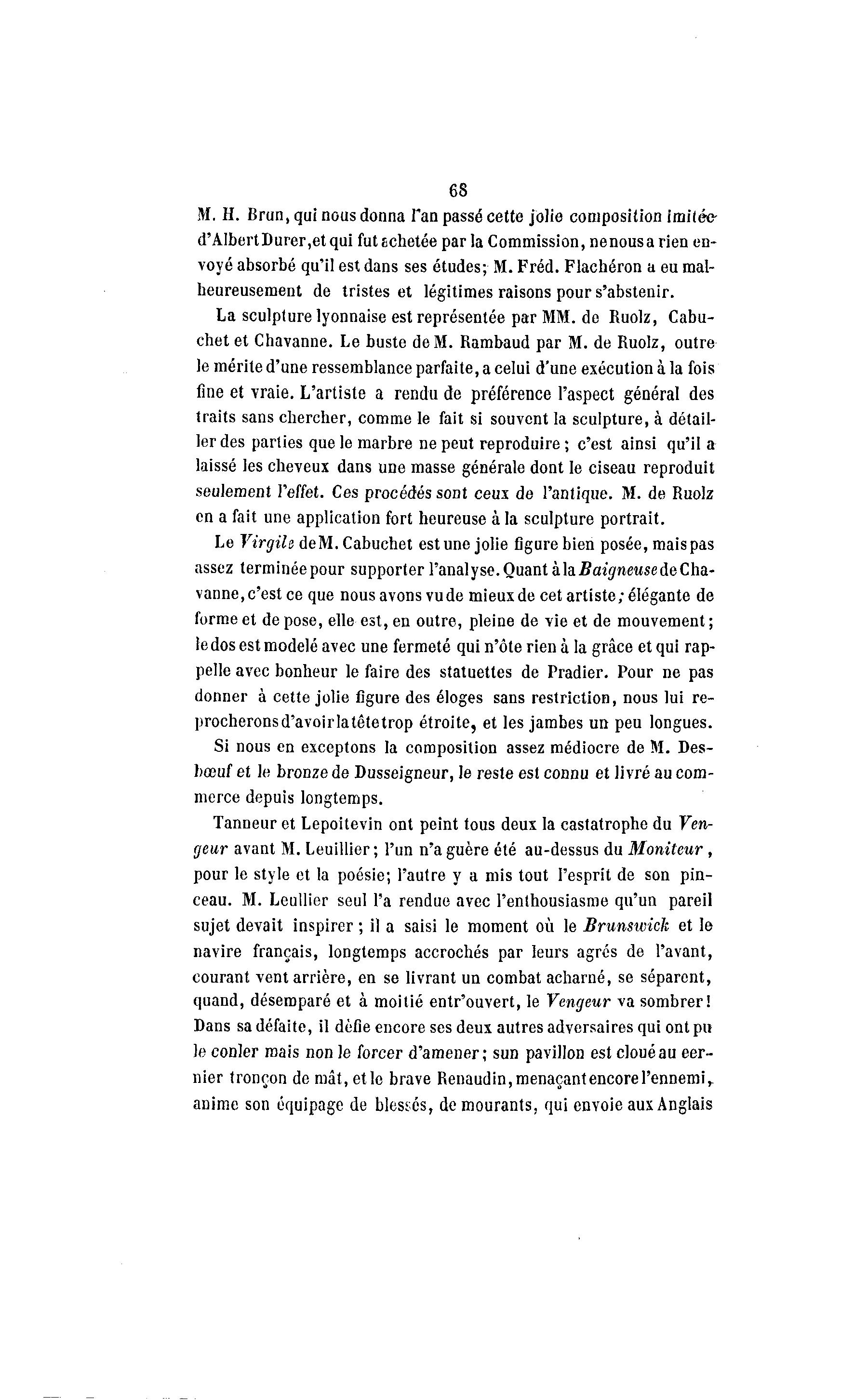 68 M. H. Brun, qui nous donna fan passé cette jolie composition imitéc- d'AIbertDurer,etqui futschetée par la Commission, nenousa rien en- voyé absorbé qu'il est dans ses études; M. Fréd. Flachéron a eu mal- heureusement de tristes et légitimes raisons pour s'abstenir. LasculpturelyonnaiseestrepresenteeparMM.de Ruolz, Cabu- chet et Chavanne. Le buste de M. Rambaud par M. de Ruolz, outre le mérite d'une ressemblance parfaite, a celui d'une exécution à la fois fine et vraie. L'artiste a rendu de préférence l'aspect général des traits sans chercher, comme le fait si souvent la sculpture, à détail- ler des parties que le marbre ne peut reproduire ; c'est ainsi qu'il a laissé les cheveux dans une masse générale dont le ciseau reproduit seulement l'effet. Ces procédés sont ceux de l'antique. M. de Ruolz en a fait une application fort heureuse à la sculpture portrait. Le Virgih de M. Cabuchet est une jolie figure bien posée, mais pas assez terminée pour supporter l'analyse. Quant à la ZJcu'jneMse de Cha- vanne, c'est ce que nous avons vu de mieux de cet artiste; élégante de forme et de pose, elle est, en outre, pleine de vie et de mouvement ; le dos est modelé avec une fermeté qui n'ôte rien à la grâce et qui rap- pelle avec bonheur le faire des statuettes de Pradier. Pour ne pas donner à cette jolie figure des éloges sans restriction, nous lui re- procherons d'avoir la tête trop étroite, et les jambes un peu longues. Si nous en exceptons la composition assez médiocre de M. Des- bœuf et le bronze de Dusseigneur, le reste est connu et livré au com- merce depuis longtemps. Tanneur et Lepoitevin ont peint tous deux la castatrophe du Ven- geur avant M. Leuillier ; l'un n'a guère été au-dessus du Moniteur, pour le style et la poésie; l'autre y a mis tout l'esprit de son pin- ceau. M. Leullier seul l'a rendue avec l'enthousiasme qu'un pareil sujet devait inspirer ; il a saisi le moment où le Brunswick et le navire français, longtemps accrochés par leurs agrès de l'avant, courant vent arrière, en se livrant un combat acharné, se séparent, quand, désemparé et à moitié entr'ouvert, le Vengeur va sombrer! Dans sa défaite, il défie encore ses deux autres adversaires qui ont pu le conler mais non le forcer d'amener; sun pavillon est cloué au eer- nier tronçon de mât, et le brave Renaudin, menaçant encore l'ennemi, anime son équipage de blessés, de mourants, qui envoie aux Anglais