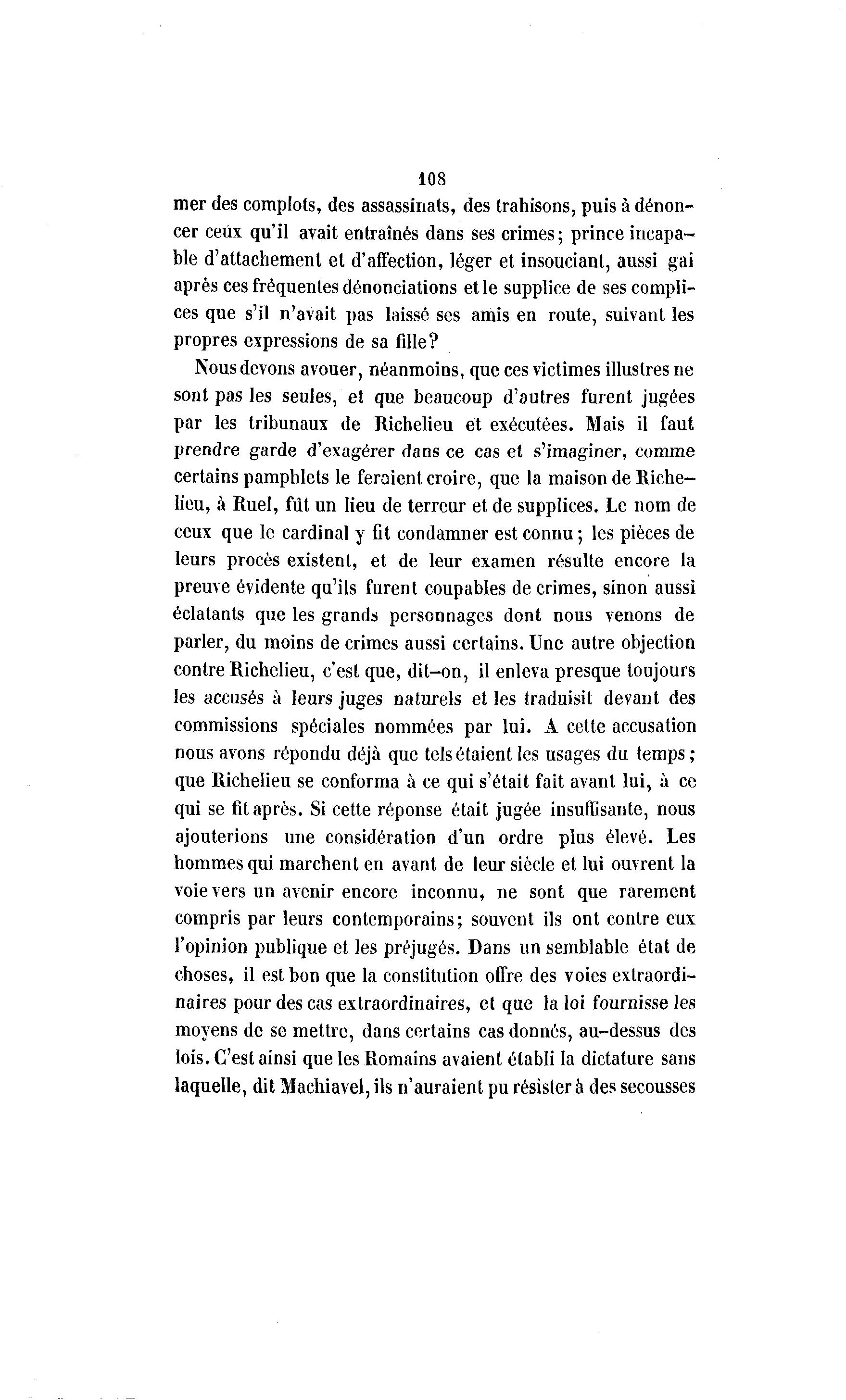 108 mer des complots, des assassinats, des trahisons, puis à dénon- cer ceux qu'il avait entraînés dans ses crimes; prince incapa- ble d'attachement et d'affection, léger et insouciant, aussi gai après ces fréquentes dénonciations et le supplice de ses compli- ces que s'il n'avait pas laissé ses amis en route, suivant les propres expressions de sa fille? Nous devons avouer, néanmoins, que ces victimes illustres ne sont pas les seules, et que beaucoup d'autres furent jugées par les tribunaux de Richelieu et exécutées. Mais il faut prendre garde d'exagérer dans ce cas et s'imaginer, comme certains pamphlets le feraient croire, que la maison de Riche- lieu, à Ruel, fut un lieu de terreur et de supplices. Le nom de ceux que le cardinal y fit condamner est connu ; les pièces de leurs procès existent, et de leur examen résulte encore la preuve évidente qu'ils furent coupables de crimes, sinon aussi éclatants que les grands personnages dont nous venons de parler, du moins de crimes aussi certains. Une autre objection contre Richelieu, c'est que, dit-on, il enleva presque toujours les accusés à leurs juges naturels et les traduisit devant des commissions spéciales nommées par lui. A cette accusation nous avons répondu déjà que tels étaient les usages du temps ; que Richelieu se conforma à ce qui s'était fait avant lui, à ce qui se fit après. Si cette réponse était jugée insuffisante, nous ajouterions une considération d'un ordre plus élevé. Les hommes qui marchent en avant de leur siècle et lui ouvrent la voie vers un avenir encore inconnu, ne sont que rarement compris par leurs contemporains; souvent ils ont contre eux l'opinion publique et les préjugés. Dans un semblable état de choses, il est bon que la constitution offre des voies extraordi- naires pour des cas extraordinaires, et que la loi fournisse les moyens de se mettre, dans certains cas donnés, au-dessus des lois. C'est ainsi que les Romains avaient établi la dictature sans laquelle, dit Machiavel, ils n'auraient pu résister à des secousses