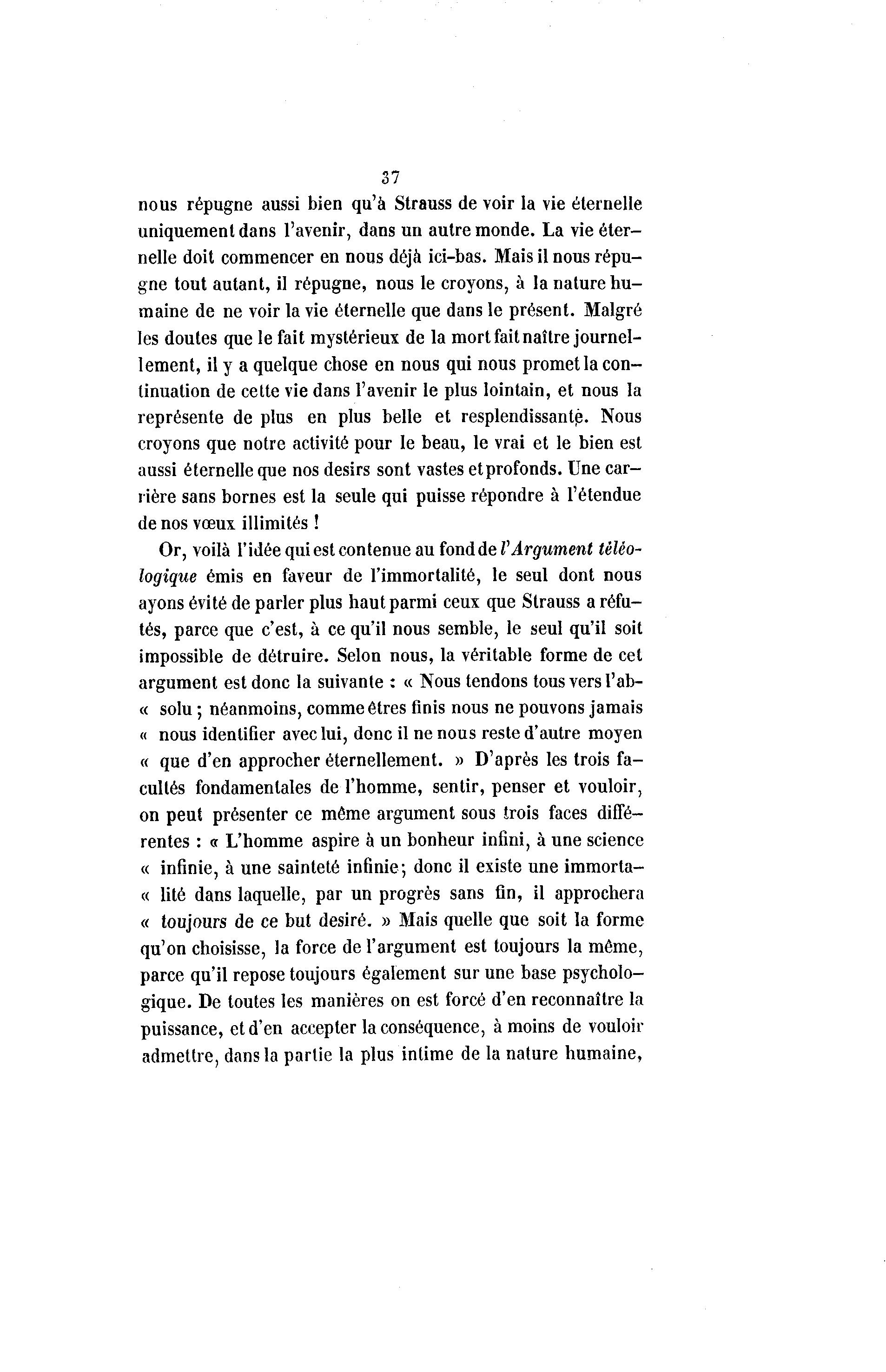37 nous répugne aussi bien qu'à Strauss de voir la vie éternelle uniquement dans l'avenir, dans un autre monde. La vie éter- nelle doit commencer en nous déjà ici-bas. Mais il nous répu- gne tout autant, il répugne, nous le croyons, à la nature hu- maine de ne voir la vie éternelle que dans le présent. Malgré les doutes que le fait mystérieux de la mort fait naître journel- lement, il y a quelque chose en nous qui nous promet la con- tinuation de cette vie dans l'avenir le plus lointain, et nous la représente de plus en plus belle et resplendissant^. Nous croyons que notre activité pour le beau, le vrai et le bien est aussi éternelle que nos désirs sont vastes et profonds. Une car- rière sans bornes est la seule qui puisse répondre à l'étendue de nos vœux illimités ! Or, voilà l'idée qui est contenue au tond de V Argument tèléo- logique émis en faveur de l'immortalité, le seul dont nous ayons évité de parler plus haut parmi ceux que Strauss a réfu- tés, parce que c'est, à ce qu'il nous semble, le seul qu'il soit impossible de détruire. Selon nous, la véritable forme de cet argument est donc la suivante : « Nous tendons tous vers l'ab- « solu ; néanmoins, comme êtres finis nous ne pouvons jamais « nous identifier avec lui, donc il ne nous reste d'autre moyen « que d'en approcher éternellement. » D'après les trois fa- cultés fondamentales de l'homme, sentir, penser et vouloir, on peut présenter ce même argument sous trois faces diffé- rentes : a L'homme aspire à un bonheur infini, à une science « infinie, à une sainteté infinie; donc il existe une immorta- « lité dans laquelle, par un progrès sans fin, il approchera « toujours de ce but désiré. » Mais quelle que soit la forme qu'on choisisse, la force de l'argument est toujours la même, parce qu'il repose toujours également sur une base psycholo- gique. De toutes les manières on est forcé d'en reconnaître la puissance, et d'en accepter la conséquence, à moins de vouloir admettre, dans la partie la plus intime de la nature humaine,