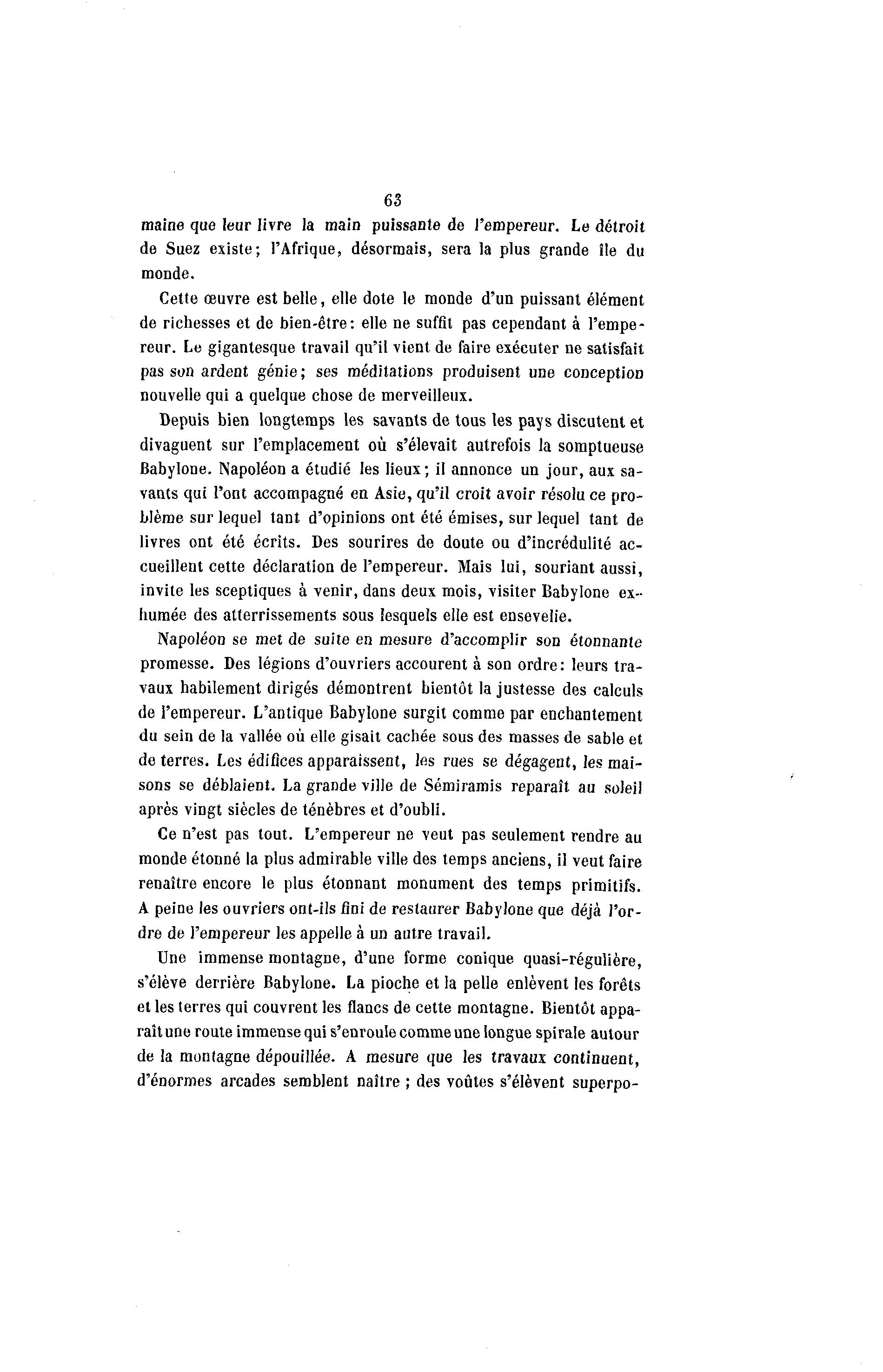 63 maine que leur livre la main puissante de l'empereur. Le détroit de Suez existe; l'Afrique, désormais, sera la plus grande île du monde. Cette œuvre est belle, elle dote le monde d'un puissant élément de richesses et de bien-être: elle ne suffît pas cependant à l'empe- reur. Le gigantesque travail qu'il vient de faire exécuter ne satisfait pas son ardent génie ; ses méditations produisent une conception nouvelle qui a quelque chose de merveilleux. Depuis bien longtemps les savants de tous les pays discutent et divaguent sur l'emplacement où s'élevait autrefois la somptueuse Babylone. Napoléon a étudié les lieux ; il annonce un jour, aux sa- vants qui l'ont accompagné en Asie, qu'il croit avoir résolu ce pro- blème sur lequel tant d'opinions ont été émises, sur lequel tant de livres ont été écrits. Des sourires de doute ou d'incrédulité ac- cueillent cette déclaration de l'empereur. Mais lui, souriant aussi, invite les sceptiques à venir, dans deux mois, visiter Babylone ex- humée des atterrissements sous lesquels elle est ensevelie. Napoléon se met de suite en mesure d'accomplir son étonnante promesse. Des légions d'ouvriers accourent à son ordre: leurs tra- vaux habilement dirigés démontrent bientôt la justesse des calculs de l'empereur. L'antique Babylone surgit comme par enchantement du sein de la vallée où elle gisait cachée sous des masses de sable et de terres. Les édifices apparaissent, les rues se dégagent, les mai- sons se déblaient. La grande ville de Sémiramis reparaît au soleil après vingt siècles de ténèbres et d'oubli. Ce n'est pas tout. L'empereur ne veut pas seulement rendre au monde étonné la plus admirable ville des temps anciens, il veut faire renaître encore le plus étonnant monument des temps primitifs. A peine les ouvriers ont-ils fini de restaurer Babylone que déjà l'or- dre de l'empereur les appelle à un autre travail. Une immense montagne, d'une forme conique quasi-régulière, s'élève derrière Babylone. La pioche et la pelle enlèvent les forêts et les terres qui couvrent les flancs de cette montagne. Bientôt appa- raît une route immense qui s'enroule comme une longue spirale autour de la montagne dépouillée. A mesure que les travaux continuent, d'énormes arcades semblent naître ; des voûtes s'élèvent superpo-