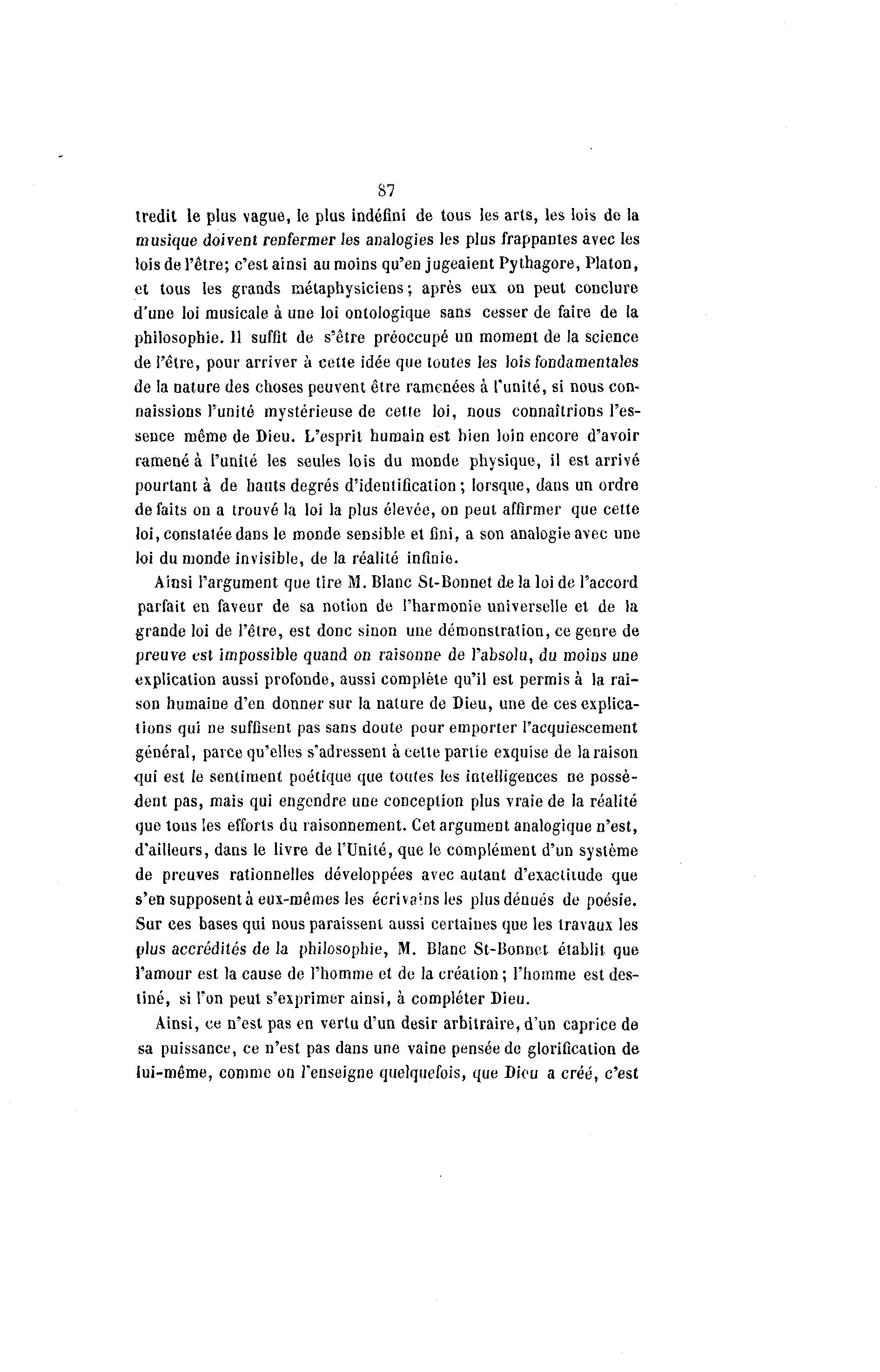 87 tredit le plus vague, le plus indéfini de tous les arts, les lois de la musique doivent renfermer les analogies les plus frappantes avec les lois de l'être; c'est ainsi au moins qu'en jugeaient Pythagore, Platon, et tous les grands métaphysiciens; après eux on peut conclure d'une loi musicale à une loi ontologique sans cesser de faire de la philosophie. 11 suffit de s'être préoccupé un moment de la science de l'être, pour arriver à cette idée que toutes les lois fondamentales de la nature des choses peuvent être ramenées à l'unité, si nous con- naissions l'unité mystérieuse de cette loi, nous connaîtrions l'es- sence même de Dieu. L'esprit humain est hien loin encore d'avoir ramené à l'unité les seules lois du monde physique, il est arrivé pourtant à de hauts degrés d'identification; lorsque, dans un ordre de faits on a trouvé la loi la plus élevée, on peut affirmer que cette ioi.conslaleedansle monde sensible et fini, a son analogie avec une loi du monde invisible, de la réalité infinie. Ainsi l'argument que tire M. Blanc St-Bonnet de la loi de l'accord parfait en faveur de sa notion de l'harmonie universelle et de la grande loi de l'être, est donc sinon une démonstration, ce genre de preuve est impossible quand on raisonne de l'absolu, du moins une explication aussi profonde, aussi complète qu'il est permis à la rai- son humaine d'en donner sur la nature de Dieu, une de ces explica- tions qui ne suffisent pas sans doute pour emporter l'acquiescement général, parce qu'elles s'adressent à cette partie exquise de la raison qui est le sentiment poétique que toutes les intelligences ne possè- dent pas, mais qui engendre une conception plus vraie de la réalité que tous les efforts du raisonnement. Cet argument analogique n'est, d'ailleurs, dans le livre de l'Unité, que le complément d'un système de preuves rationnelles développées avec autant d'exactitude que s'en supposent à eux-mêmes les écrivais les plus dénués de poésie. Sur ces bases qui nous paraissent aussi certaines que les travaux les plus accrédités de la philosophie, M. Blanc St-Bonnet établit que l'amour est la cause de l'homme et de la création ; l'homme est des- tiné, si l'on peut s'exprimer ainsi, à compléter Dieu. Ainsi, ce n'est pas en vertu d'un désir arbitraire, d'un caprice de sa puissance, ce n'est pas dans une vaine pensée de glorification de lui-même, comme on l'enseigne quelquefois, que Dieu a créé, c'est