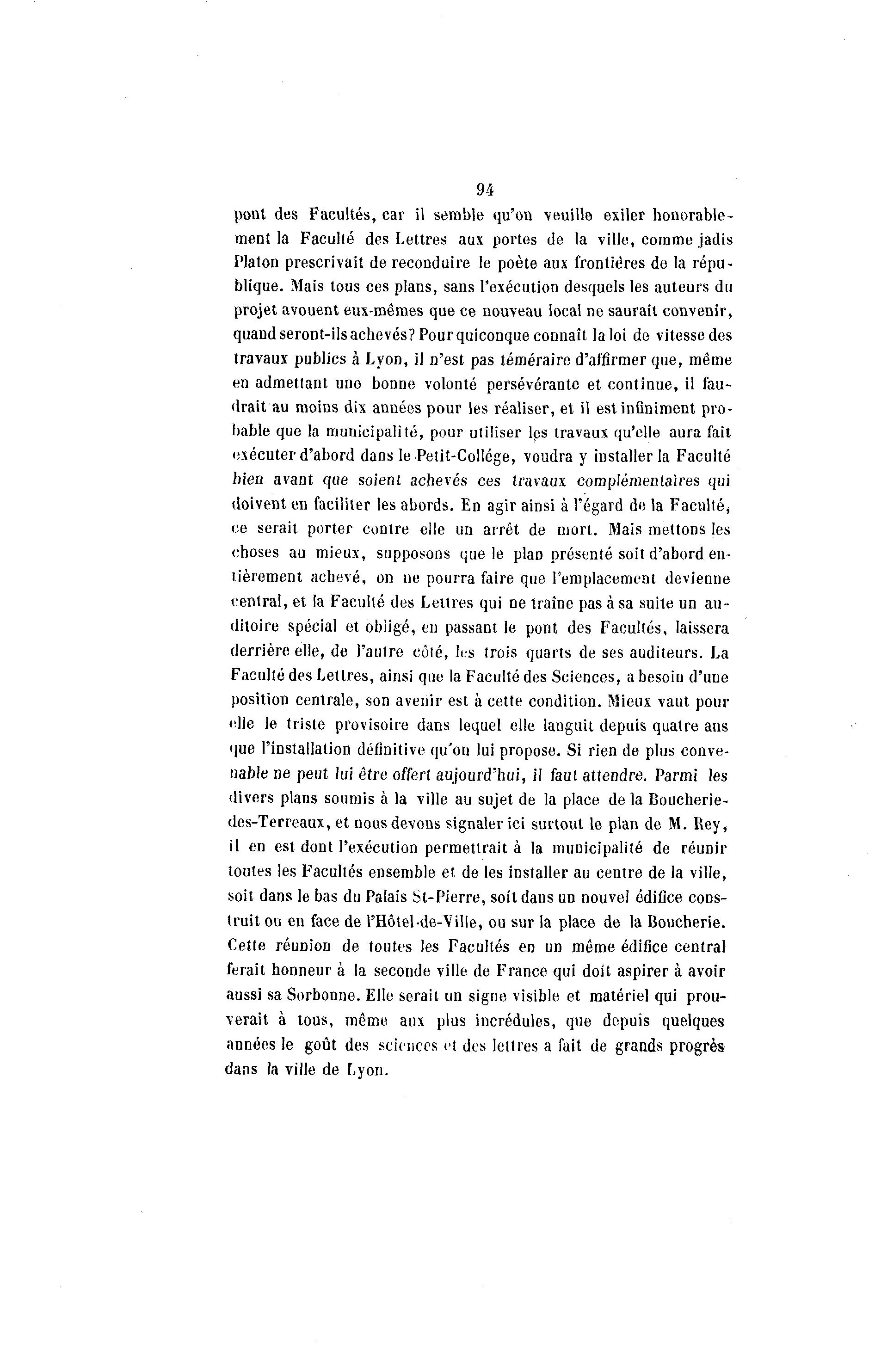 94 pont des Facultés, car il semble qu'on veuille exiler honorable- ment la Faculté des Lettres aux portes de la ville, comme jadis Platon prescrivait de reconduire le poète aux frontières de la répu- blique. Mais tous ces plans, sans l'exécution desquels les auteurs du projet avouent eux-mêmes que ce nouveau local ne saurait convenir, quand seront-ilsachevés?Pourquiconque connaît la loi de vitesse des travaux publics à Lyon, il n'est pas téméraire d'affirmer que, même en admettant une bonne volonté persévérante et continue, il fau- drait au moins dix années pour les réaliser, et il est infiniment pro- bable que la municipalité, pour utiliser les travaux qu'elle aura fait exécuter d'abord dans le Petit-Collège, voudra y installer la Faculté bien avant que soient achevés ces travaux complémentaires qui doivent en faciliter les abords. En agir ainsi à l'égard de la Faculté, ce serait porter contre elle un arrêt de mort. Mais mettons les choses au mieux, supposons que le plaD présenté soit d'abord en- tièrement achevé, on ne pourra faire que l'emplacement devienne central, et la Faculté des Lettres qui ne traîne pas à sa suite un au- ditoire spécial et obligé, en passant le pont des Facultés, laissera derrière elle, de l'autre côté, les trois quarts de ses auditeurs. La Faculté des Lettres, ainsi que la Faculté des Sciences, a besoin d'une position centrale, son avenir est à cette condition. Mieux vaut pour elle le triste provisoire dans lequel elle languit depuis quatre ans que l'installation définitive qu'on lui propose. Si rien de plus conve- nable ne peut lui être offert aujourd'hui, il faut attendre. Parmi les divers plans soumis à la ville au sujet de la place de la Boucherie- des-Terreaux, et nous devons signaler ici surtout le plan de M. Rey, il en est dont l'exécution permettrait à la municipalité de réunir toutes les Facultés ensemble et de les installer au centre de la ville, soit dans le bas du Palais St-Pierre, soit dans un nouvel édifice cons- truit ou en face de l'Hôtel-de-Ville, ou sur la place de la Boucherie. Cette réunion de toutes les Facultés en un même édifice central ferait honneur à la seconde ville de France qui doit aspirer à avoir aussi sa Sorbonne. Elle serait un signe visible et matériel qui prou- verait à tous, même aux plus incrédules, que depuis quelques années le goût des sciences et des lettres a fait de grands progrès dans la ville de Lyon.