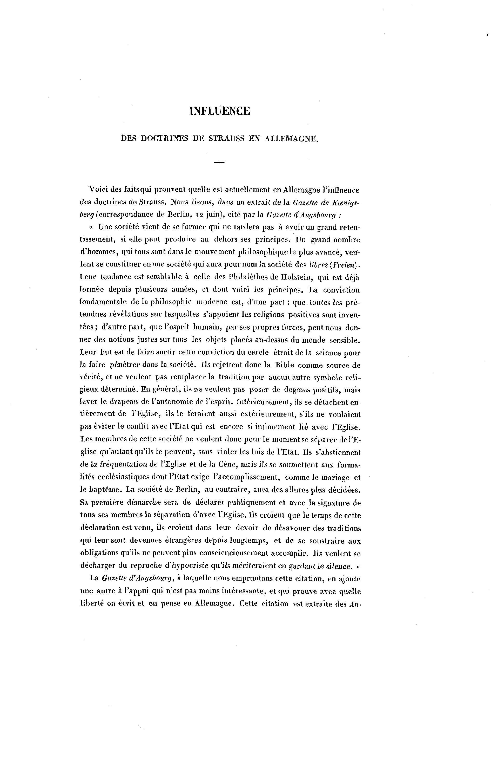 des doctrines de Strauss. Nous lisons, dans un extrait de la Gazelle de Kœnirjs-