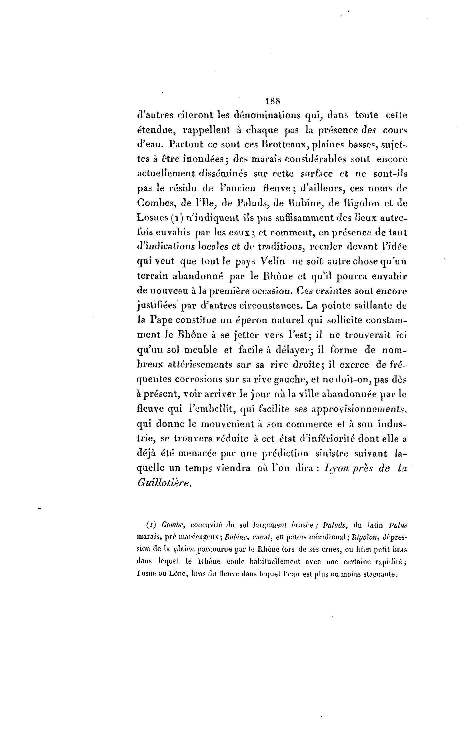 188 d'autres citeront les dénominations qui,, dans toute cette étendue, rappellent à chaque pas la présence des cours d'eau. Partout ce sont ces Brotteaux, plaines basses, sujet- tes à être inondées5 des marais considérables sont encore actuellement disséminés sur cette surface et ne sont-ils pas le résidu de l'ancien fleuve ; d'ailleurs, ces noms de Combes, de l'Ile, de Paluds, de Rubine, de Rigolon et de Losnes (1) n'indiquent-ils pas suffisamment des lieux autre- fois envahis par les eaux ; et comment, en présence de tant d'indications locales et de traditions, reculer devant l'idée qui veut que tout le pays Velin ne soit autre chose qu'un terrain abandonné par le Rhône et qu'il pourra envahir de nouveau à la première occasion. Ces craintes sont encore justifiées par d'autres circonstances. La pointe saillante de la Pape constitue un éperon naturel qui sollicite constam- ment le Rhône à se jetter vers l'est; il ne trouverait ici qu'un sol meuble et facile à délayer; il forme de nom- breux attériesements sur sa rive droite; il exerce de fré- quentes corrosions sur sa rive gauche, et ne doit-on, pas dès à présent, voir arriver le jour où la ville abandonnée par le fleuve qui l'embellit, qui facilite ses approvisionnements, qui donne le mouvement à son commerce et à son indus- trie, se trouvera réduite à cet état d'infériorité dont elle a déjà été menacée par une prédiction sinistre suivant la- quelle un temps viendra où l'on dira : Lyon près de la Guïllotiere. (1) Combe, concavité du sol largement évasée; Paluds, du latin Palus marais, pré marécageux; liubine, canal, en patois méridional; Rigolon, dépres- sion de la plaine parcourue par le Rhôue lors de ses crues, ou bien petit bras dans lequel le Rhône coule habituellement avec une certaine rapidité ; Losne ou Lône, bras du fleuve dans lequel l'eau est plus ou moins stagnante.
