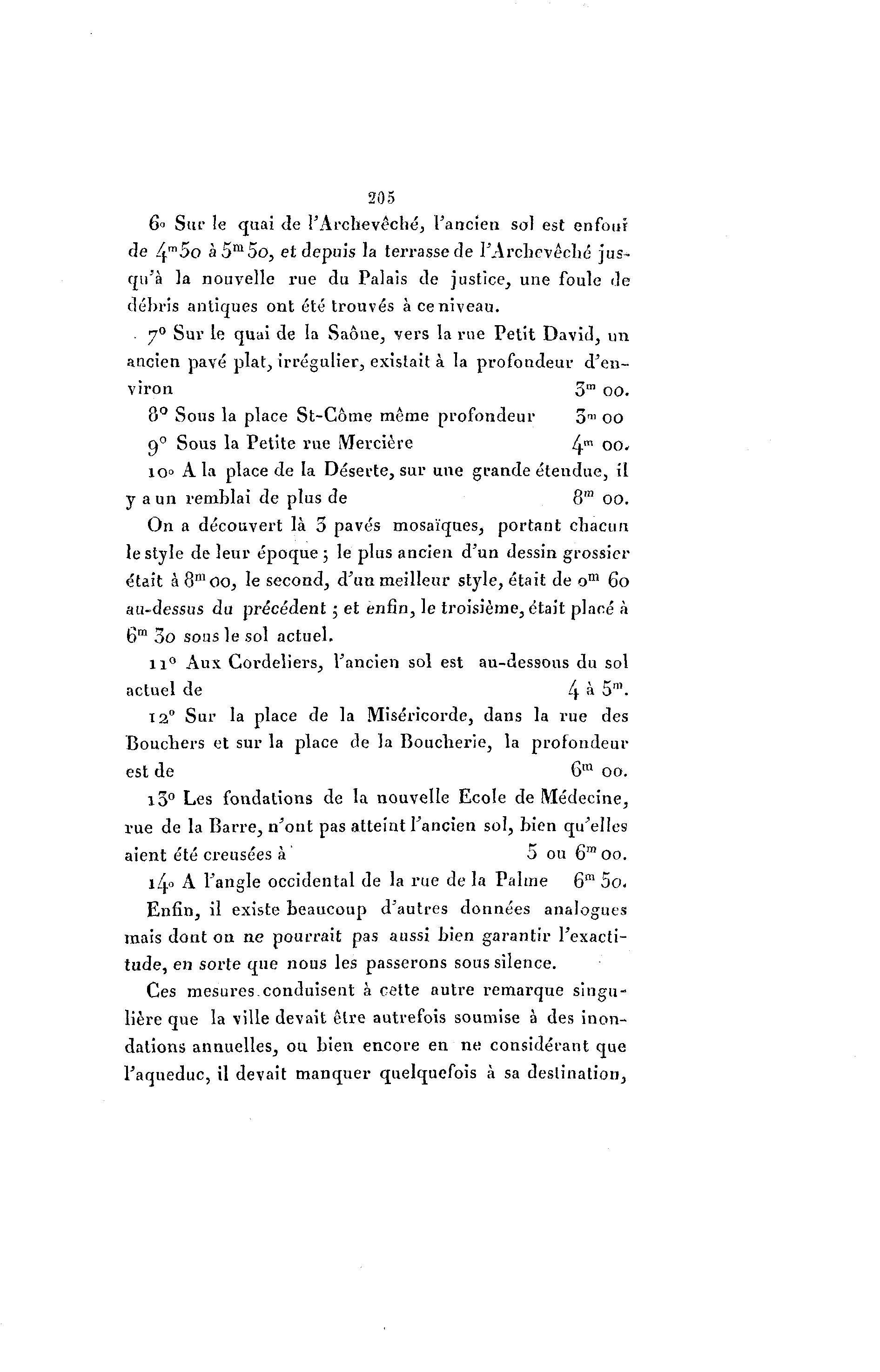 205 6° S u r le quai de l'Archevêché, l'ancien sol est enfoui de 4 m 5 o à 5 m 5 o , et depuis la terrasse de l'Archevêché jus- qu'à la nouvelle r u e du Palais de justice, une foule d e débris antiques ont été trouvés à ce niveau. 7° S u r le quai de la Saône, vers la rue Petit David, u n ancien pavé plat, irrégulier, existait à la profondeur d'en- viron 3™ 0 0 . 8 ° Sous la place S t - C ô m e même profondeur 5m 00 g0 Sous la Petite rue Mercière 4m 00. 10° A la place de la Déserte, sur une grande étendue, il y a un remblai de plus de 8m 00. O n a découvert là 5 pavés mosaïques, p o r t a n t chacun le style de leur époque 5 le plus ancien d'un dessin grossier était à 8 m O O , le second, d'un meilleur style, était de o m 6 0 au-dessus du précédent ; et enfin, le troisième, était placé à 6 m 3 o sous le sol actuel. i l 0 Aux Gordeliers, l'ancien sol est au-dessous du sol actuel de 4 à 5n\ 12° S u r la place de la Miséricorde, dans la rue des Bouchers et sur la place de la Boucherie, la profondeur est de 6 m 00. i 3 ° Les fondations de la nouvelle Ecole de Médecine, r u e de la B a r r e , n ' o n t pas atteint l'ancien sol, bien qu'elles aient été creusées à 5 ou 6 m O o . i4° A l'angle occidental de la r u e de la Palme 6 m 5o< Enfin, il existe beaucoup d'autres données analogues mais dont on n e pourrait pas aussi bien garantir l'exacti- t u d e , en sorte que nous les passerons sous silence. Ces mesures,conduisent à cette autre r e m a r q u e singu- lière que la ville devait être autrefois soumise à des i n o n - dations annuelles, ou bien encore en n e considérant que l'aqueduc, il devait m a n q u e r quelquefois à sa destination,
