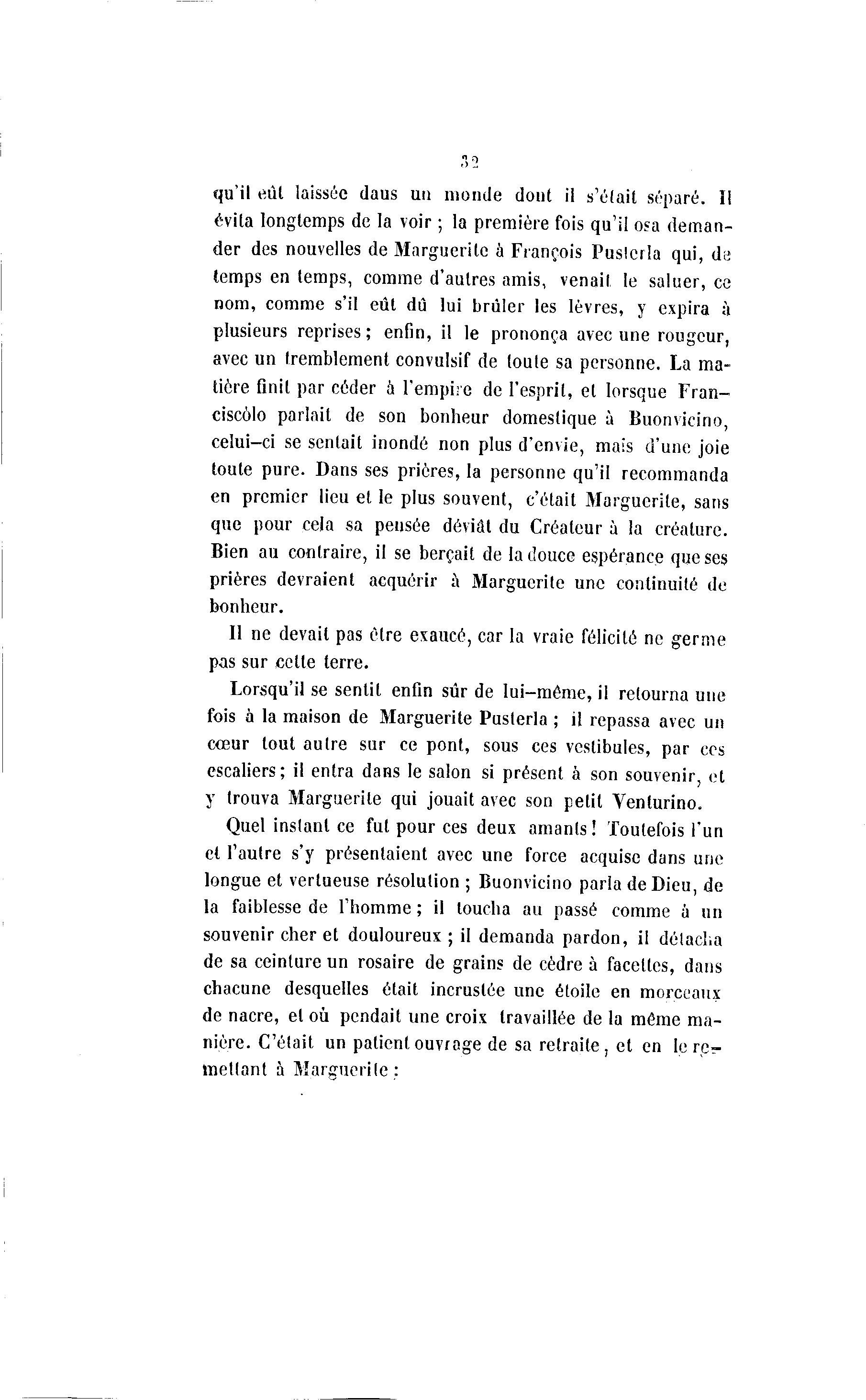 qu'il eut laissée daus un monde dont il s'était séparé. ïl évita longtemps de la voir ; la première fois qu'il osa deman- der des nouvelles de Marguerite à François Puslcrla qui, de temps en temps, comme d'autres amis, venait le saluer, ce nom, comme s'il eût dû lui brûler les lèvres, y expira à plusieurs reprises; enfin, il le prononça avec une rougeur, avec un tremblement convulsif de toute sa personne. La ma- tière finit par céder à l'empire de l'esprit, et lorsque Fran- ciscôlo parlait de son bonheur domestique à Buonvicino, celui-ci se sentait inondé non plus d'envie, mais d'une joie toute pure. Dans ses prières, la personne qu'il recommanda en premier lieu et le plus souvent, c'était Marguerite, sans que pour cela sa pensée déviât du Créateur à la créature. Bien au contraire, il se berçait de la douce espérance que ses prières devraient acquérir à Marguerite une continuité de bonheur. Il ne devait pas être exaucé, car la vraie félicité ne germe pas sur cette terre. Lorsqu'il se sentit enfin sûr de lui-même, il retourna une fois à la maison de Marguerite Pusterla ; il repassa avec un cœur tout autre sur ce pont, sous ces vestibules, par ces escaliers; il entra dans le salon si présent à son souvenir, et y trouva Marguerite qui jouait avec son petit Venlurino. Quel instant ce fut pour ces deux amants! Toutefois l'un et l'autre s'y présentaient avec une force acquise dans une longue et vertueuse résolution ; Buonvicino parla de Dieu, de la faiblesse de l'homme ; il loucha au passé comme à un souvenir cher et douloureux ; il demanda pardon, il délacha de sa ceinture un rosaire de grains de cèdre à facettes, dans chacune desquelles était incrustée une étoile en morceaux de nacre, et où pendait une croix travaillée de la môme ma- nière. C'était un patient ouvrage de sa retraite, et en le r e - mettant à Marguerite :