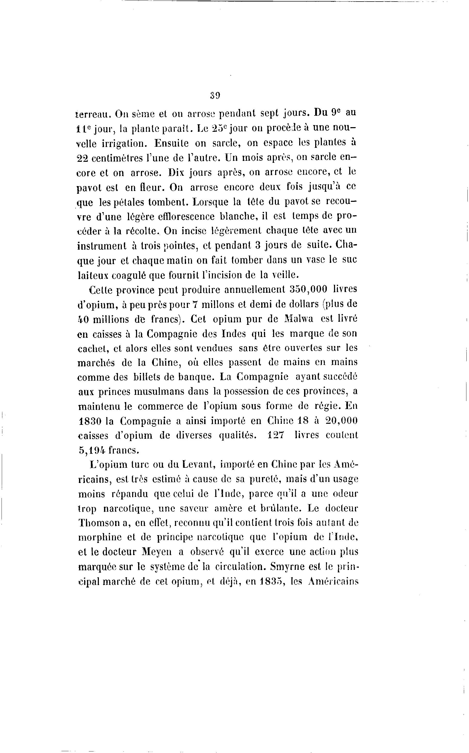 39 terreau. On sème et on arrose pendant sept jours. Du 9 e au 11 e jour, la plante parait. Le 25 e jour on procède à une nou- velle irrigation. Ensuite on sarcle, on espace les plantes à 22 centimètres l'une de l'autre. Un mois après, on sarcle en- core et on arrose. Dix jours après, on arrose encore, et le pavot est en fleur. On arrose encore deux fois jusqu'à ce que les pétales tombent. Lorsque la tête du pavot se recou- vre d'une légère efflorescence blanche, il est temps de pro- céder à la récolte. On incise légèrement chaque tête avec un instrument à trois pointes, et pendant 3 jours de suite. Cha- que jour et chaque matin on fait tomber dans un vase le suc laiteux coagulé que fournit l'incision de la veille. Cette province peut produire annuellement 350,000 livres d'opium, a peu près pour 7 millons et demi de dollars (plus de 40 millions de francs). Cet opium pur de Mulwa est livré en caisses à la Compagnie des Indes qui les marque de son cachet, et alors elles sont vendues sans être ouvertes sur les marchés de la Chine, où elles passent de mains en mains comme des billets de banque. La Compagnie ayant succédé aux princes musulmans dans la possession de ces provinces, a maintenu le commerce de l'opium sous forme de régie. En 1830 la Compagnie a ainsi importé en Chine 18 à 20,000 caisses d'opium de diverses qualités. 127 livres coulent 5,194 francs. L'opium turc ou du Levant, importé en Chine par les Amé- ricains, est très estimé à cause de sa pureté, mais d'un usage moins répandu que celui de l'Inde, parce qu'il a une odeur Irop narcotique, une saveur amère et brûlante. Le docteur Thomson a, en effet, reconnu qu'il contient trois fois aulant de morphine et de principe narcotique que l'opium de l'Inde, et le docteur Meyen a observé qu'il exerce une action plus marquée sur le système de la circulation. Smyrne est le prin- cipal marché de cet opium, et déjà , en 1835, les Américains