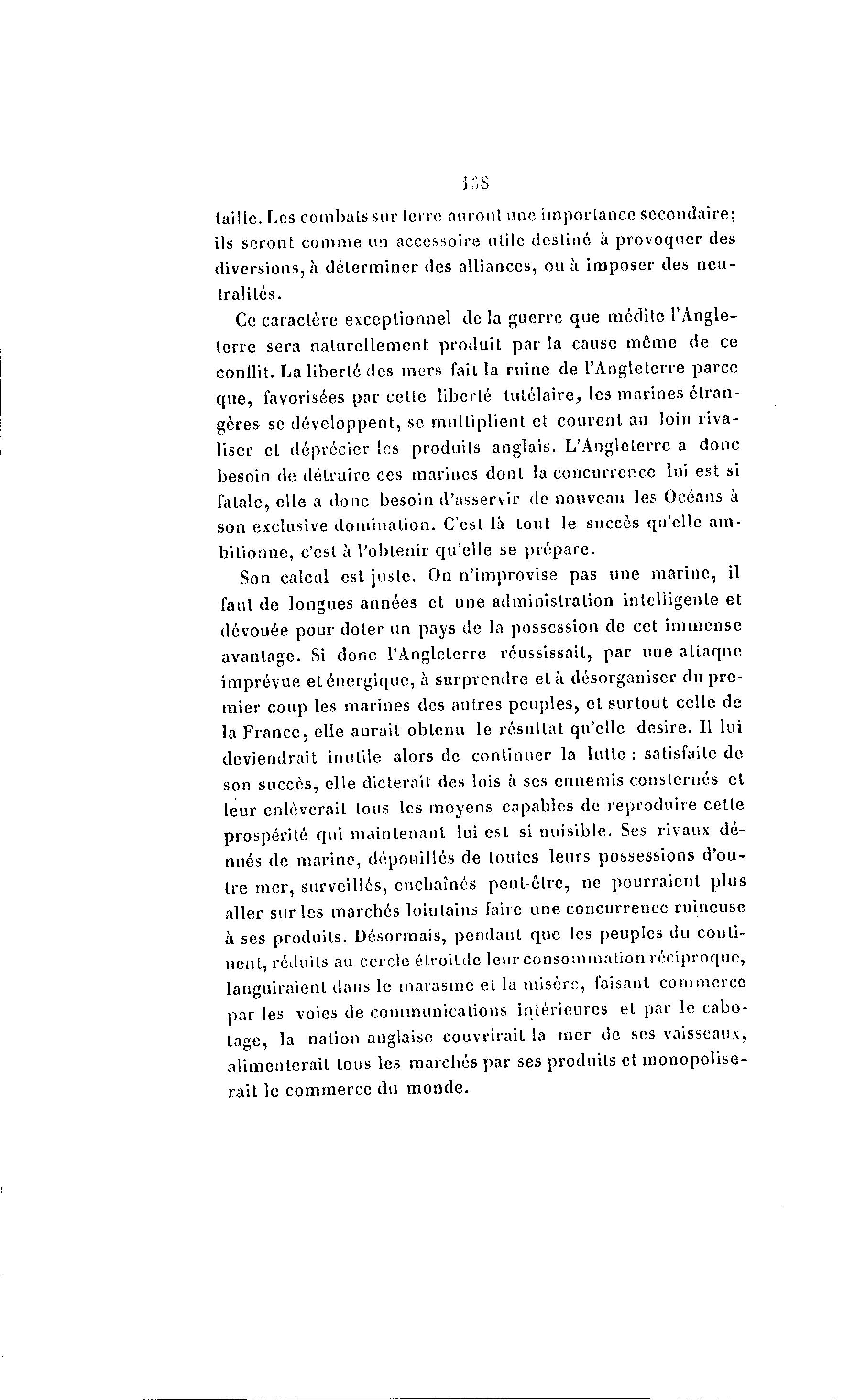 ISS (aille. Les combats sur terre auront une importance secondaire; ils seront comme un accessoire utile destiné à provoquer des diversions, à déterminer des alliances, ou à imposer des neu- tralités. Ce caractère exceptionnel de la guerre que médite l'Angle- terre sera naturellement produit par la cause même de ce conflit. La liberté des mers fait la ruine de l'Angleterre parce que, favorisées par celle liberlé lulélaire, les marines étran- gères se développent, se multiplient et courent au loin riva- liser et déprécier les produits anglais. L'Anglelerre a donc besoin de détruire ces marines donl la concurrence lui est si fatale, elle a donc besoin d'asservir de nouveau les Océans à son exclusive domination. C'est là tout le succès qu'elle am- bitionne, c'est à l'obtenir qu'elle se prépare. Son calcul est juste. On n'improvise pas une marine, il faut de longues années et une administration intelligente et dévouée pour doter un pays de la possession de cet immense avantage. Si donc l'Angleterre réussissait, par une allaque imprévue et énergique, à surprendre et à désorganiser du pre- mier coup les marines des autres peuples, et surtout celle de la France, elle aurait obtenu le résultat qu'elle désire. Il lui deviendrait inutile alors de continuer la lutte : satisfaite de son succès, elle dicterait des lois à ses ennemis consternés et leur enlèverait tous les moyens capables de reproduire celte prospérité qui maintenant lui est si nuisible. Ses rivaux dé- nués de marine, dépouillés de toutes leurs possessions d'ou- tre mer, surveilles, enchaînés peut-être, ne pourraient plus aller sur les marchés lointains faire une concurrence ruineuse à ses produits. Désormais, pendant que les peuples du conti- nent, réduits au cercle élroilde leur consommation réciproque, languiraient dans le marasme el la misère, faisant commerce par les voies de communications intérieures el par le cabo- tage, la nation anglaise couvrirait la mer de ses vaisseaux, alimenterait tous les marchés par ses produils et monopolise- rait le commerce du monde.