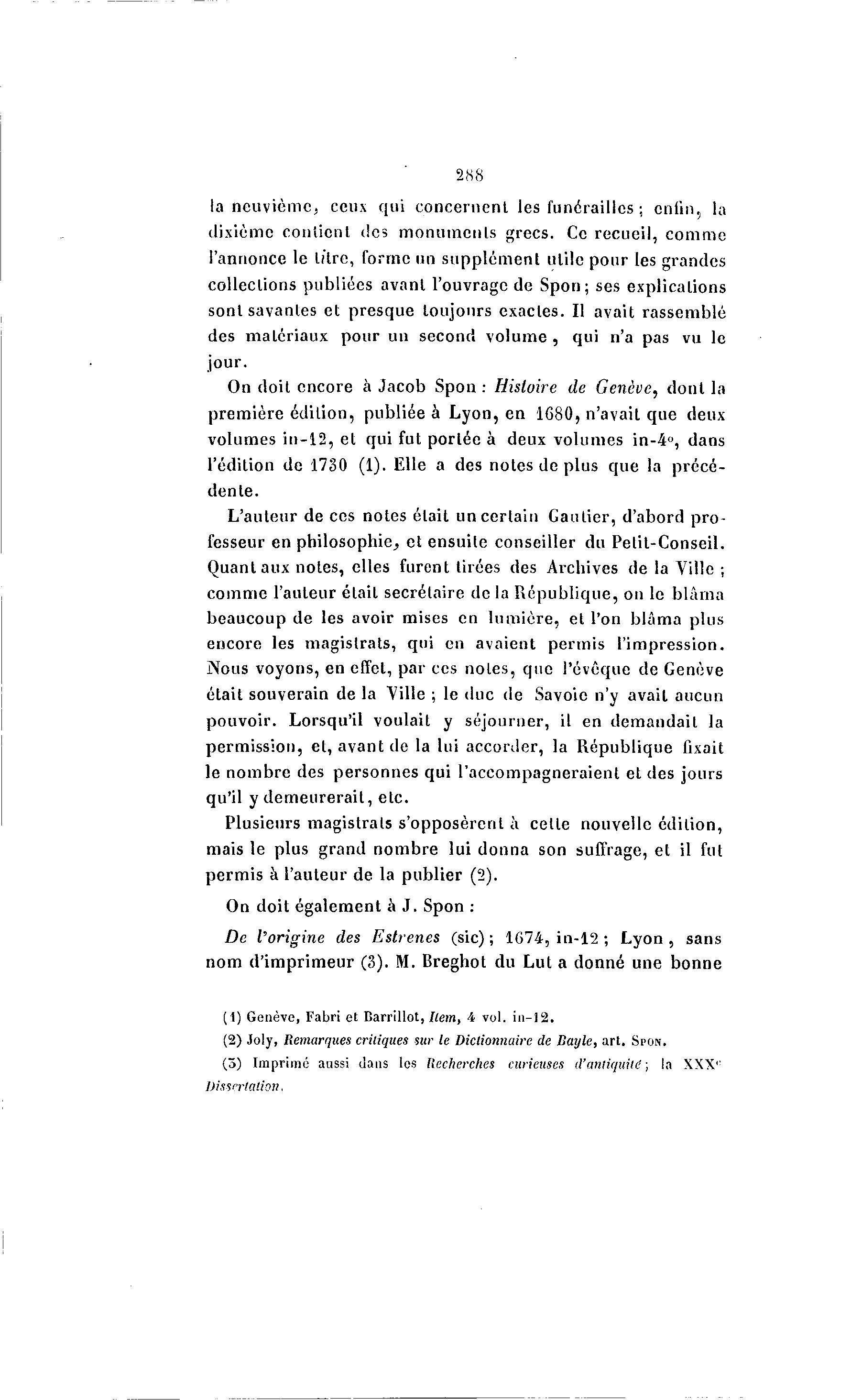288 la neuvième, ceux qui concernent les funérailles ; enfin, la dixième contient des monuments grecs. Ce recueil, comme l'annonce le litre, forme un supplément utile pour les grandes collections publiées avant l'ouvrage de Spon; ses explications sont savantes et presque toujours exactes. Il avait rassemblé des matériaux pour un second volume , qui n'a pas vu le jour. On doit encore à Jacob Spon : Histoire de Genève, dont la première édition, publiée à Lyon, en 1680, n'avait que deux volumes in-12, et qui fut portée à deux volumes in-4°, dans l'édition de 1730 (1). Elle a des notes de plus que la précé- dente. L'auteur de ces notes était un certain Gautier, d'abord pro- fesseur en philosophie^ et ensuite conseiller du Petit-Conseil. Quant aux notes, elles furent tirées des Archives de la Ville ; comme l'auteur était secrétaire de la République, on le blâma beaucoup de les avoir mises en lumière, et l'on blâma plus encore les magistrats, qui en avaient permis l'impression. Nous voyons, en effet, par ces noies, que l'évoque de Genève était souverain de la Ville ; le duc de Savoie n'y avait aucun pouvoir. Lorsqu'il voulait y séjourner, il en demandait la permission, et, avant de la lui accorder, la République fixait le nombre des personnes qui l'accompagneraient et des jours qu'il y demeurerait, etc. Plusieurs magistrats s'opposèrent à celle nouvelle édilion, mais le plus grand nombre lui donna son suffrage, et il fut permis à l'auteur de la publier (2). On doit également à J. Spon : De l'origine des Estrenes (sic); 1674, in-12 ; L y o n , sans nom d'imprimeur (3). M. Breghot du Lut a donné une bonne (1) Genève, Fabri et Barrillot, Hem, 4 vol. in-12. (2) Joly, Remarques critiques sur le Dictionnaire de Bayle, art. SPON. (5) Imprimé aussi dans les Recherches curieuses d'antiquité ; la XXX': Dissertation.