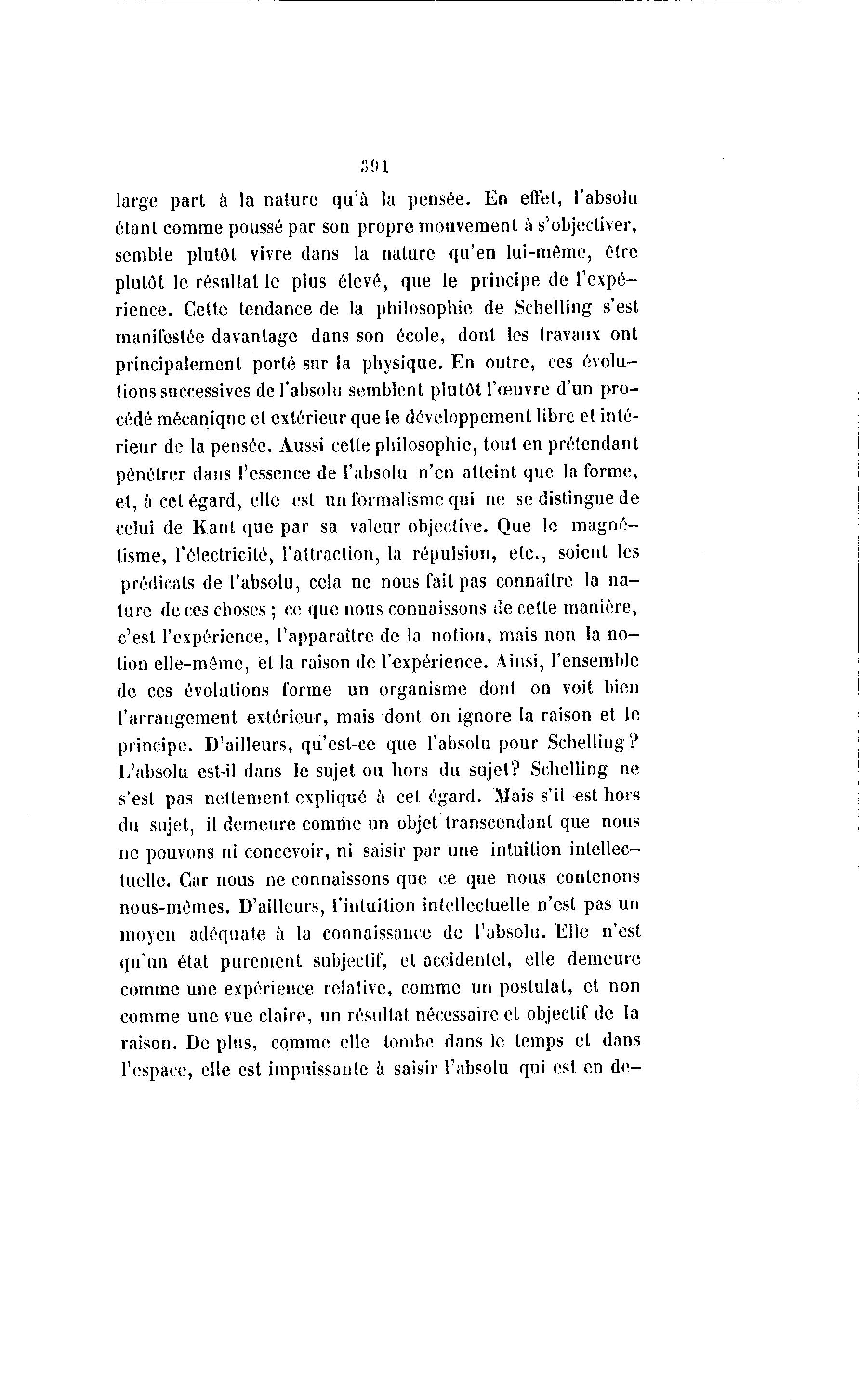 301 large part à la nature qu'à la pensée. En effet, l'absolu étant comme poussé par son propre mouvement à s'objectiver, semble plutôt vivre dans la nature qu'en lui-même, être plutôt le résultat le plus élevé, que le principe de l'expé- rience. Cette tendance de la philosophie de Schelling s'est manifestée davantage dans son école, dont les travaux ont principalement porté sur la physique. En outre, ces évolu- tions successives de l'absolu semblent plutôt l'œuvre d'un pro- cédé mécaniqne et extérieur que le développement libre et inté- rieur de la pensée. Aussi cette philosophie, tout en prétendant pénétrer dans l'essence de l'absolu n'en atteint que la forme, et, à cel égard, elle est un formalisme qui ne se distingue de celui de Kant que par sa valeur objective. Que le magné- tisme, l'électricité, l'attraction, la répulsion, etc., soient les prédicats de l'absolu, cela ne nous fait pas connaître la na- ture de ces choses ; ce que nous connaissons de celte manière, c'est l'expérience, l'apparaître de la notion, mais non la n o - tion elle-même, et la raison de l'expérience. Ainsi, l'ensemble de ces évolutions forme un organisme dont on voit bien l'arrangement extérieur, mais dont on ignore la raison et le principe. D'ailleurs, qu'est-ce que l'absolu pour Schelling? L'absolu est-il dans le sujet ou hors du sujet? Schelling ne s'est pas nettement expliqué à cel égard. Mais s'il est hors du sujet, il demeure comme un objet transcendant que nous ne pouvons ni concevoir, ni saisir par une intuition intellec- tuelle. Car nous ne connaissons que ce que nous contenons nous-mêmes. D'ailleurs, l'intuition intellectuelle n'est pas un moyen adéquate a la connaissance de l'absolu. Elle n'est qu'un état purement subjectif, et accidentel, elle demeure comme une expérience relative, comme un postulat, et non comme une vue claire, un résultat nécessaire et objectif de la raison. De plus, comme elle tombe dans le temps et dans l'espace, elle est impuissante à saisir l'absolu qui est en do-