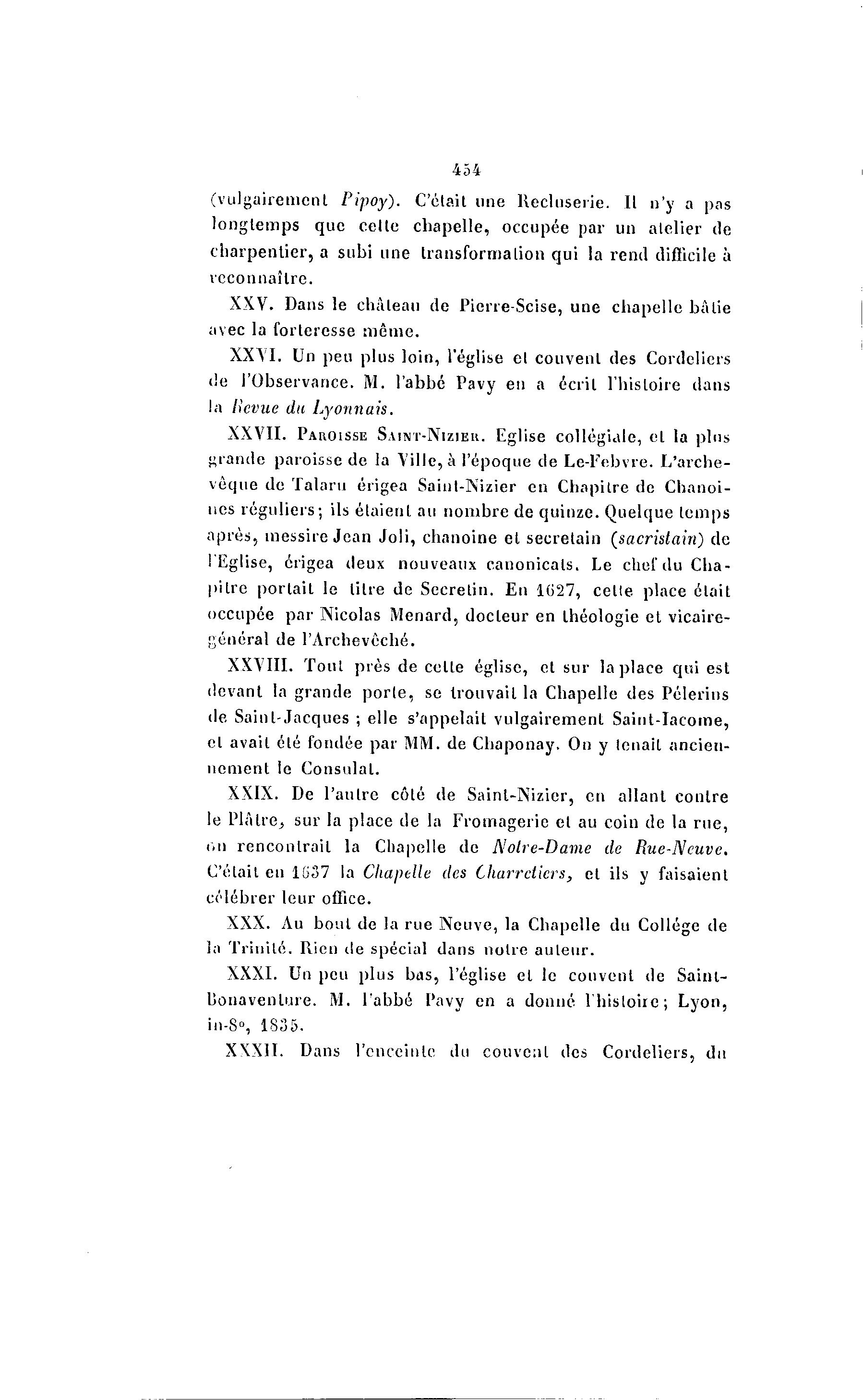 454 (vulgairement Pipoy). C'était une Recluserie. Il n'y a pas longtemps que celle chapelle, occupée par un atelier de charpentier, a subi une transforma lion qui la rend difficile à reconnaître. XXV. Dans le château de Pierre-Scise, une chapelle bâtie avec la forteresse même. XXYI. Un peu plus loin, l'église el couvent des Cordelicrs de l'Observance. M. l'abbé Pavy en a écrit l'histoire dans la lievue du Lyonnais. XXVII. PAROISSE SAINT-NIZIEU. Eglise collégiale, el la plus grande paroisse de la Ville, à l'époque de Le-Febvre. L'arche- vêque de Talaru érigea Sainl-Nizier en Chapitre de Chanoi- nes réguliers; ils étaient au nombre de quinze. Quelque lemps après, inessire Jean Joli, chanoine et secretain (sacristain) de lEglise, érigea deux nouveaux canonicals. Le chef du Cha- pitre portail le titre de Secrelin. En 1G27, celle place élait occupée par Nicolas Menard, docteur en théologie et vicaire- général de l'Archevêché. XXVIII. ï o u l près de celle église, et sur la place qui est devant la grande porle, se trouvait la Chapelle des Pèlerins de Saint-Jacques ; elle s'appelait vulgairement Saiut-Iacome, el avait élé fondée par MM. de Chaponay, On y lenail ancien- nement le Consulat. XXIX. De l'autre côlé de Sainl-Nizier, en allant contre le Plâtre., sur la place de la Fromagerie et au coin de la rue, (,n rencontrait la Chapelle de Notre-Dame de Rue-Neuve. C'était en 1037 la Chapelle des Charretiers, et ils y faisaient célébrer leur office. XXX. Au bout de la rue Neuve, la Chapelle du Collège de la Trinité. Rien de spécial dans notre auteur. XXXI. Un peu plus bas, l'église et le couvent de Saint- bonaventure. M. l'abbé Pavy en a donné l'histoire; Lyon, in-8°, 1835. XXXII. Dans l'enceinte du couvent des Cordeliers, du
