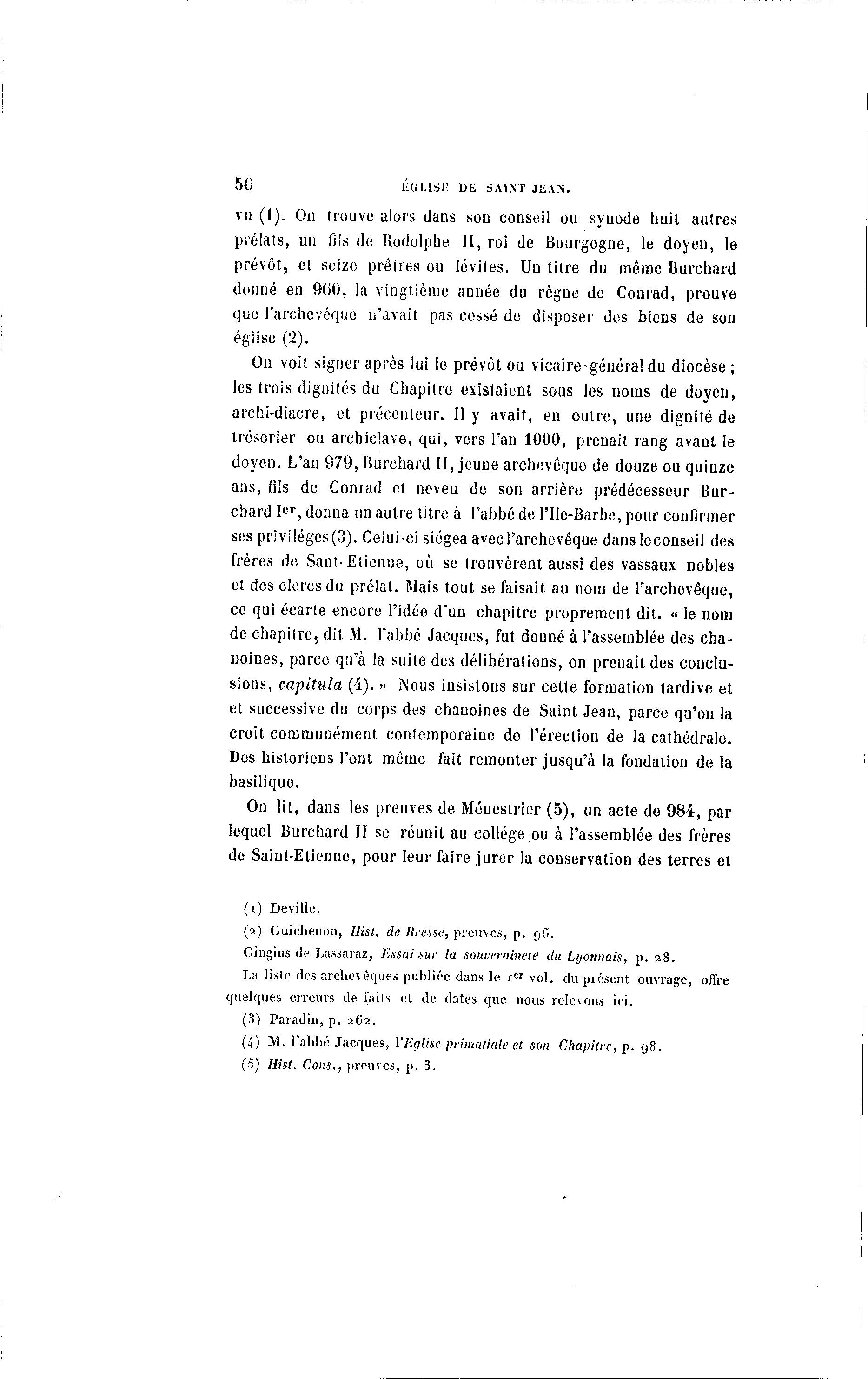 5G liUUSlî DE SAINT JEAN. vu (I). On trouve alors dans son conseil ou synode huit autres prélats, un fils de Rodolphe II, roi de Bourgogne, le doyen, le prévôt, et seize prêtres ou lévites. Un litre du même Burchard donné en 900, la vingtième année du règne de Conrad, prouve que l'archevêque n'avait pas cessé de disposer des biens de sou église (2). On voit signer après lui le prévôt ou vicaire-général du diocèse ; les trois dignités du Chapitre existaient sous les noms de doyen, archi-diacre, et précenteur. 11 y avait, en outre, une dignité de trésorier ou archiclave, qui, vers l'an 1000, prenait rang avant le doyen. L'an 979, Burchard II, jeune archevêque de douze ou quinze ans, fils de Conrad et neveu de son arrière prédécesseur Bur- chard I e r , donna un autre titre à l'abbé de l'Ile-Barbe, pour confirmer ses privilèges (3). Celui-ci siégea avec l'archevêque dansleconseil des frères de Sant-Etienne, où se trouvèrent aussi des vassaux nobles et des clercs du prélat. Mais tout se faisait au nom de l'archevêque, ce qui écarte encore l'idée d'un chapitre proprement dit. < le nom« de chapitre, dit M. l'abbé Jacques, fut donné à l'assemblée des cha- noines, parce qu'à la suite des délibérations, on prenait des conclu- sions, capitula (4). » Nous insistons sur cette formation tardive et et successive du corps des chanoines de Saint Jean, parce qu'on la croit communément contemporaine de l'érection de la cathédrale. Des historiens l'ont même fait remonter jusqu'à la fondation de la basilique. On lit, dans les preuves de Ménestrier (5), un acte de 984, par lequel Burchard II se réunit au collège ou à l'assemblée des frères de Saint-Etienne, pour leur faire jurer la conservation des terres et ( i ) Devilic. (2) Cuichenon, liist. de Bresse, preuves, p . 9 6 . Gingins (le Lassaraz, Essai sur la souveraineté du Lyonnais, p. 28. La liste des archevêques publiée dans le x c r vol. du présent ouvrage, offre quelques erreurs de faits et de dates que nous relevons ici. (3) Paradin, p . 262. (i) M. l'abbé Jacques, l'Eglise primatiale et son Chapitre, p . gH. (5) Hist. Cons., prouves, p . 3.