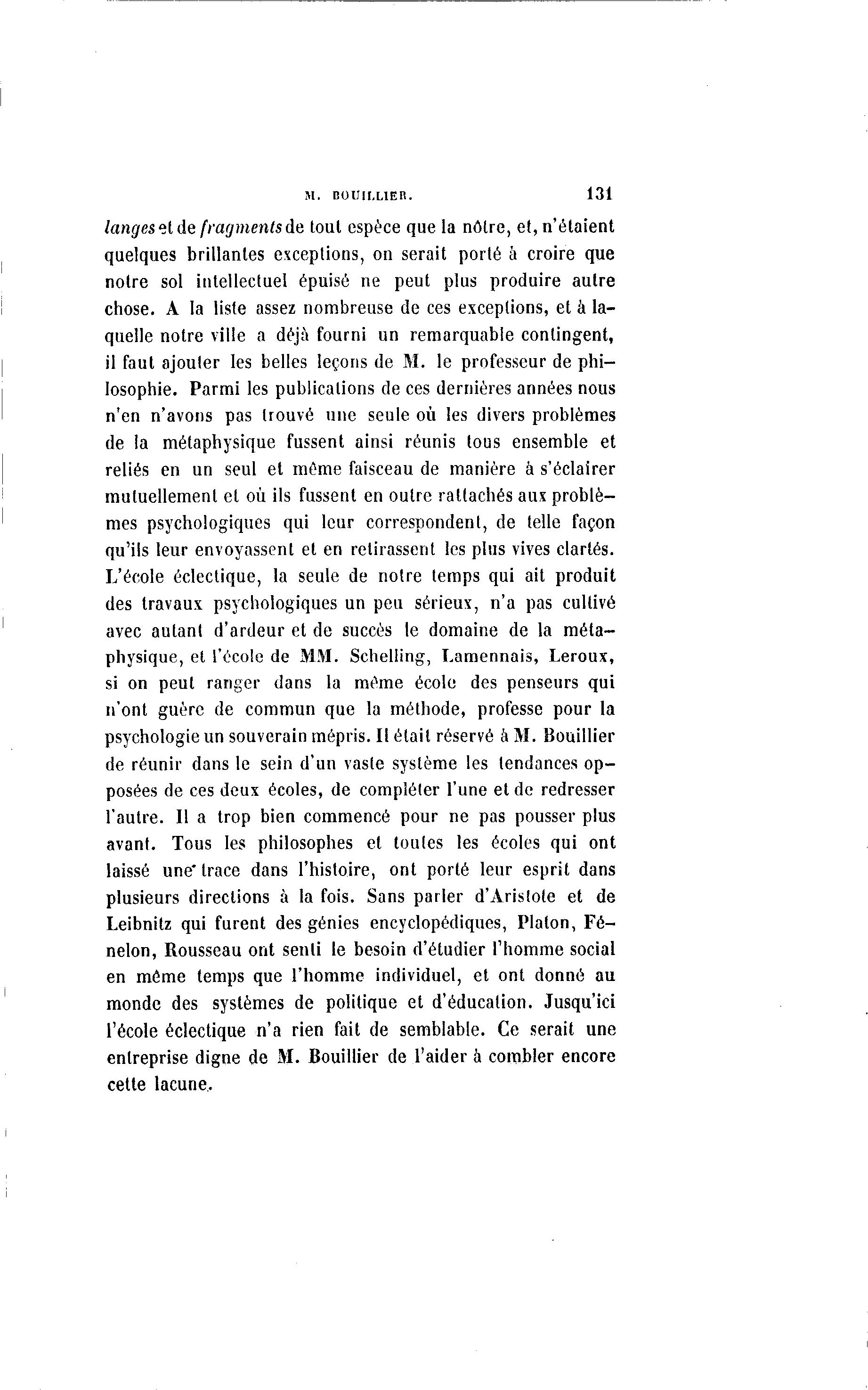 M. BOUILLIER. 131 langes et de fragments de tout espèce que la nôtre, et, n'étaient quelques brillanles exceptions, on serait porté à croire que notre sol intellectuel épuisé ne peut plus produire autre chose. A la liste assez nombreuse de ces exceptions, et à la- quelle notre ville a déjà fourni un remarquable contingent, il faut ajouter les belles leçons de M. le professeur de phi- losophie. Parmi les publications de ces dernières années nous n'en n'avons pas Irouvé une seule où les divers problèmes de la métaphysique fussent ainsi réunis tous ensemble et reliés en un seul et même faisceau de manière à s'éclairer mutuellement et où ils fussent en outre rattachés aux problè- mes psychologiques qui leur correspondent, de telle façon qu'ils leur envoyassent et en retirassent les plus vives clartés. L'école éclectique, la seule de notre temps qui ait produit des travaux psychologiques un peu sérieux, n'a pas cultivé avec autant d'ardeur et de succès le domaine de la méta- physique, et l'école de MM. Schelling, Lamennais, Leroux, si on peut ranger dans la même école des penseurs qui n'ont guère de commun que la méthode, professe pour la psychologie un souverain mépris. Il était réservé à M. Bouillier de réunir dans le sein d'un vaste système les tendances o p - posées de ces deux écoles, de compléter l'une et de redresser l'autre. Il a trop bien commencé pour ne pas pousser plus avant. Tous les philosophes et toutes les écoles qui ont laissé une* trace dans l'histoire, ont porté leur esprit dans plusieurs directions à la fois. Sans parler d'Aristote et de Leibnitz qui furent des génies encyclopédiques, Platon, F é - nelon, Rousseau ont senti le besoin d'étudier l'homme social en même temps que l'homme individuel, et ont donné au monde des systèmes de politique et d'éducation. Jusqu'ici l'école éclectique n'a rien fait de semblable. Ce serait une entreprise digne de M. Bouillier de l'aider à combler encore cette lacune..