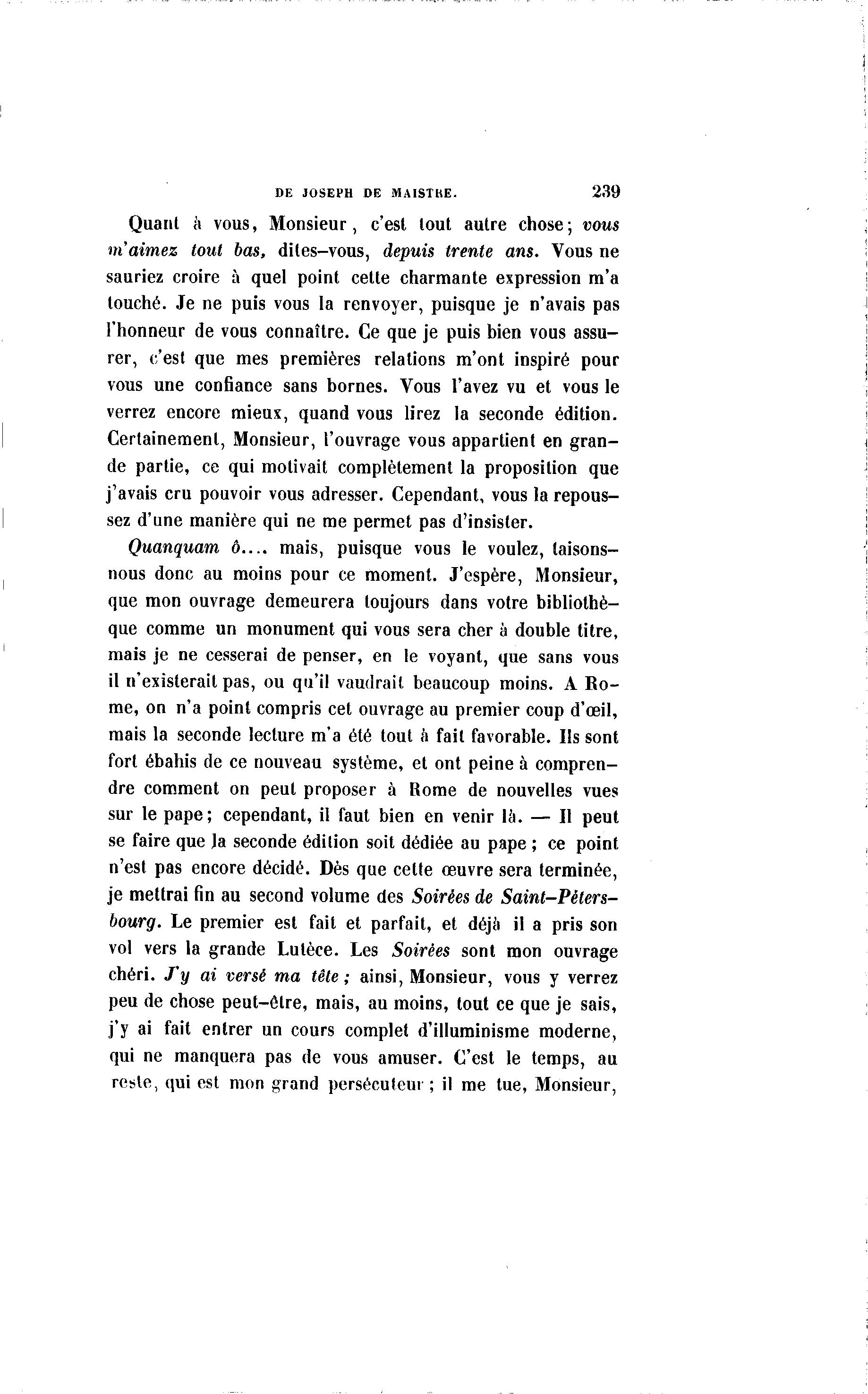 DE JOSEPH DE MAISTKE. 239 Quant a vous, Monsieur, c'est tout autre chose; vous m'aimez tout bas, dites-vous, depuis trente ans. Vous ne sauriez croire à quel point cette charmante expression m'a touché. Je ne puis vous la renvoyer, puisque je n'avais pas l'honneur de vous connaître. Ce que je puis bien vous assu- rer, c'est que mes premières relations m'ont inspiré pour vous une confiance sans bornes. Vous l'avez vu et vous le verrez encore mieux, quand vous lirez la seconde édition. Certainement, Monsieur, l'ouvrage vous appartient en gran- de partie, ce qui motivait complètement la proposition que j'avais cru pouvoir vous adresser. Cependant, vous la repous- sez d'une manière qui ne me permet pas d'insister. Quanquam ô.... mais, puisque vous le voulez, taisons- nous donc au moins pour ce moment. J'espère, Monsieur, que mon ouvrage demeurera toujours dans votre bibliothè- que comme un monument qui vous sera cher à double titre, mais je ne cesserai de penser, en le voyant, que sans vous il n'existerait pas, ou qu'il vaudrait beaucoup moins. A Ro- me, on n'a point compris cet ouvrage au premier coup d'oeil, mais la seconde lecture m'a été tout à fait favorable. Ils sont fort ébahis de ce nouveau système, et ont peine à compren- dre comment on peut proposer à Rome de nouvelles vues sur le pape; cependant, il faut bien en venir là . — Il peut se faire que Ja seconde édition soit dédiée au pape ; ce point n'est pas encore décidé. Dès que cette œuvre sera terminée, je mettrai fin au second volume des Soirées de Saint-Péters- bourg. Le premier est fait et parfait, et déjà il a pris son vol vers la grande Lulèce. Les Soirées sont mon ouvrage chéri. J'y ai versé ma tête; ainsi, Monsieur, vous y verrez peu de chose peut-être, mais, au moins, tout ce que je sais, j'y ai fait entrer un cours complet d'illuminisme moderne, qui ne manquera pas de vous amuser. C'est le temps, au reste, qui est mon grand persécuteur ; il me tue, Monsieur,