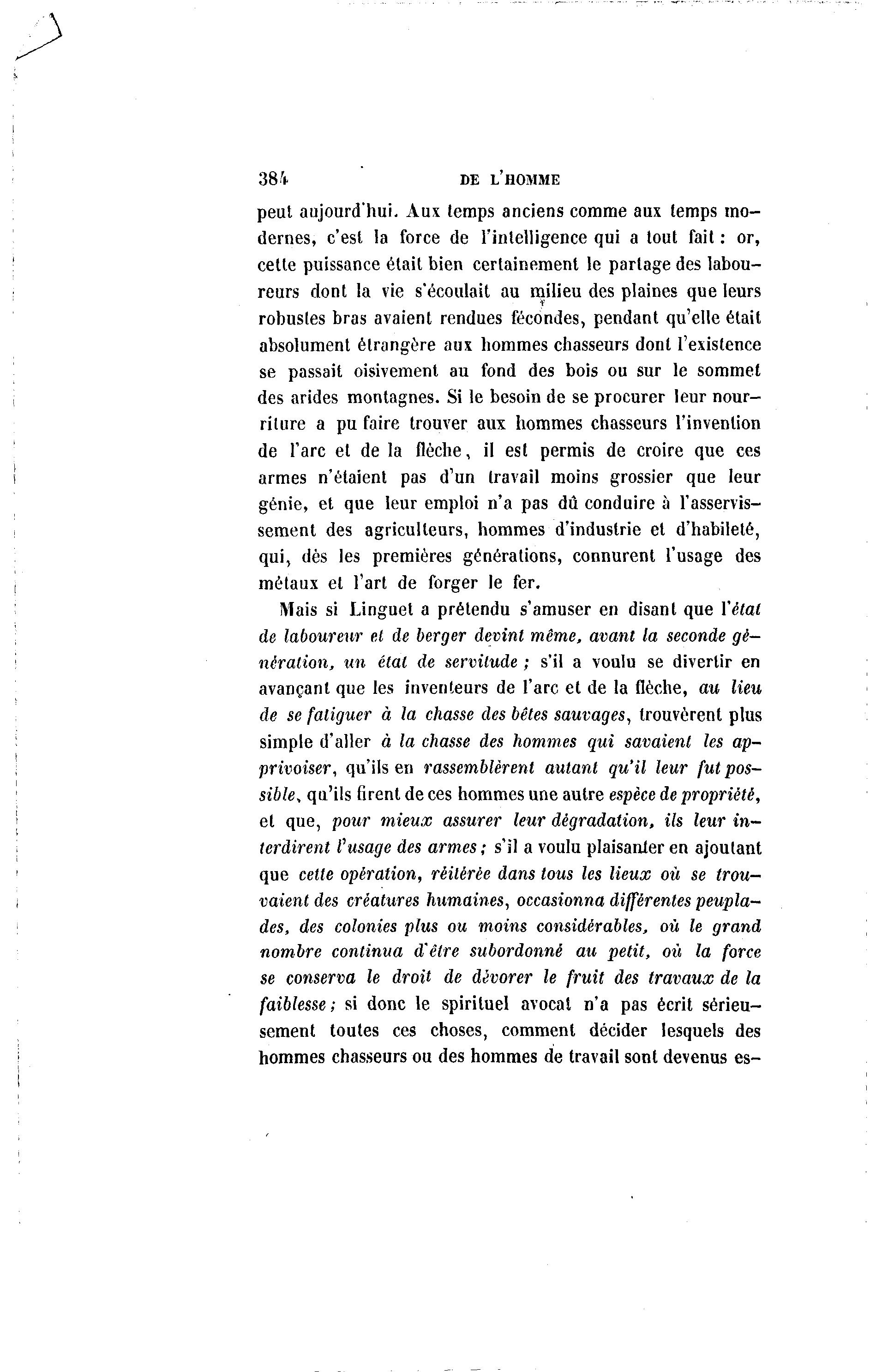 384 DE L'HOMME peut aujourd'hui. Aux temps anciens comme aux temps mo- dernes, c'est la force de l'intelligence qui a tout fait : or, cette puissance était bien certainement le partage des labou- reurs dont la vie s'écoulait au milieu des plaines que leurs robustes bras avaient rendues fécondes, pendant qu'elle était absolument étrangère aux hommes chasseurs dont l'existence se passait oisivement au fond des bois ou sur le sommet des arides montagnes. Si le besoin de se procurer leur nour- riture a pu faire trouver aux hommes chasseurs l'invention de l'arc et de la flèche, il est permis de croire que ces armes n'étaient pas d'un travail moins grossier que leur génie, et que leur emploi n'a pas dû conduire à l'asservis- sement des agriculteurs, hommes d'industrie et d'habileté, qui, dès les premières générations, connurent l'usage des métaux et l'art de forger le fer. Mais si Linguet a prétendu s'amuser en disant que Y étal de laboureur et de berger devint même, avant la seconde gé- nération, un étal de servitude ; s'il a voulu se divertir en avançant que les inventeurs de l'arc et de la flèche, au lieu de se fatiguer à la chasse des bêtes sauvages, trouvèrent plus simple d'aller à la chasse des hommes qui savaient les ap- privoiser, qu'ils en rassemblèrent autant qu'il leur fut pos- sible, qu'ils firent de ces hommes une autre espèce de propriété, et que, pour mieux assurer leur dégradation, ils leur in- terdirent l'usage des armes ; s'il a voulu plaisanter en ajoutant que cette opération, réitérée dans tous les lieux où se trou- vaient des créatures humaines, occasionna différentes peupla- des, des colonies plus ou moins considérables, où le grand nombre continua d'être subordonné au petit, où la force se conserva le droit de dévorer le fruit des travaux de la faiblesse; si donc le spirituel avocat n'a pas écrit sérieu- sement toutes ces choses, comment décider lesquels des hommes chasseurs ou des hommes de travail sont devenus es-