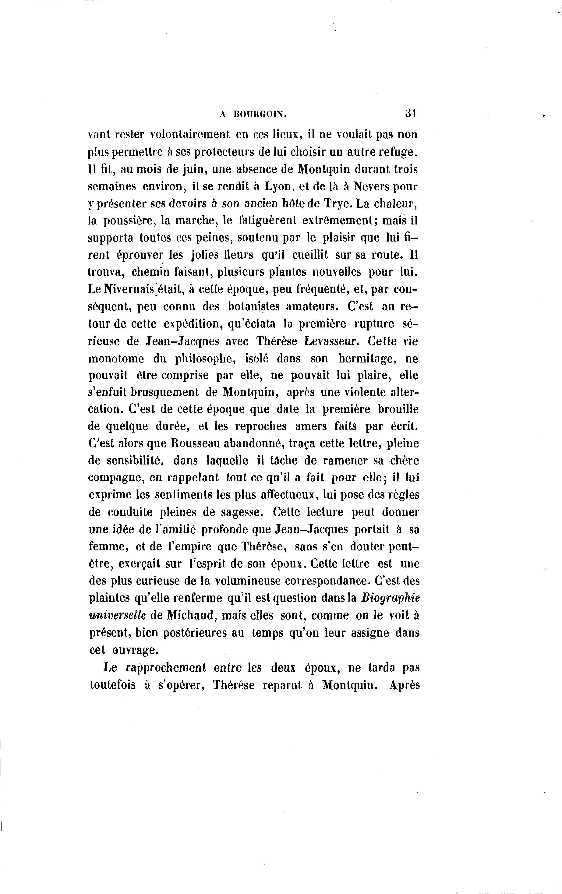 A BOUHGOIN. 31 vant rester volontairement en ces lieux, il ne voulait pas non plus permettre a ses protecteurs de lui choisir un autre refuge. 11 fit, au mois de juin, une absence de Monlquin durant trois semaines environ, il se rendit à Lyon, et de là à Nevers pour y présenter ses devoirs à son ancien hôte de Trye. La chaleur, la poussière, la marche, le fatiguèrent extrêmement; mais il supporta toutes ces peines, soutenu par le plaisir que lui fi- rent éprouver les jolies fleurs qu'il cueillit sur sa route. Il trouva, chemin faisant, plusieurs plantes nouvelles pour lui. Le Nivernais était, à cette époque, peu fréquenté, et, par con- séquent, peu connu des botanistes amateurs. C'est au re- tour de cette expédition, qu'éclata la première rupture sé- rieuse de Jean-Jacqnes avec Thérèse Levasseur. Celle vie monotome du philosophe, isolé dans son hermitage, ne pouvait être comprise par elle, ne pouvait lui plaire, elle s'enfuit brusquement de Montquin, après une violente alter- cation. C'est de cette époque que date la première brouille de quelque durée, et les reproches amers faits par écrit. C'est alors que Rousseau abandonné, traça cette lettre, pleine de sensibilité, dans laquelle il tâche de ramener sa chère compagne, en rappelant tout ce qu'il a fait pour elle; il lui exprime les sentiments les plus affectueux, lui pose des règles de conduite pleines de sagesse. Celte lecture peut donner une idée de l'amitié profonde que Jean-Jacques portait à sa femme, et de l'empire que Thérèse, sans s'en douter peut- être, exerçait sur l'esprit de son époux. Cette lettre est une des plus curieuse de la volumineuse correspondance. C'est des plaintes qu'elle renferme qu'il est question dans la Biographie universelle de Michaud, mais elles sont, comme on le voit à présent, bien postérieures au temps qu'on leur assigne dans cet ouvrage. Le rapprochement entre les deux époux, ne tarda pas toutefois à s'opérer, Thérèse reparut à Montquin. Après