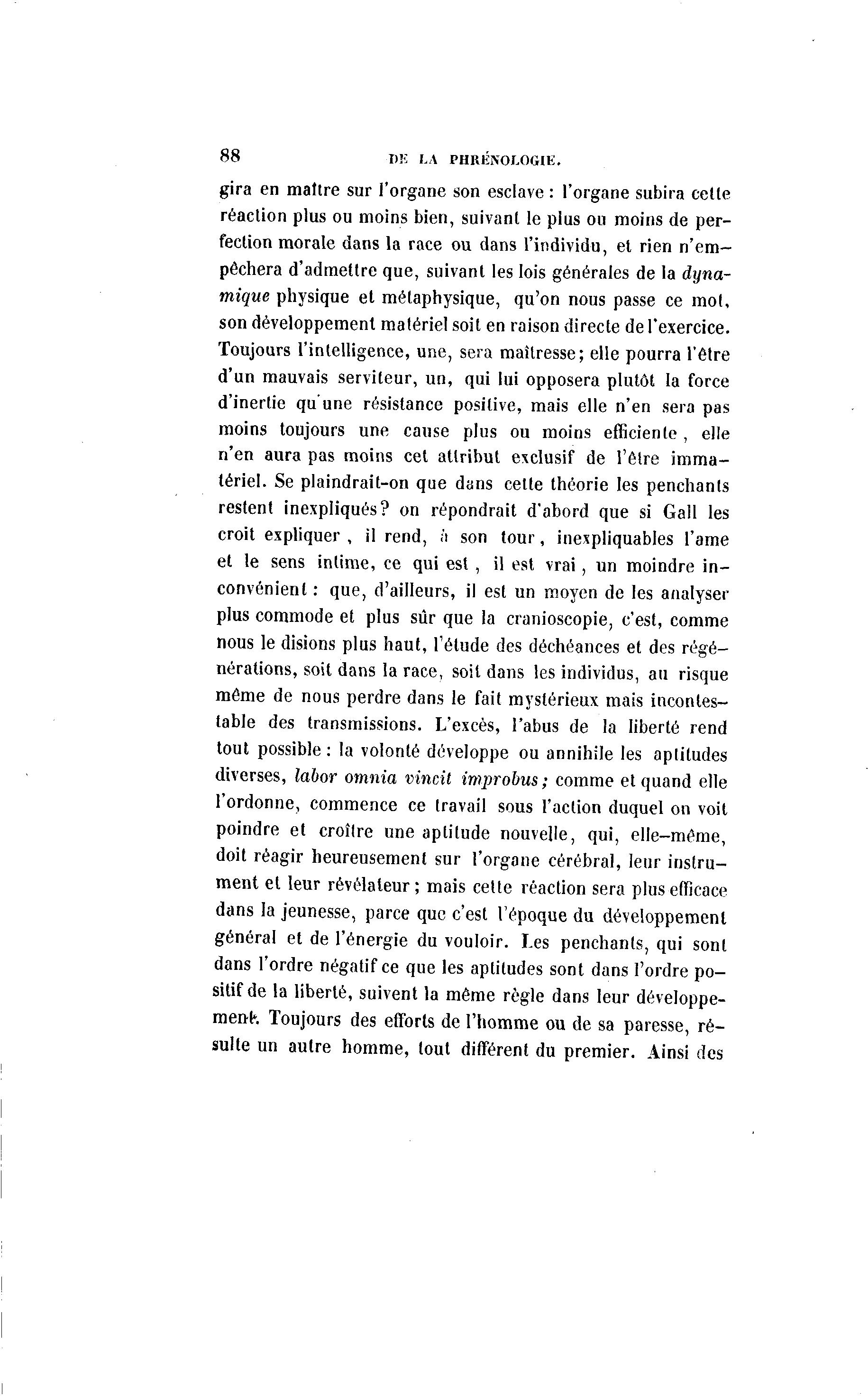 88 DE LA PHRÉNOLOGIE. gira en maître sur l'organe son esclave : l'organe subira celle réaction plus ou moins bien, suivant le plus ou moins de per- fection morale dans la race ou dans l'individu, et rien n'em- pêchera d'admettre que, suivant les lois générales de la dyna- mique physique et métaphysique, qu'on nous passe ce mot, son développement matériel soit en raison directe de l'exercice. Toujours l'intelligence, une, sera maîtresse; elle pourra l'être d'un mauvais serviteur, un, qui lui opposera plutôt la force d'inertie qu'une résistance positive, mais elle n'en sera pas moins toujours une cause plus ou moins efficiente , elle n'en aura pas moins cet attribut exclusif de l'être imma- tériel. Se plaindrait-on que dans celte théorie les penchants restent inexpliqués? on répondrait d'abord que si Gall les croit expliquer , il rend, i'i son tour, inexpliquables famé et le sens intime, ce qui est , il est vrai, un moindre in- convénient : que, d'ailleurs, il est un moyen de les analyser plus commode et plus sûr que la cranioscopie, c'est, comme nous le disions plus haut, l'étude des déchéances et des régé- nérations, soit dans la race, soit dans les individus, au risque même de nous perdre dans le fait mystérieux mais incontes- table des transmissions. L'excès, l'abus de la liberté rend tout possible : la volonté développe ou annihile les aptitudes diverses, labor omnia vincil improbus ; comme et quand elle l'ordonne, commence ce travail sous l'action duquel on voit poindre et croître une aptitude nouvelle, qui, elle-même, doit réagir heureusement sur l'organe cérébral, leur instru- ment et leur révélateur ; mais cette réaction sera plus efficace dans la jeunesse, parce que c'est l'époque du développement général et de l'énergie du vouloir. Les penchants, qui sont dans l'ordre négatif ce que les aptitudes sont dans l'ordre p o - sitif de la liberté, suivent la même règle dans leur développe- ment. Toujours des efforts de l'homme ou de sa paresse, ré- sulte un autre homme, lout différent du premier. Ainsi des