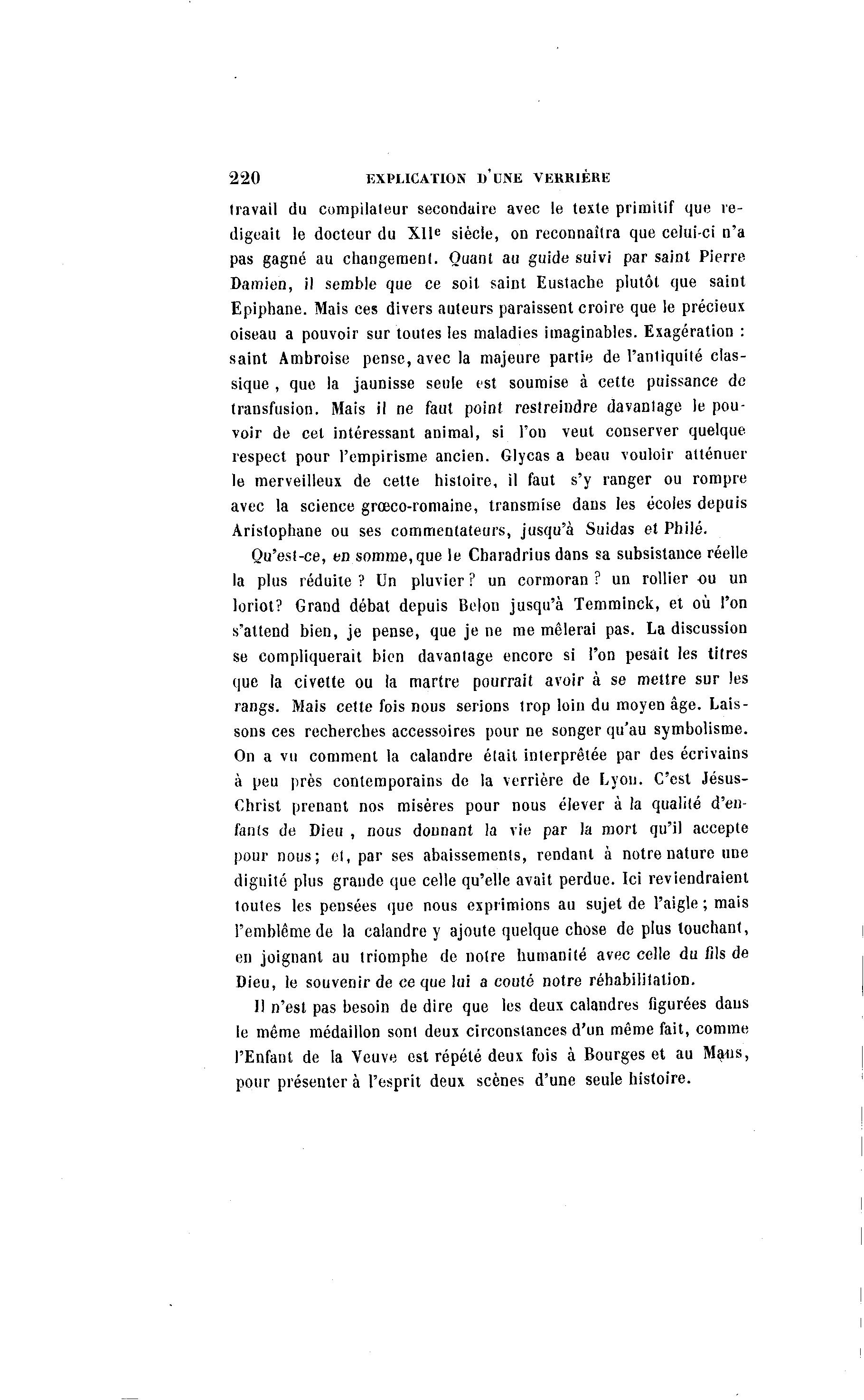 220 EXPLICATION D'UNE VERRIÈRE travail du compilateur secondaire avec le texte primitif que ré- digeait le docteur du Xlle siècle, on reconnaîtra que celui-ci n'a pas gagné au changement. Quant au guide suivi par saint Pierre Damien, il semble que ce soit saint Eustache plutôt que saint Epiphane. Mais ces divers auteurs paraissent croire que le précieux oiseau a pouvoir sur toutes les maladies imaginables. Exagération : saint Ambroise pense, avec la majeure partie de l'antiquité clas- sique , que la jaunisse seule est soumise à cette puissance de transfusion. Mais il ne faut point restreindre davantage le pou- voir de cet intéressant animal, si l'on veut conserver quelque respect pour l'empirisme ancien. Glycas a beau vouloir atténuer le merveilleux de cette histoire, il faut s'y ranger ou rompre avec la science grœco-romaine, transmise dans les écoles depuis Aristophane ou ses commentateurs, jusqu'à Suidas et Philé. Qu'est-ce, en somme, que le Charadrius dans sa subsistance réelle la plus réduite ? Un pluvier ? un cormoran ? un rollier ou un loriot? Grand débat depuis Belon jusqu'à Temminck, et où l'on s'attend bien, je pense, que je ne me mêlerai pas. La discussion se compliquerait bien davantage encore si l'on pesait les titres que la civette ou la martre pourrait avoir à se mettre sur les rangs. Mais cette fois nous serions trop loin du moyen âge. Lais- sons ces recherches accessoires pour ne songer qu'au symbolisme. On a vu comment la calandre était interprêtée par des écrivains à peu près contemporains de la verrière de Lyon. C'est Jésus- Christ prenant nos misères pour nous élever à la qualité d'en- fants de Dieu , nous donnant la vie par la mort qu'il accepte pour nous; et, par ses abaissements, rendant à notre nature une dignité plus grande que celle qu'elle avait perdue. Ici reviendraient toutes les pensées que nous exprimions au sujet de l'aigle ; mais l'emblème de la calandre y ajoute quelque chose de plus touchant, en joignant au triomphe de notre humanité avec celle du fils de Dieu, le souvenir de ce que lui a coûté notre réhabilitation. Il n'est pas besoin de dire que les deux calandres figurées dans le même médaillon sont deux circonstances d'un même fait, comme l'Enfant de la Veuve est répété deux fois à Bourges et au Mans, pour présenter à l'esprit deux scènes d'une seule histoire.
