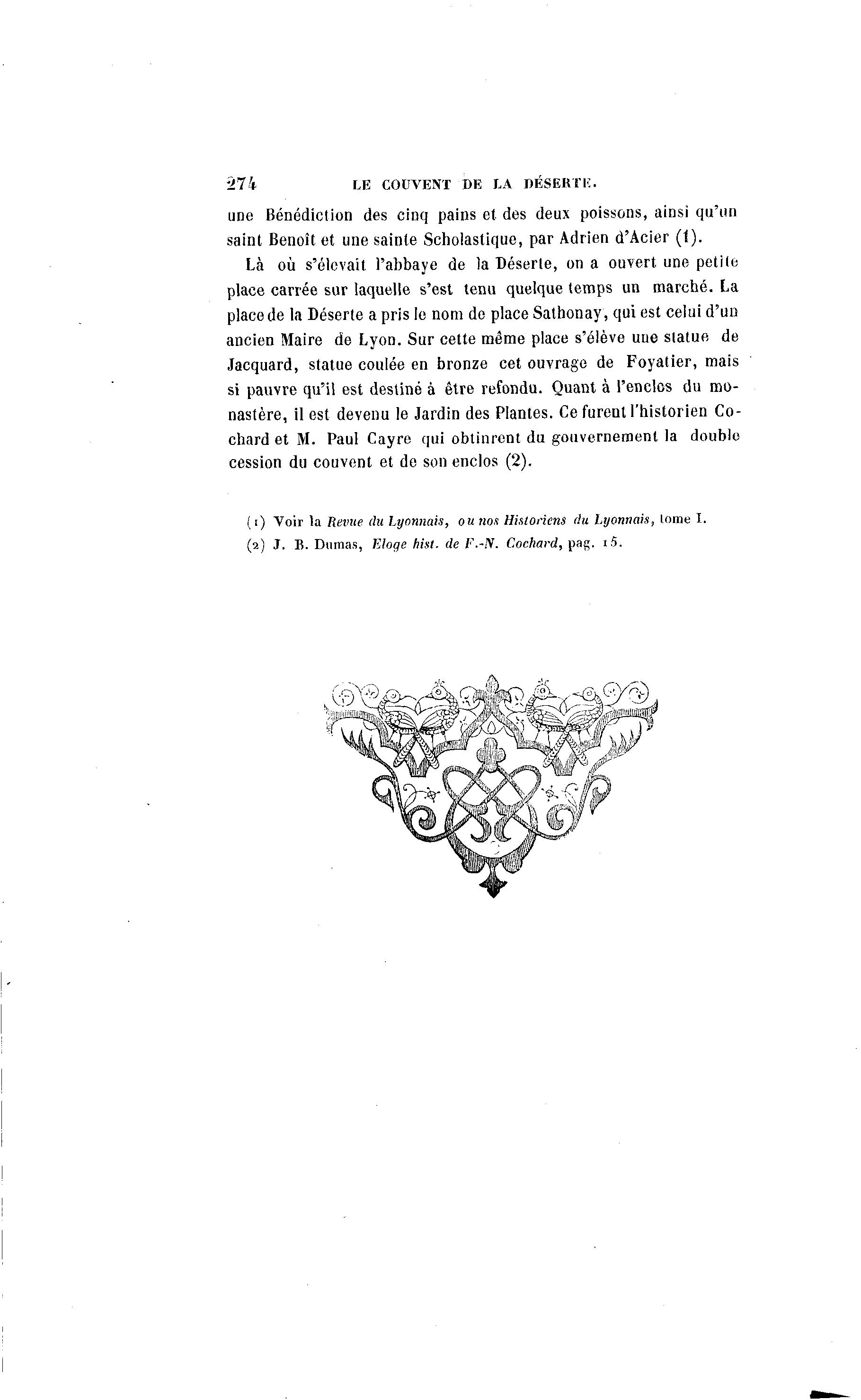 *27 4 LE COUVENT DE LA DÉSERT E. une Bénédiction des cinq pains et des deux poissons, ainsi qu'un saint Benoît et une sainte Scholastique, par Adrien d'Acier (t). Là où s'élevait l'abbaye de la Déserte, on a ouvert une petite place carrée sur laquelle s'est tenu quelque temps un marché. La place de la Déserte a pris le nom de place Sathonay, qui est celui d'un ancien Maire de Lyon. Sur cette même place s'élève une statue de Jacquard, statue coulée en bronze cet ouvrage de Foyatier, mais si pauvre qu'il est destiné à être refondu. Quant à l'enclos du mo- nastère, il est devenu le Jardin des Plantes. Ce furent l'historien Co- chard et M. Paul Cayre qui obtinrent du gouvernement la double cession du couvent et de son enclos (2). ( i) Voir ta Revue du Lyonnais, ou nos Historiens (lu Lyonnais, tome I. (2) J. B. Dumas, Eloge hist. de F.-N. Cochard, pag. i 5 .