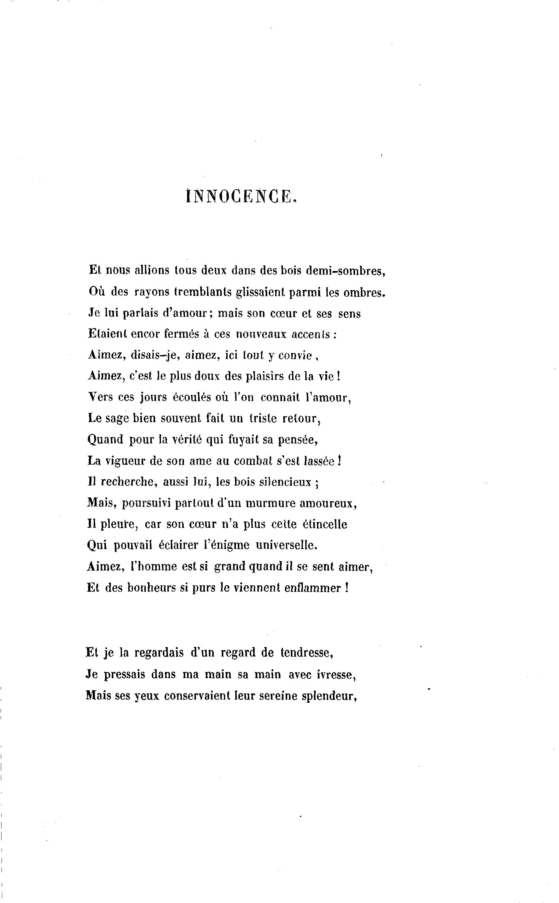 INNOCENCE. Et nous allions tous deux dans des bois demi-sombres, Où des rayons tremblants glissaient parmi les ombres. Je lui parlais d'amour ; mais son cœur et ses sens Etaient encor fermés à ces nouveaux accents : Aimez, disais-je, aimez, ici tout y convie , Aimez, c'est le plus doux des plaisirs de la vie ! Vers ces jours écoulés où l'on connait l'amour, Le sage bien souvent fait un triste retour, Quand pour la vérité qui fuyait sa pensée, La vigueur de son ame au combat s'est lassée ! Il recherche, aussi lui, les bois silencieux ; Mais, poursuivi partout d'un murmure amoureux, Il pleute, car son cœur n'a plus celte étincelle Qui pouvait éclairer l'énigme universelle. Aimez, l'homme est si grand quand il se sent aimer, Et des bonheurs si purs le viennent enflammer ! Et je la regardais d'un regard de tendresse, Je pressais dans ma main sa main avec ivresse, Mais ses yeux conservaient leur sereine splendeur,