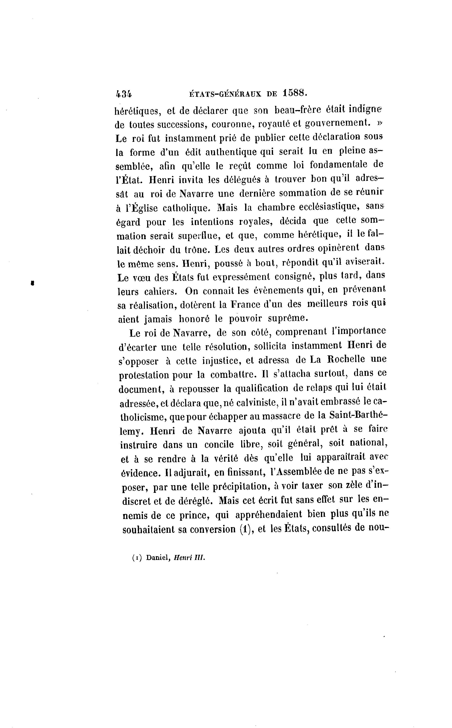 434 ÉTATS-GÉNÉRAUX DE 1 5 8 8 . hérétiques, et de déclarer que son beau-frère était indigne de toutes successions, couronne, royauté et gouvernement. » Le roi fut instamment prié de publier cette déclaration sous la forme d'un édit authentique qui serait lu en pleine as- semblée, afin qu'elle le reçût comme loi fondamentale de l'État. Henri invita les délégués à trouver bon qu'il adres- sât au roi de Navarre une dernière sommation de se réunir à l'Église catholique. Mais la chambre ecclésiastique, sans égard pour les intentions royales, décida que cette som- mation serait superflue, et que, comme hérétique, il le fal- lait déchoir du trône. Les deux autres ordres opinèrent dans* le même sens. Henri, poussé a bout, répondit qu'il aviserait. Le vœu des États fut expressément consigné, plus tard, dans leurs cahiers. On connait les événements qui, en prévenant sa réalisation, dotèrent la France d'un des meilleurs rois qui aient jamais honoré le pouvoir suprême. Le roi de Navarre, de son côté, comprenant l'importance d'écarter une telle résolution, sollicita instamment Henri de s'opposer à cette injustice, et adressa de La Rochelle une protestation pour la combattre. Il s'attacha surtout, dans ce document, à repousser la qualification de relaps qui lui était adressée, et déclara que, né calviniste, il n'avait embrassé le ca- tholicisme, que pour échapper au massacre de la Saint-Barthé- lémy. Henri de Navarre ajouta qu'il était prêt à se faire instruire dans un concile libre, soit général, soit national, et à se rendre à la vérité dès qu'elle lui apparaîtrait avec évidence. Il adjurait, en finissant, l'Assemblée de ne pas s'ex- poser, par une telle précipitation, à voir taxer son zèle d'in- discret et de déréglé. Mais cet écrit fut sans effet sur les en- nemis de ce prince, qui appréhendaient bien plus qu'ils ne souhaitaient sa conversion (1), et les États, consultés de nou- (i) Daniel, Henri III.