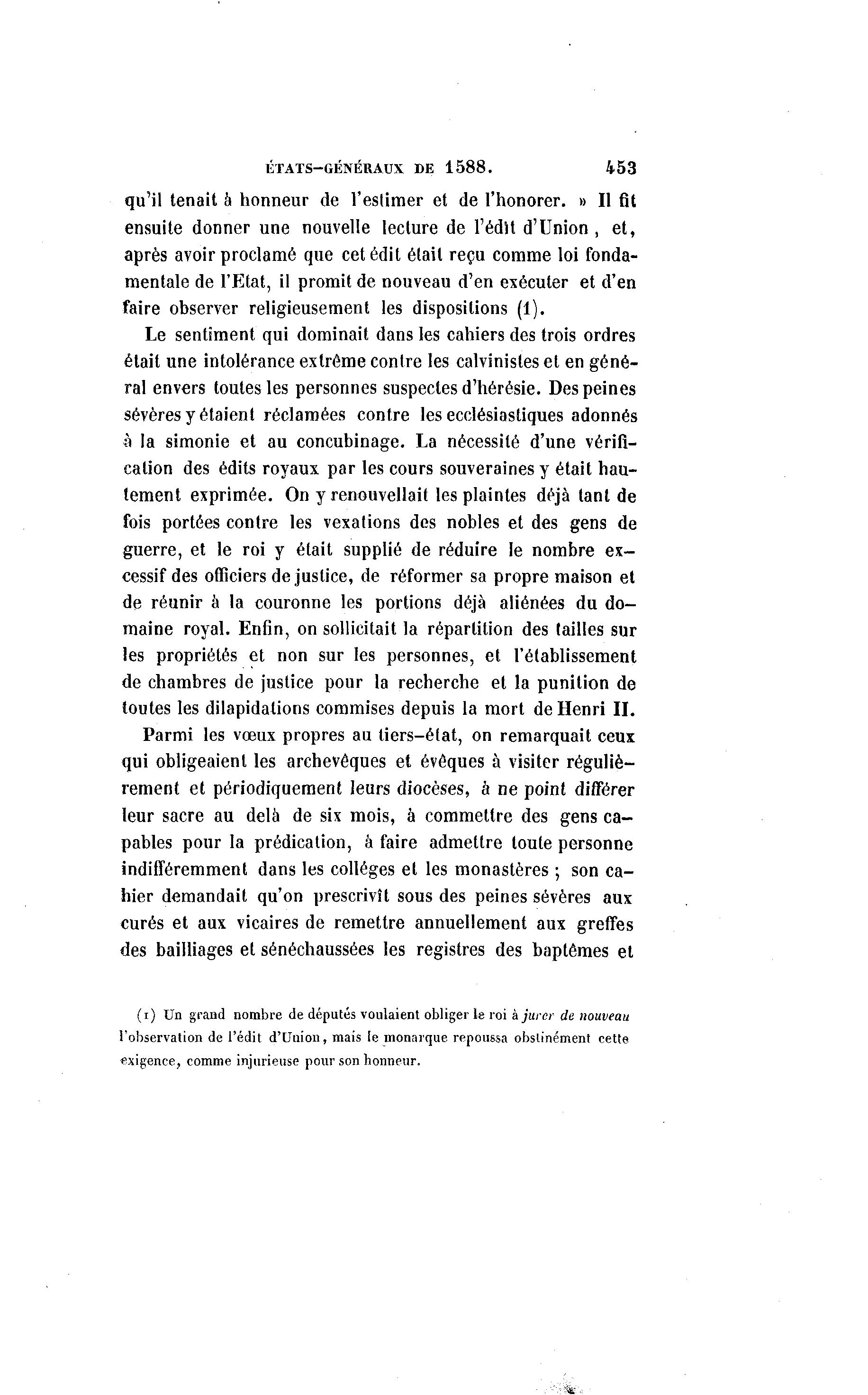 ÉTATS-GÉNÉRAUX DE 1 5 8 8 . 453 qu'il tenait â honneur de l'estimer et de l'honorer. » Il fit ensuite donner une nouvelle lecture de l'édlt d'Union , et, après avoir proclamé que cet édit était reçu comme loi fonda- mentale de l'Etat, il promit de nouveau d'en exécuter et d'en faire observer religieusement les dispositions (1). Le sentiment qui dominait dans les cahiers des trois ordres était une intolérance extrême contre les calvinistes et en géné- ral envers toutes les personnes suspectes d'hérésie. Des peines sévères y étaient réclamées contre les ecclésiastiques adonnés à la simonie et au concubinage. La nécessité d'une vérifi- cation des édits royaux par les cours souveraines y était hau- tement exprimée. On y renouvellait les plaintes déjà tant de fois portées contre les vexations des nobles et des gens de guerre, et le roi y était supplié de réduire le nombre ex- cessif des officiers de justice, de réformer sa propre maison et de réunir à la couronne les portions déjà aliénées du do- maine royal. Enfin, on sollicitait la répartition des tailles sur les propriétés et non sur les personnes, et l'établissement de chambres de justice pour la recherche et la punition de toutes les dilapidations commises depuis la mort de Henri II. Parmi les vœux propres au tiers-état, on remarquait ceux qui obligeaient les archevêques et évêques à visiter réguliè- rement et périodiquement leurs diocèses, à ne point différer leur sacre au delà de six mois, à commettre des gens ca- pables pour la prédication, à faire admettre toute personne indifféremment dans les collèges et les monastères ; son ca- hier demandait qu'on prescrivît sous des peines sévères aux curés et aux vicaires de remettre annuellement aux greffes des bailliages et sénéchaussées les registres des baptêmes et (i) Un grand nombre de députés voulaient obliger le roi à jurer de nouveau l'observation de l'édit d'Union, mais le monarque repoussa obstinément cette exigence, comme injurieuse pour son honneur.