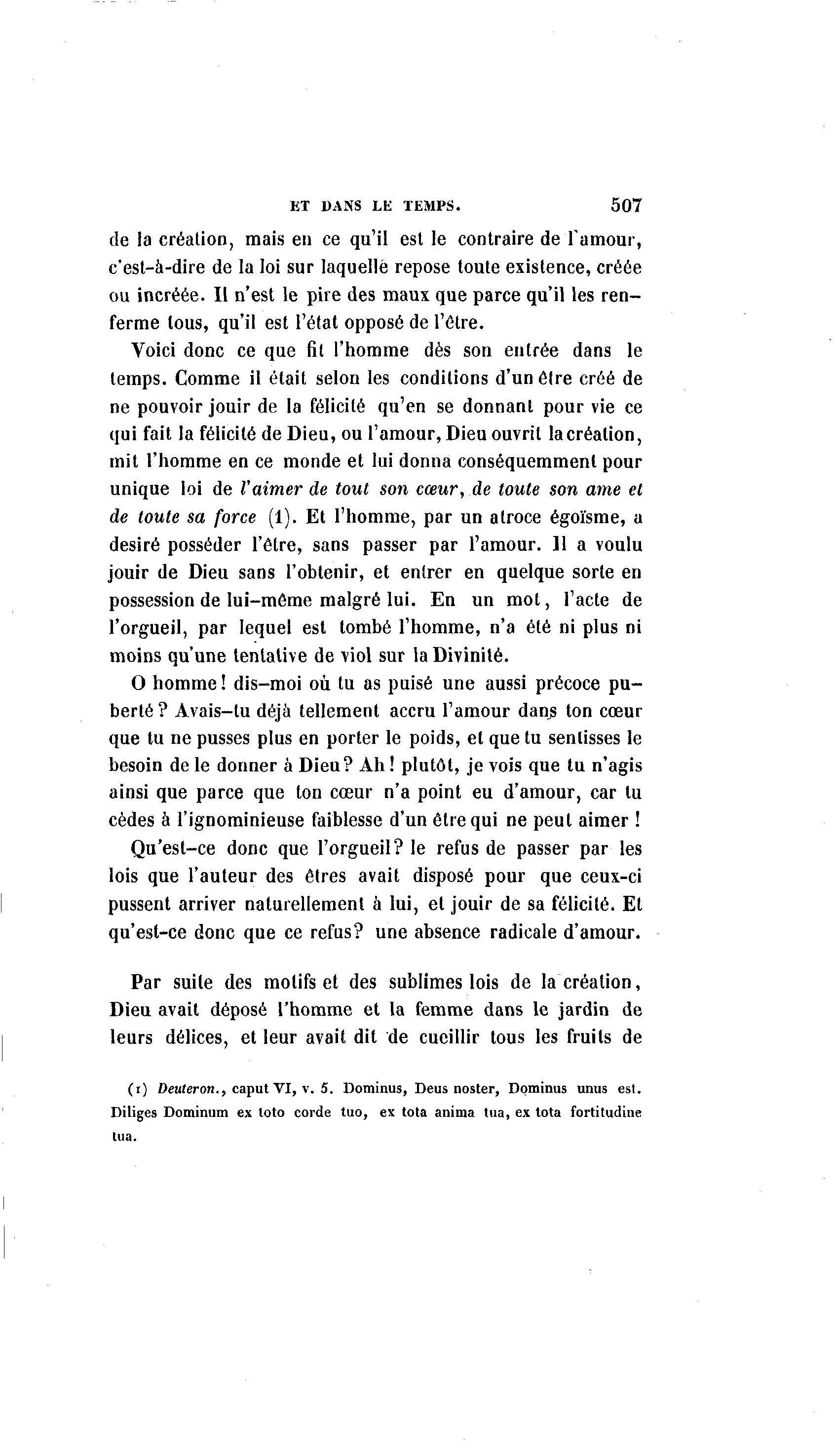ET DANS LE TEMPS. 507 de la création, mais en ce qu'il est le contraire de l'amour, c'est-à -dire de la loi sur laquelle repose toute existence, créée ou incréée. Il n'est le pire des maux que parce qu'il les ren- ferme tous, qu'il est l'état opposé de l'être. Voici donc ce que fil l'homme dès son entrée dans le temps. Comme il était selon les conditions d'un être créé de ne pouvoir jouir de la félicité qu'en se donnant pour vie ce qui fait la félicité de Dieu, ou l'amour, Dieu ouvrit la création, mit l'homme en ce monde et lui donna conséquemmenl pour unique loi de l'aimer de tout son cœur, de toute son ame et de toute sa force (1). Et l'homme, par un atroce égoïsme, a désiré posséder l'être, sans passer par l'amour. 11 a voulu jouir de Dieu sans l'obtenir, et entrer en quelque sorte en possession de lui-môme malgré lui. En un mot, l'acte de l'orgueil, par lequel est tombé l'homme, n'a été ni plus ni moins qu'une tentative de viol sur la Divinité. O homme! dis-moi où tu as puisé une aussi précoce p u - berté? Avais-tu déjà tellement accru l'amour dans ton cœur que tu ne pusses plus en porter le poids, et que tu sentisses le besoin de le donner à Dieu? Ah ! plutôt, je vois que tu n'agis ainsi que parce que ton cœur n'a point eu d'amour, car tu cèdes à l'ignominieuse faiblesse d'un être qui ne peut aimer ! Qu'est-ce donc que l'orgueil? le refus de passer par les lois que l'auteur des êtres avait disposé pour que ceux-ci pussent arriver naturellement à lui, et jouir de sa félicité. Et qu'est-ce donc que ce refus? une absence radicale d'amour. Par suite des motifs et des sublimes lois de la création, Dieu avait déposé l'homme et la femme dans le jardin de leurs délices, et leur avait dit de cueillir tous les fruits de (i) Deuteron., caput VI, v. 5. Dominus, Deus noster, Dominus unus est. Diliges Dominum ex loto corde tuo, ex tota anima tua, ex tota fortitudine tua.