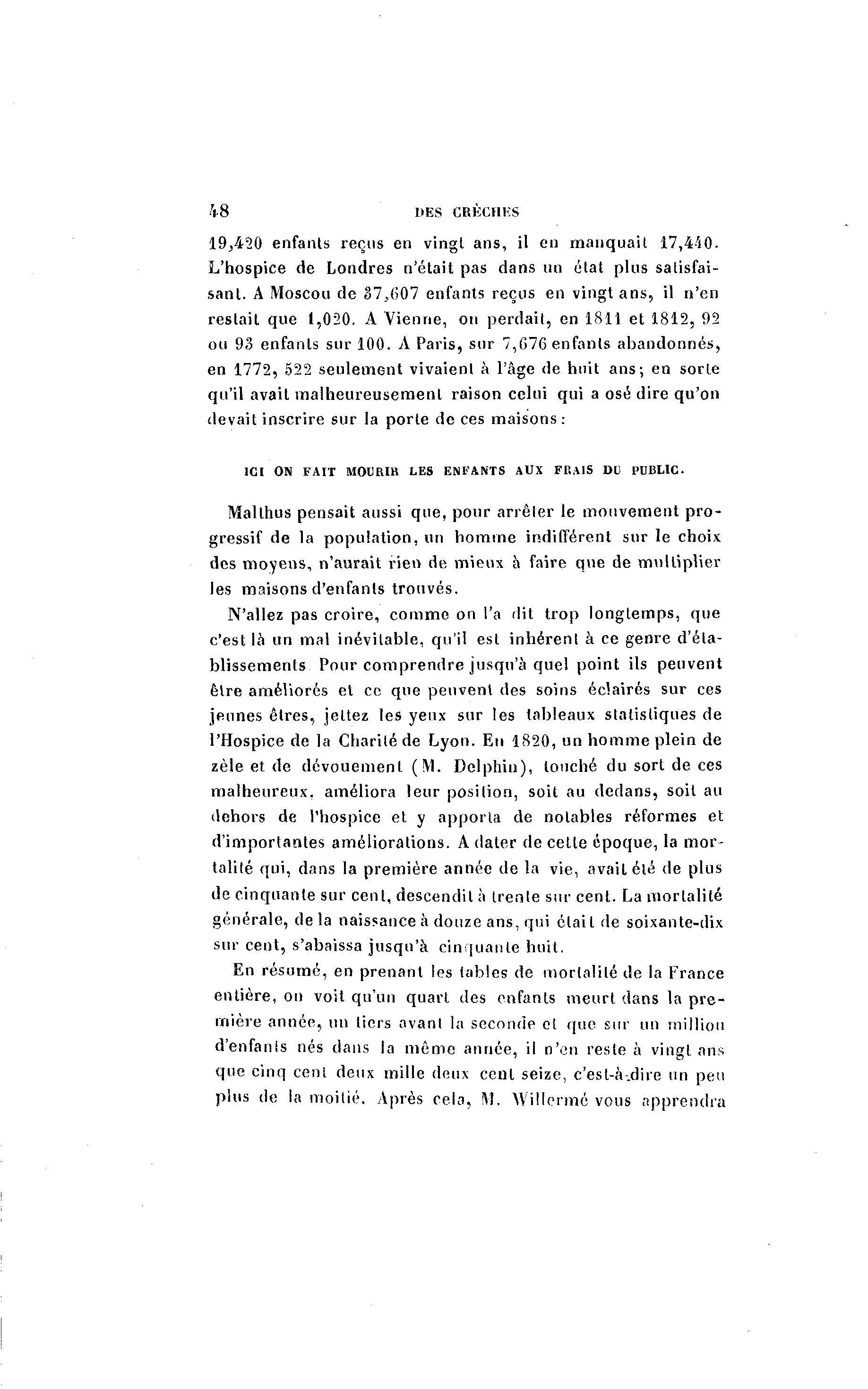 48 DES CRÈCHHS 19,420 enfants reçus en vingt ans, il en manquait 17,440. L'hospice de Londres n'était pas dans un état plus satisfai- sant. A Moscou de 87,607 enfants reçus en vingt a n s , il n'en restait que 1,020. A Vienne, on perdait, en 1811 et 1812, 92 ou 93 enfants sur 100. A Paris, sur 7,676 enfants abandonnés, en 1772, 522 seulement vivaient à l'âge de huit ans; en sorte qu'il avait malheureusement raison celui qui a osé dire qu'on devait inscrire sur la porte de ces maisons: ICI ON FAIT MOURIK LES ENFANTS AUX FRAIS DO PUBLIC. Malthus pensait aussi que, pour arrêler le mouvement p r o - gressif de la population, un homme indifférent sur le choix des moyens, n'aurait rien de mieux à faire que de multiplier les maisons d'enfants trouvés. N'allez pas croire, comme on l'a dit trop longtemps, que c'est là un mal inévitable, qu'il est inhérent à ce genre d'éta- blissements Pour comprendre jusqu'à quel point ils peuvent être améliorés et ce que peuvent des soins éclairés sur ces jeunes êtres, jeltez les yeux sur les tableaux statistiques de l'Hospice de la Charité de Lyon. En 1820, un homme plein de zèle et de dévouement (M. Delphiu), louché du sort de ces malheureux, améliora leur position, soit au dedans, soit au dehors de l'hospice et y apporta de notables réformes et d'importantes améliorations. A dater de cette époque, la mor- talité qui, dans la première année de la vie, avait été de plus de cinquante sur cent, descendit à trente sur cent. La mortalité générale, delà naissance à douze ans, qui était de soixante-dix sur cent, s'abaissa jusqu'à cinquante huit. En résumé, en prenant les tables de mortalité de la France entière, on voit qu'un quart des enfants meurt dans la p r e - mière année, un tiers avant la seconde et que sur un million d'enfanls nés dans la même année, il n'en reste à vingt ans que cinq cent deux mille deux cent seize, c'est-à -dire un peu plus de la moitié. Après cela, M. Wiliermé vous apprendra
