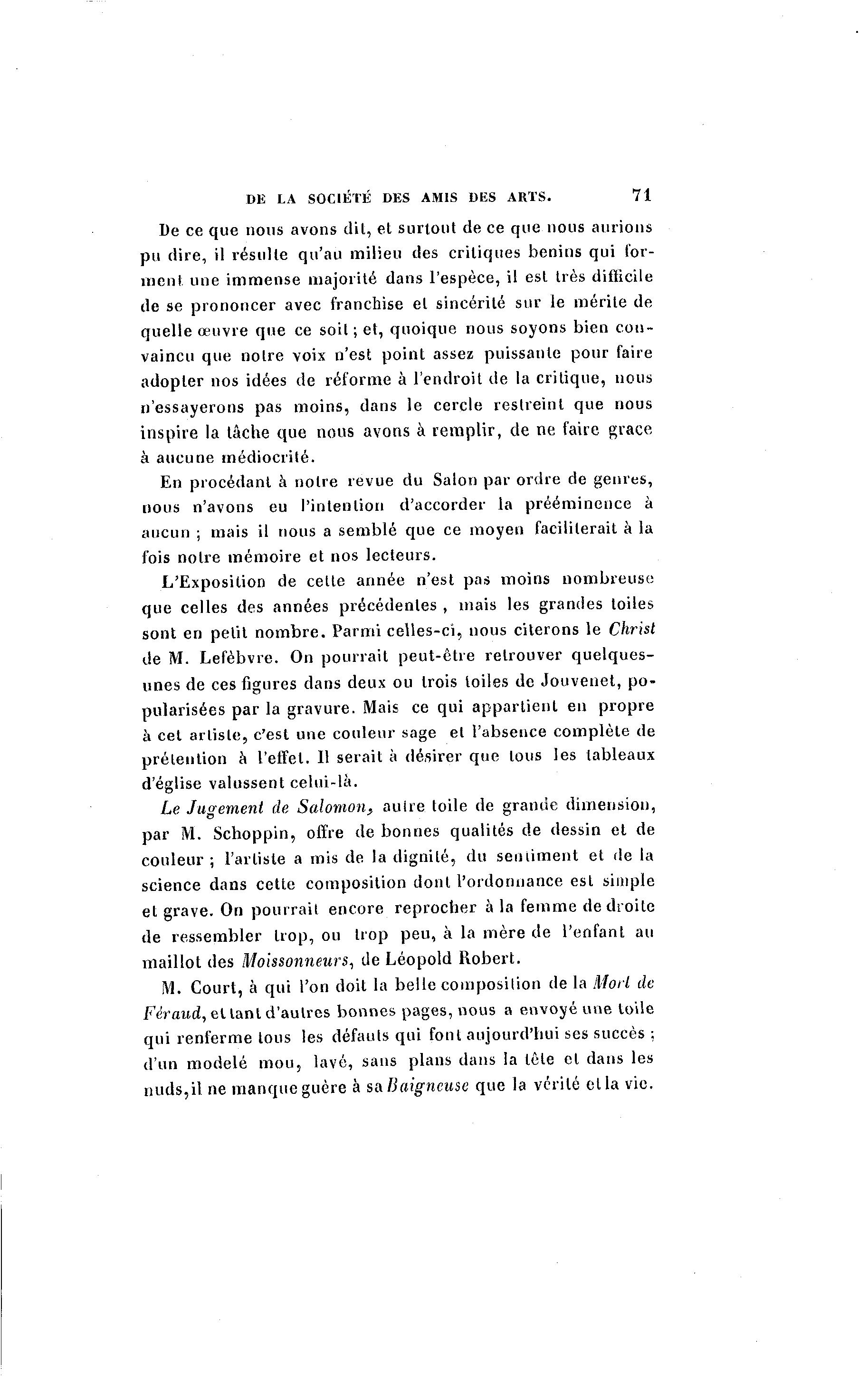 DE LA SOCIÉTÉ DES AMIS DES ARTS. 71 De ce que nous avons dit, et surtout de ce que nous aurions pu dire, il résulte qu'au milieu des critiques bénins qui for- ment une immense majorité dans l'espèce, il est très difficile de se prononcer avec franchise et sincérité sur le mérite de quelle œuvre que ce soil ; et, quoique nous soyons bien con- vaincu que noire voix n'est point assez puissante pour faire adopter nos idées de réforme à l'endroit de la critique, nous n'essayerons pas moins, dans le cercle restreint que nous inspire la tâche que nous avons à remplir, de ne faire grâce à aucune médiocrité. En procédant à notre revue du Salon par ordre de genres, nous n'avons eu l'intention d'accorder la prééminence à aucun ; mais il nous a semblé que ce moyen faciliterait à la fois notre mémoire et nos lecteurs. L'Exposition de cette année n'est pas moins nombreuse que celles des années précédentes , mais les grandes toiles sont en petit nombre. Parmi celles-ci, nous citerons le Christ de M. Lefèbvre. On pourrait peut-être retrouver quelques- unes de ces figures dans deux ou trois toiles de Jouvenet, po- pularisées par la gravure. Mais ce qui appartient en propre à cet artiste, c'est une couleur sage et l'absence complète de prétention à l'effet. 11 serait à désirer que tous les tableaux d'église valussent celui-là . Le Jugement de Salomon, auire toile de grande dimension, par M. Schoppin, offre de bonnes qualités de dessin et de couleur ; l'artiste a mis de la dignité, du seniiment et de la science dans cette composition dont l'ordonnance est simple et grave. On pourrait encore reprocher à la femme de droite de ressembler trop, ou trop peu, à la mère de l'enfant au maillot des Moissonneurs, de Léopold Robert. M. Court, à qui l'on doit la belle composition de la Mort de Féraud, et tant d'autres bonnes pages, nous a envoyé une toile qui renferme tous les défauts qui font aujourd'hui ses succès ; d'un modelé mou, lavé, sans plans dans la tête cl dans les nuds,il ne manque guère à s& Baigneuse que la vérité et la vie.
