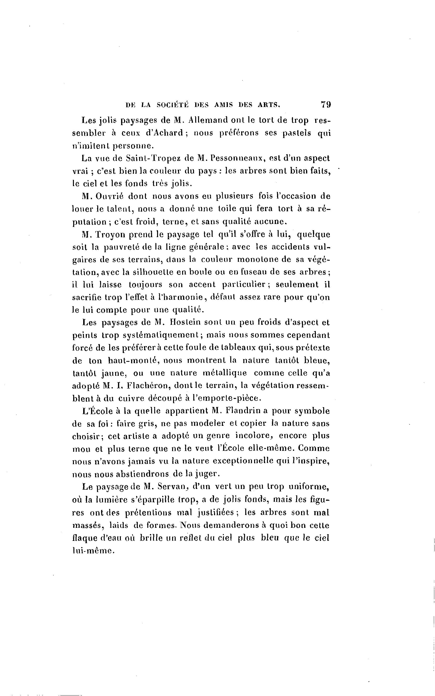 DE LA SOCIÉTÉ DES AMIS DES ARTS. 79 Les jolis paysages de M. Allemand ont le tort de trop r e s - sembler à ceux d'Achard ; nous préférons ses pastels qui n'imitent personne. La vue de Saint-Tropez de M. Pessonneaux, est d'un aspect vrai ; c'est bien la couleur du pays : les arbres sont bien faits, le ciel et les fonds très jolis. M. Ouvrié dont nous avons eu plusieurs fois l'occasion de louer le talent, nous a donné une toile qui fera tort à sa r é - putation ; c'est froid, t e r n e , et sans qualité aucune. M. Troyon prend le paysage tel qu'il s'offre à lui, quelque soit la pauvreté de la ligne générale; avec les accidents vul- gaires de ses terrains, dans la couleur monotone de sa végé- tation, avec la silhouette en boule ou en fuseau de ses a r b r e s ; il lui laisse toujours son accent particulier ; seulement il sacrifie trop l'effet à l'harmonie, défaut assez rare pour qu'on le lui compte pour une qualité. Les paysages de M. Hostein sont un peu froids d'aspect et peints trop systématiquement; mais nous sommes cependant forcé de les préférer à cette foule de tableaux qui, sous prétexte de ton haut-monté, nous montrent la nature tantôt bleue, tantôt jaune, ou une nature métallique comme celle qu'a adopté M. I. Flachéron, dont le terrain, la végétation ressem- blent à du cuivre découpé à l'emporte-pièce. L'École à la quelle appartient M. Flandrin a pour symbole de sa foi: faire gris, ne pas modeler et copier la nature sans choisir; cet artiste a adopté un genre incolore, encore plus mou et plus terne que ne le veut l'Ecole elle-même. Comme nous n'avons jamais vu la nature exceptionnelle qui l'inspire, nous nous abstiendrons de la juger. Le paysage de M. Servan^ d'un vert un peu trop uniforme, où la lumière s'éparpille trop, a de jolis fonds, mais les figu- res ont des prétentions mal justifiées; les arbres sont mal massés, laids de formes. Nous demanderons à quoi bon cette flaque d'eau où brille un reflet du ciel plus bleu que le ciel lui-même.