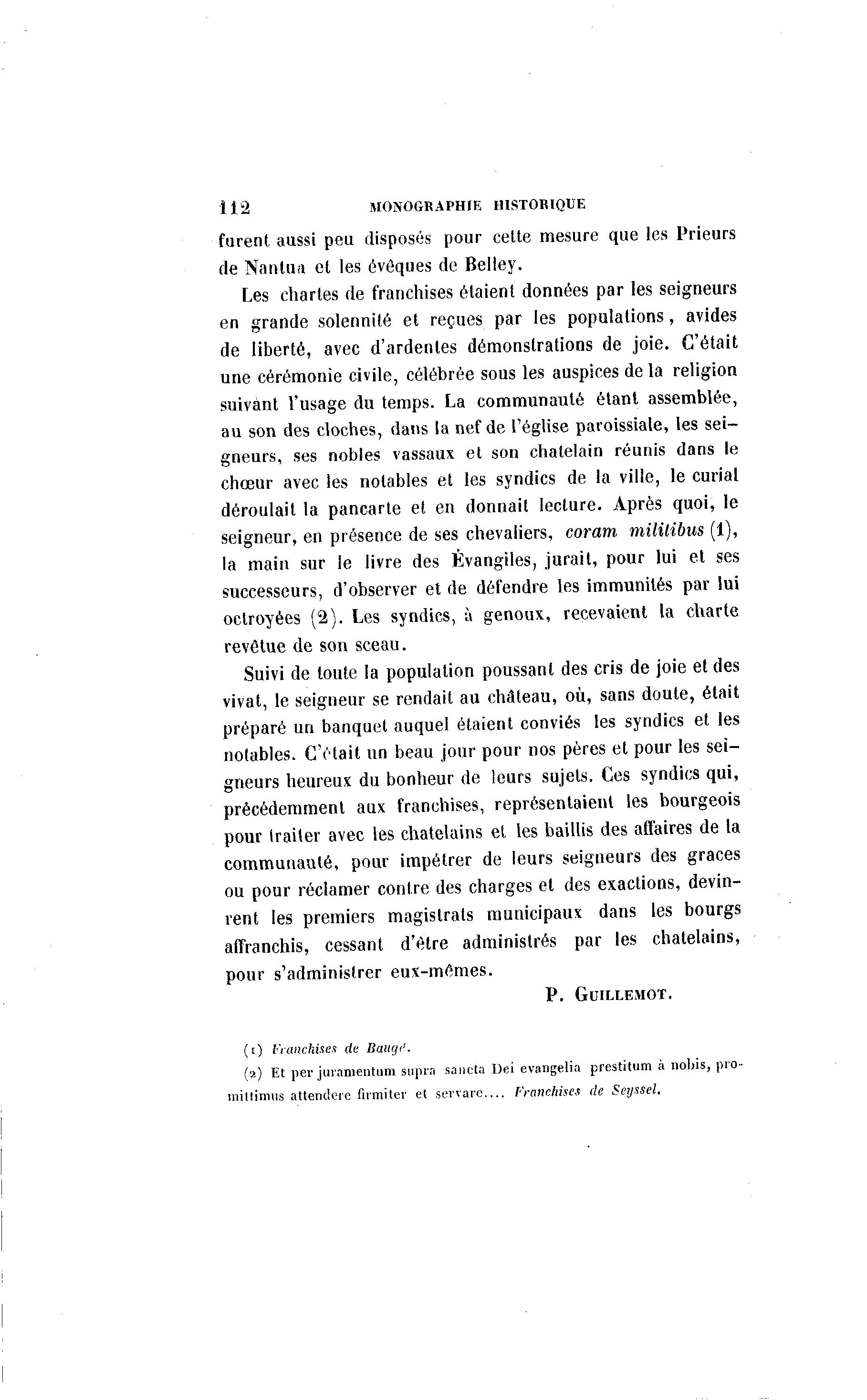112 MONOGRAPHIE HISTORIQUE furent aussi peu disposés pour cette mesure que les Prieurs de Nantun et les évoques de Belley. Les chartes de franchises étaient données par les seigneurs en grande solennité et reçues par les populations, avides de liberté, avec d'ardentes démonstrations de joie. C'était une cérémonie civile, célébrée sous les auspices de la religion suivant l'usage du temps. La communauté étant assemblée, au son des cloches, flans la nef de l'église paroissiale, les sei- gneurs, ses nobles vassaux et son châtelain réunis dans le chœur avec les notables et les syndics de la ville, le curial déroulait la pancarte et en donnait lecture. Après quoi, le seigneur, en présence de ses chevaliers, coram militibus (1), la main sur le livre des Évangiles, jurait, pour lui et ses successeurs, d'observer et de défendre les immunités par lui octroyées (2). Les syndics, à genoux, recevaient la charte revêtue de son sceau. Suivi de toute la population poussant des cris de joie et des vivat, le seigneur se rendait au château, où, sans doute, était préparé un banquet auquel étaient conviés les syndics et les notables. C'était un beau jour pour nos pères et pour les sei- gneurs heureux du bonheur de leurs sujets. Ces syndics qui, précédemment aux franchises, représentaient les bourgeois pour traiter avec les châtelains et les baillis des affaires de la communauté, pour impétrer de leurs seigneurs des grâces ou pour réclamer contre des charges et des exactions, devin- vent les premiers magistrats municipaux dans les bourgs affranchis, cessant d'être administrés par les châtelains, pour s'administrer eux-mêmes. P. GUILLEMOT. (i) Franchises de Baugi'. (2) Et perjuramentum supra sancta Dei evangelia prestitum à nobis, pro- millimus attendcre firmiter el servare Franchises de Sajssel.