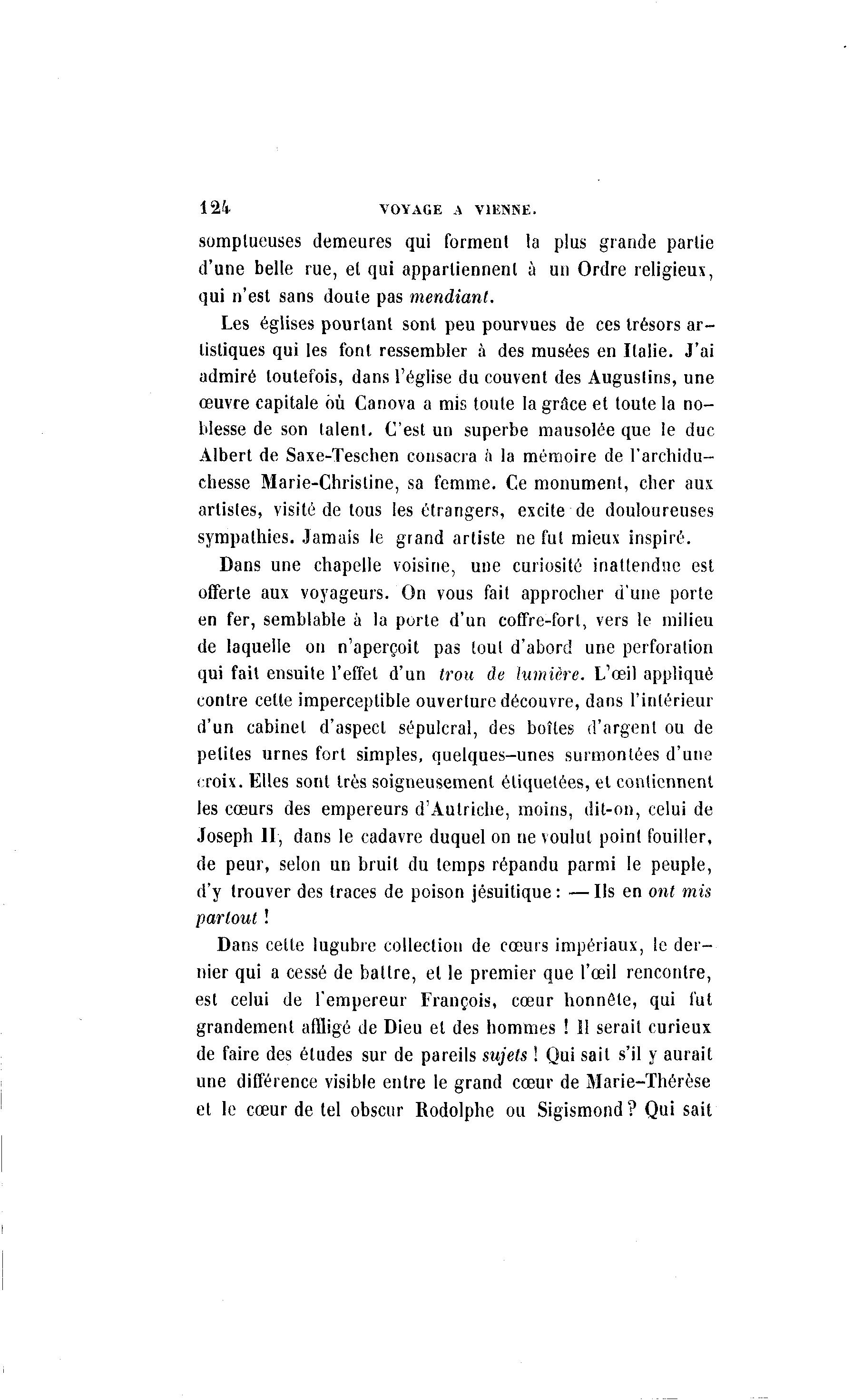 124 VOYAGE A VIENNE. somptueuses demeures qui forment la plus grande partie d'une belle rue, et qui appartiennent à un Ordre religieux, qui n'est sans doute pas mendiant. Les églises pourtant sont peu pourvues de ces trésors a r - tistiques qui les font ressembler à des musées en Italie. J'ai admiré toutefois, dans l'église du couvent des Auguslins, une œuvre capitale où Canova a mis toute la grâce et toute la no- blesse de son talent. C'est un superbe mausolée que le duc Albert de Saxe-Teschen consacra à la mémoire de l'archidu- chesse Marie-Christine, sa femme. Ce monument, cher aux artistes, visité de tous les étrangers, excite de douloureuses sympathies. Jamais le grand artiste ne fut mieux inspiré. Dans une chapelle voisine, une curiosité inattendue est offerte aux voyageurs. On vous fait approcher d'une porte en fer, semblable à la porte d'un coffre-fort, vers le milieu de laquelle on n'aperçoit pas tout d'abord une perforation qui fait ensuite l'effet d'un trou de lumière. L'œil appliqué contre cette imperceptible ouverture découvre, dans l'intérieur d'un cabinet d'aspect sépulcral, des boîtes d'argent ou de petites urnes fort simples, quelques-unes surmontées d'une croix. Elles sont très soigneusement étiquetées, et contiennent les cœurs des empereurs d'Autriche, moins, dit-on, celui de Joseph H, dans le cadavre duquel on ne voulut point fouiller, de peur, selon un bruit du temps répandu parmi le peuple, d'y trouver des traces de poison jésuitique : — Ils en ont mis partout ! Dans cette lugubre collection de cœurs impériaux, le der- nier qui a cessé de battre, et le premier que l'œil rencontre, est celui de l'empereur François, cœur honnôle, qui fut grandement affligé de Dieu et des hommes ! 11 serait curieux de faire des études sur de pareils sujets ! Qui sait s'il y aurait une différence visible entre le grand cœur de Marie-Thérèse et le cœur de tel obscur Rodolphe ou Sigismond ? Qui sait