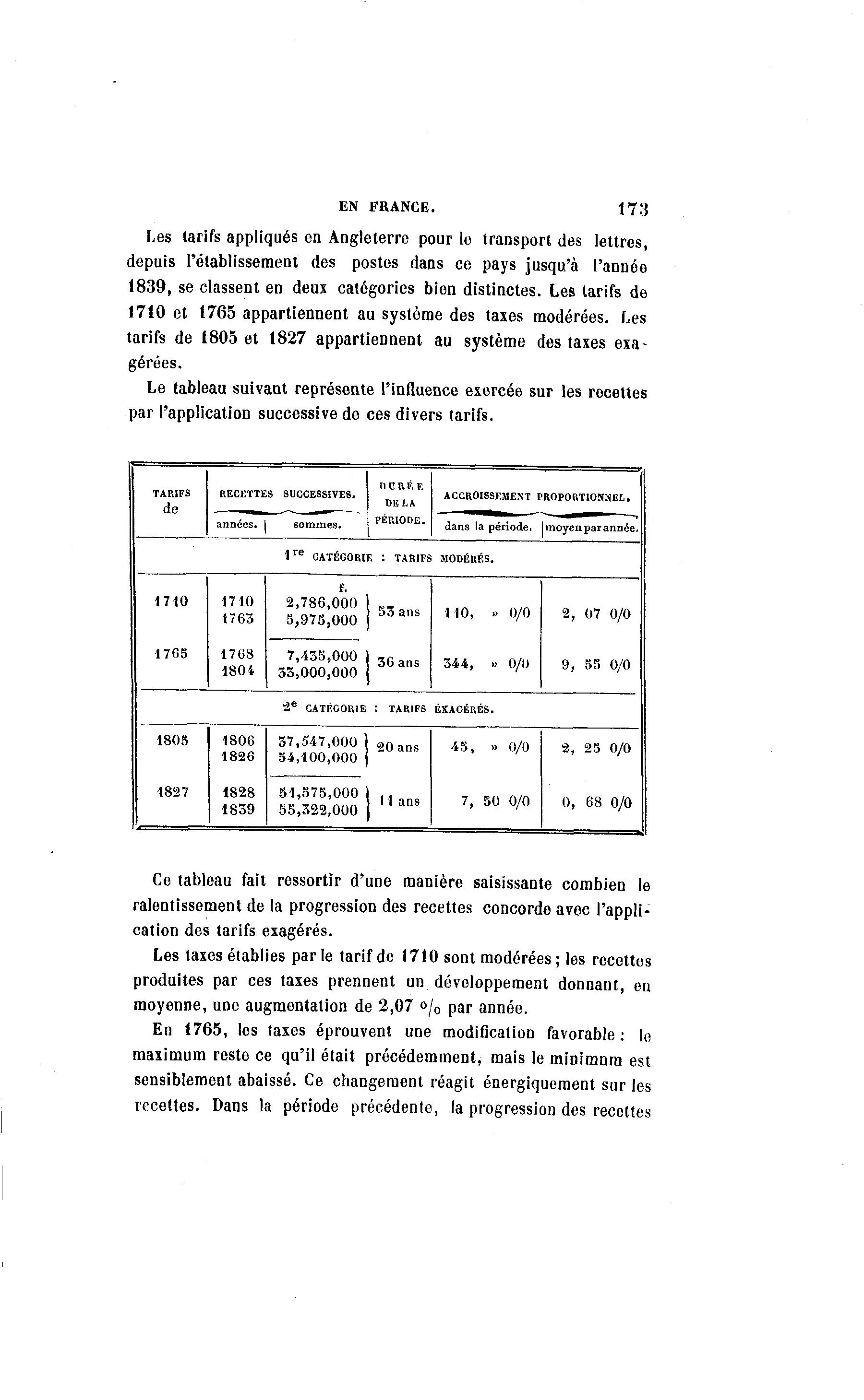 EN FRANCE. 173 Les tarifs appliqués en Angleterre pour le transport des lettres, depuis rétablissement des postes dans ce pays jusqu'à l'année 1839, se classent en deux catégories bien distinctes. Les tarifs de 1710 et 1765 appartiennent au système des taxes modérées. Les tarifs de 1805 et 1827 appartiennent au système des taxes exa- gérées. Le tableau suivant représente l'influence exercée sur les recettes par l'application successive de ces divers tarifs. DCREE TARIFS RECETTES SUCCESSIVES. ACCROISSEMENT PROPORTIONNEL, DELA de PÉRIODE. d a n s la p é r i o d e , [moyenparannée. 1re CATÉGORIE : TARIFS MODÉRÉS. 1710 1710 2,786,000 2, 07 0/0 53 ans 110, » 0/0 1763 5,975,000 1765 1768 7,435,000 | 3 6 a n s 344, » 0/0 9, 55 0/0 180i 33,000,000 ' e 2 CATÉC0R1E : TARIFS EXAGÉRÉS. 1805 1806 37,547,000 15, » 0/0 2, 25 0/0 1826 20 ans 54,100,000 1827 1828 51,575,000 1 . , 7, 50 0/0 0, 68 0/0 1839 55,322,000 ' Ce tableau fait ressortir d'une manière saisissante combien le ralentissement de la progression des recettes concorde avec l'appli- cation des tarifs exagérés. Les taxes établies parle tarif de 1710 sont modérées ; les recettes produites par ces taxes prennent un développement donnant, en moyenne, une augmentation de 2,07 o/0 par année. En 1765, les taxes éprouvent une modification favorable : lo maximum reste ce qu'il était précédemment, mais le minimum est sensiblement abaissé. Ce changement réagit énergiquoment sur les recettes. Dans la période précédente, la progression des recettes