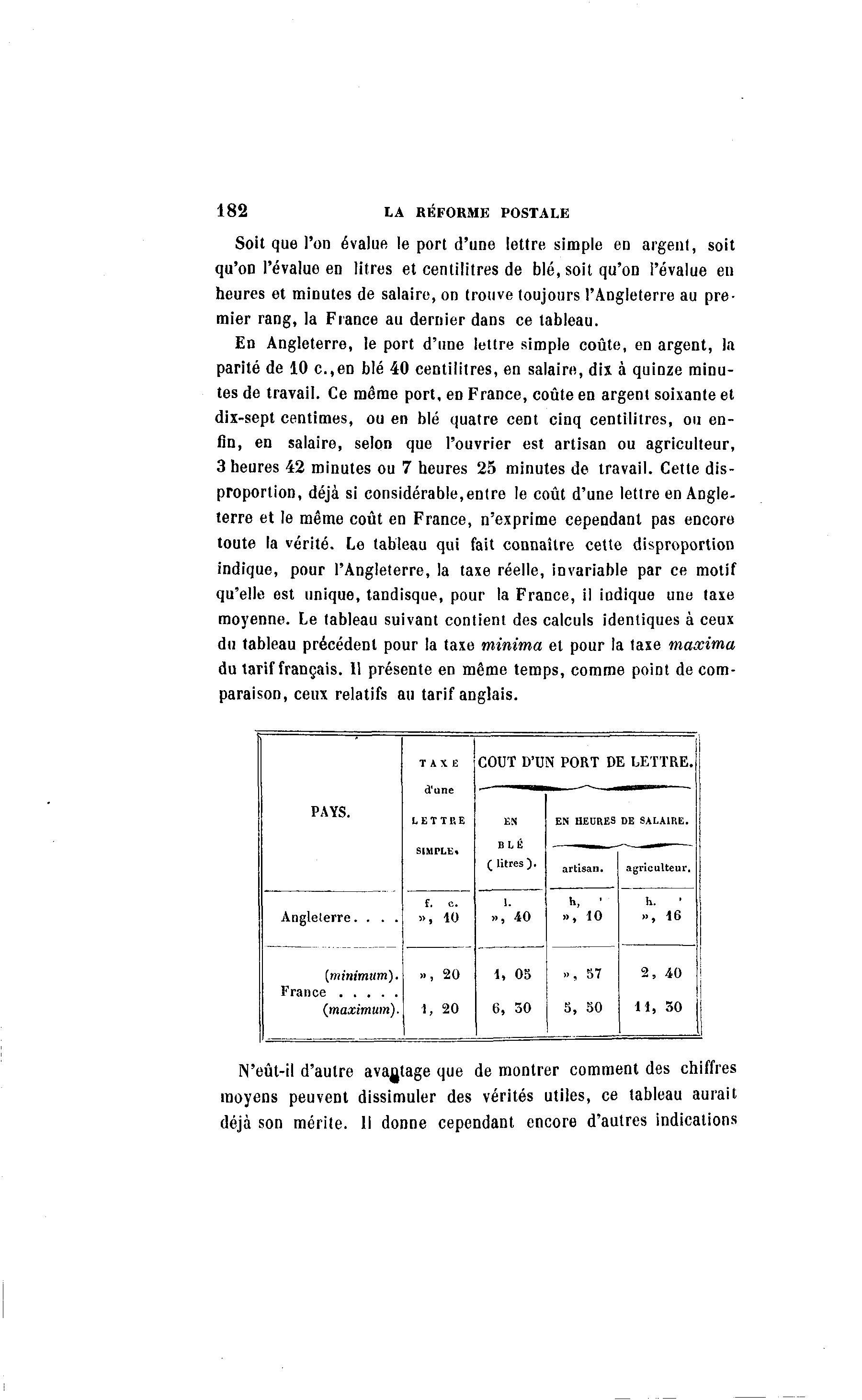 182 LA REFORME POSTALE Soit que l'on évalue le port d'une lettre simple en argent, soit qu'on l'évalue en litres et centilitres de blé, soit qu'on l'évalue en heures et minutes de salaire, on trouve toujours l'Angleterre au pre- mier rang, la France au dernier dans ce tableau. En Angleterre, le port d'une lettre simple coûte, en argent, la parité de 10 c.,en blé 40 centilitres, en salaire, dix à quinze minu- tes de travail. Ce même port, en France, coûte en argent soixante et dix-sept centimes, ou en blé quatre cent cinq centilitres, ou en- fin, en salaire, selon que l'ouvrier est artisan ou agriculteur, 3 heures 42 minutes ou 7 heures 25 minutes de travail. Cette dis- proportion, déjà si considérable,entre le coût d'une lettre en Angle- terre et le même coût en France, n'exprime cependant pas encore toute la vérité. Le tableau qui fait connaître cette disproportion indique, pour l'Angleterre, la taxe réelle, invariable par ce motif qu'elle est unique, tandisque, pour la France, il indique une taxe moyenne. Le tableau suivant contient des calculs identiques à ceux du tableau précédent pour la taxe minima et pour la taxe tnaœima du tarif français. 11 présente en même temps, comme point de com- paraison, ceux relatifs au tarif anglais. TAXE COUT D'UN PORT DE LETTRE, d'une PAYS. LETTRE ES EN HEURES DE SALAIRE. BLÉ SIMPLE, ( litres). agriculteur. f. o. 1. h, ' h. Angleterre. . », 10 », 40 », 10 », 16 (minimum). », 20 1, 05 », 57 2 , 40 France {maximum). 1, 20 6, 30 5, 50 11, 30 N'eût-il d'autre avantage que de montrer comment des chiffres moyens peuvent dissimuler des vérités utiles, ce tableau aurait déjà son mérite. Il donne cependant encore d'autres indications