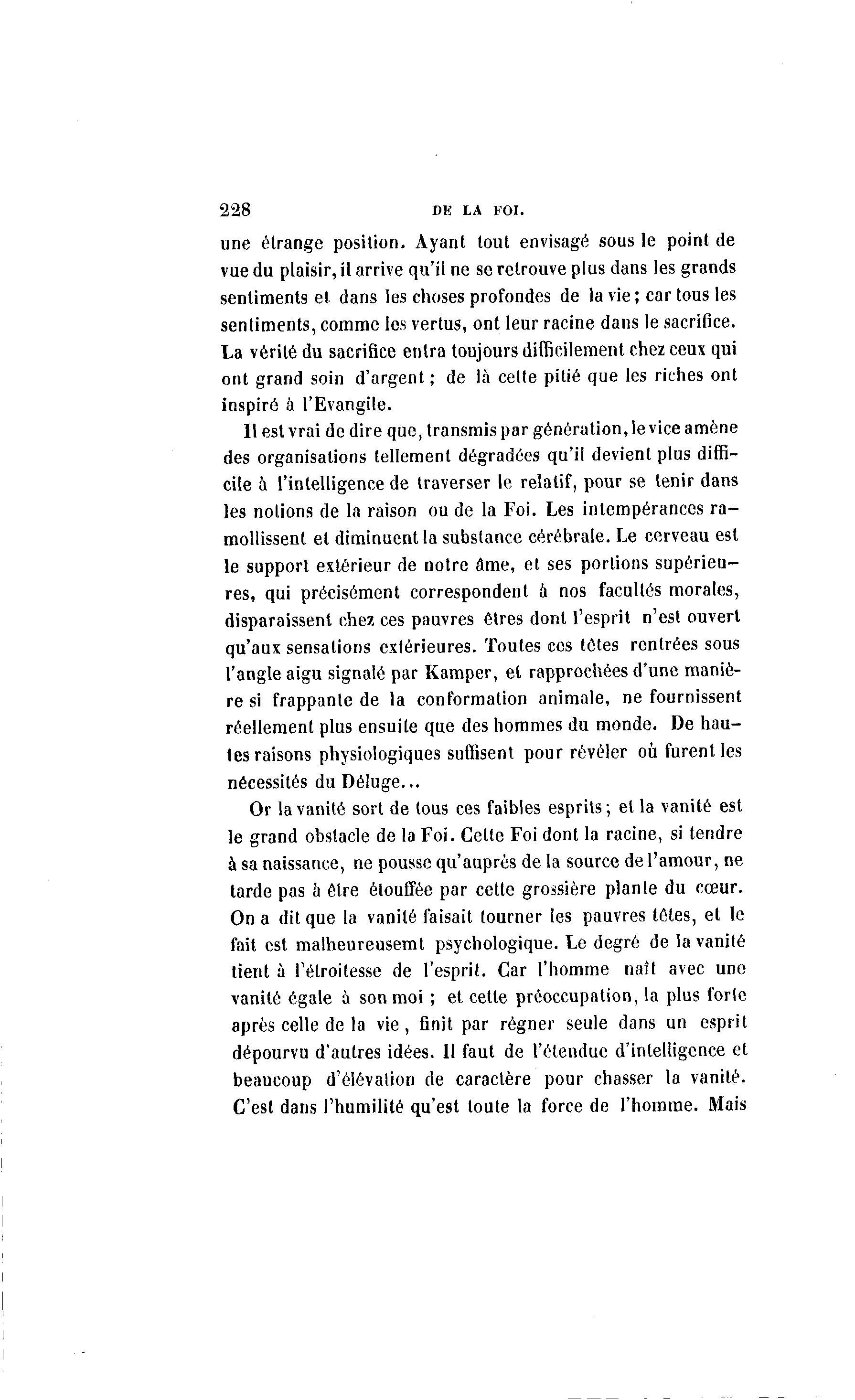 228 DE LA FOI. une étrange position. Ayant tout envisagé sous le point de vue du plaisir, il arrive qu'il ne se retrouve plus dans les grands sentiments et dans les choses profondes de la vie ; car tous les sentiments, comme les vertus, ont leur racine dans le sacrifice. La vérité du sacrifice entra toujours difficilement chez ceux qui ont grand soin d'argent; de là celte pitié que les riches ont inspiré à l'Evangile. Il est vrai de dire que, transmis par génération,le vice amène des organisations tellement dégradées qu'il devient plus diffi- cile à l'intelligence de traverser le relatif, pour se tenir dans les notions de la raison ou de la Foi. Les intempérances r a - mollissent et diminuent la substance cérébrale. Le cerveau est le support extérieur de notre âme, et ses portions supérieu- res, qui précisément correspondent à nos facultés morales, disparaissent chez ces pauvres êtres dont l'esprit n'est ouvert qu'aux sensations exlérieures. Toutes ces têtes rentrées sous l'angle aigu signalé par Kamper, et rapprochées d'une maniè- re si frappante de la conformation animale, ne fournissent réellement plus ensuite que des hommes du monde. De hau- tes raisons physiologiques suffisent pour révéler où furent les nécessités du Déluge... Or la vanité sort de tous ces faibles esprits; et la vanité est le grand obstacle de la Foi. Cette Foi dont la racine, si tendre à sa naissance, ne pousse qu'auprès de la source de l'amour, ne tarde pas à être étouffée par cette grossière planle du cœur. On a dit que la vanité faisait tourner les pauvres têtes, et le fait est malheureusemt psychologique. Le degré de la vanité tient à l'étroitesse de l'esprit. Car l'homme naît avec une vanité égale à son moi ; et cette préoccupation, la plus forte après celle de la vie, finit par régner seule dans un esprit dépourvu d'autres idées. Il faut de l'étendue d'intelligence et beaucoup d'élévation de caractère pour chasser la vanité. C'est dans l'humilité qu'est toute la force de l'homme. Mais