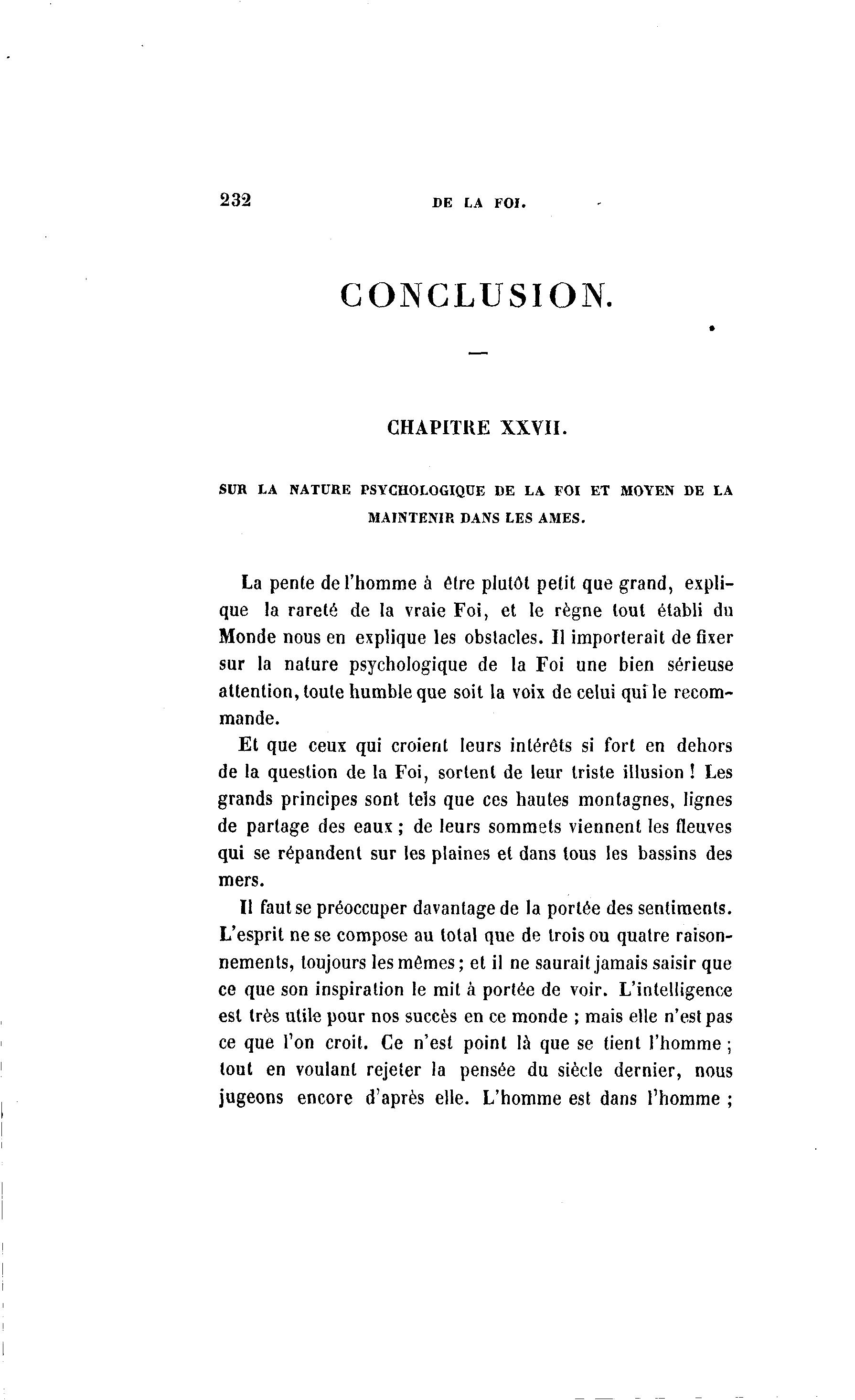 232 DE LA FOI. CONCLUSION. CHAPITRE XXVII. SUR LA NATURE PSYCHOLOGIQUE DE LA FOI ET MOYEN DE LA MAINTENIR DANS LES AMES. La pente de l'homme à être plutôt petit que grand, expli- que la rareté de la vraie Foi, et le règne loul établi du Monde nous en explique les obslacles. Il importerait de fixer sur la nature psychologique de la Foi une bien sérieuse attention, toute humble que soit la voix de celui qui le recom- mande. Et que ceux qui croient leurs intérêts si fort en dehors de la question de la Foi, sortent de leur triste illusion ! Les grands principes sont tels que ces hautes montagnes, lignes de partage des eaux ; de leurs sommets viennent les fleuves qui se répandent sur les plaines et dans tous les bassins des mers. Il faut se préoccuper davantage de la portée des sentiments. L'esprit ne se compose au total que de trois ou quatre raison- nements, toujours les mêmes ; et il ne saurait jamais saisir que ce que son inspiration le mit à portée de voir. L'intelligence esl très utile pour nos succès en ce monde ; mais elle n'est pas ce que l'on croit. Ce n'est point là que se tient l'homme ; tout en voulant rejeter la pensée du siècle dernier, nous jugeons encore d'après elle. L'homme est dans l'homme ;