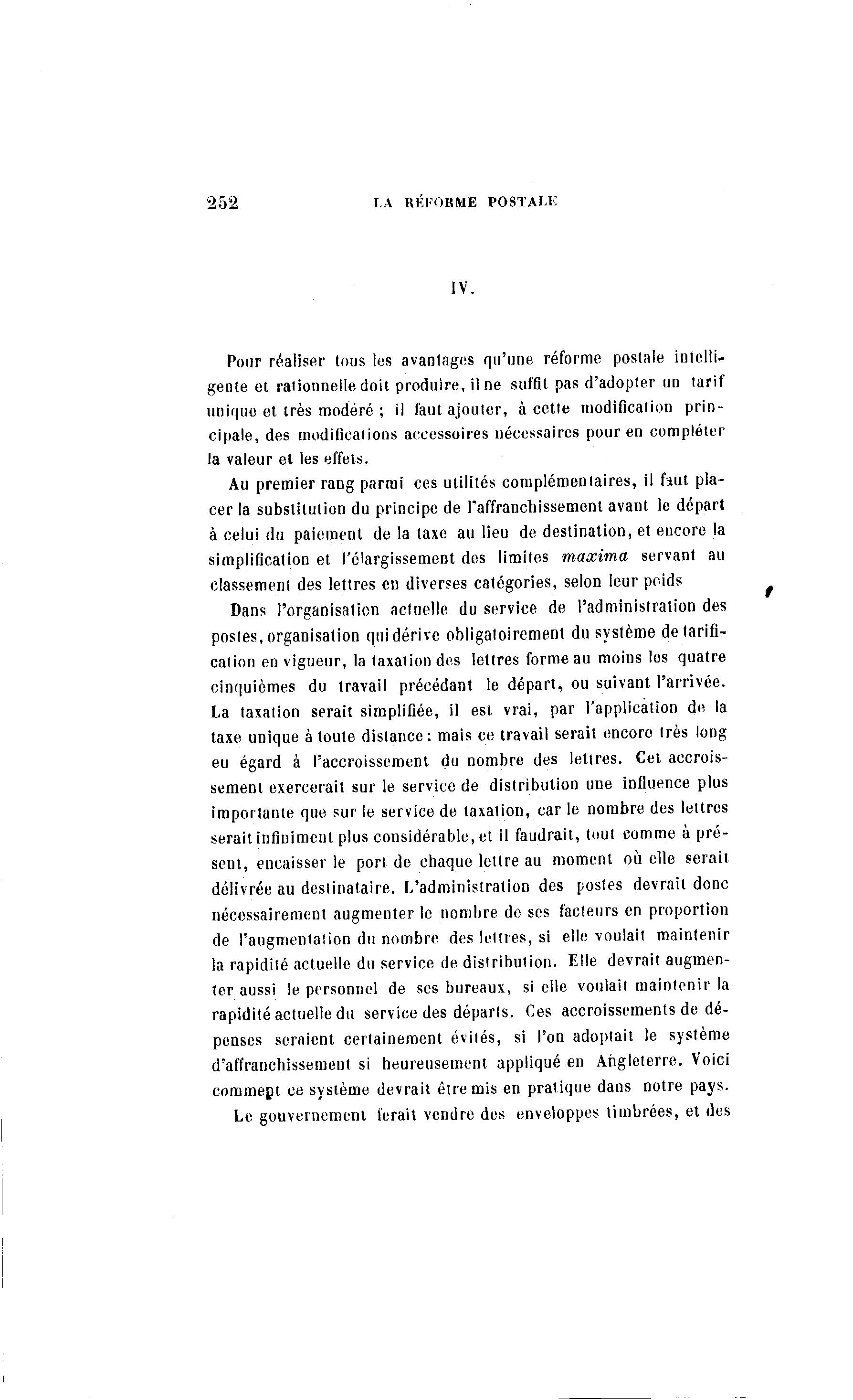 252 LA REFORME POSTAMi IV. Pour réaliser tous les avantages qu'une réforme postale intelli- gente et rationnelle doit produire, il ne suffit pas d'adopter un tarif unique et très modéré ; il faut ajouter, à cette modification prin- cipale, des modifications accessoires nécessaires pour en compléter la valeur et les effets. Au premier rang parmi ces utilités complémentaires, il faut pla- cer la substitution du principe de l'affranchissement avant le départ à celui du paiement de la taxe au lieu de destination, et encore la simplification et l'élargissement des limites maxima servant au classement des lettres en diverses catégories, selon leur poids Dans l'organisation actuelle du service de l'administration des postes, organisation qui dérive obligatoirement du système de tarifi- cation en vigueur, la taxation des lettres forme au moins les quatre cinquièmes du travail précédant le départ, ou suivant l'arrivée. La taxation serait simplifiée, il est vrai, par l'application de la taxe unique à toute distance: mais ce travail serait encore très long eu égard à l'accroissement du nombre des lettres. Cet accrois- sement exercerait sur le service de distribution une influence plus importante que sur le service de taxation, car le nombre des lettres serait infiniment plus considérable, et il faudrait, tout comme à pré- sent, encaisser le port de chaque lettre au moment où elle serait délivrée au destinataire. L'administration des postes devrait donc nécessairement augmenter le nombre de ses facteurs en proportion de l'augmentation du nombre des lettres, si elle voulait maintenir la rapidité actuelle du service de distribution. Elle devrait augmen- ter aussi le personnel de ses bureaux, si elle voulait maintenir la rapidité actuelle du service des départs. Ces accroissements de dé- penses seraient certainement évités, si l'on adoptait le système d'affranchissement si heureusement appliqué en Angleterre. Voici comment ce système devrait être mis en pratique dans notre pays. Le gouvernement ferait vendre des enveloppes timbrées, et des
