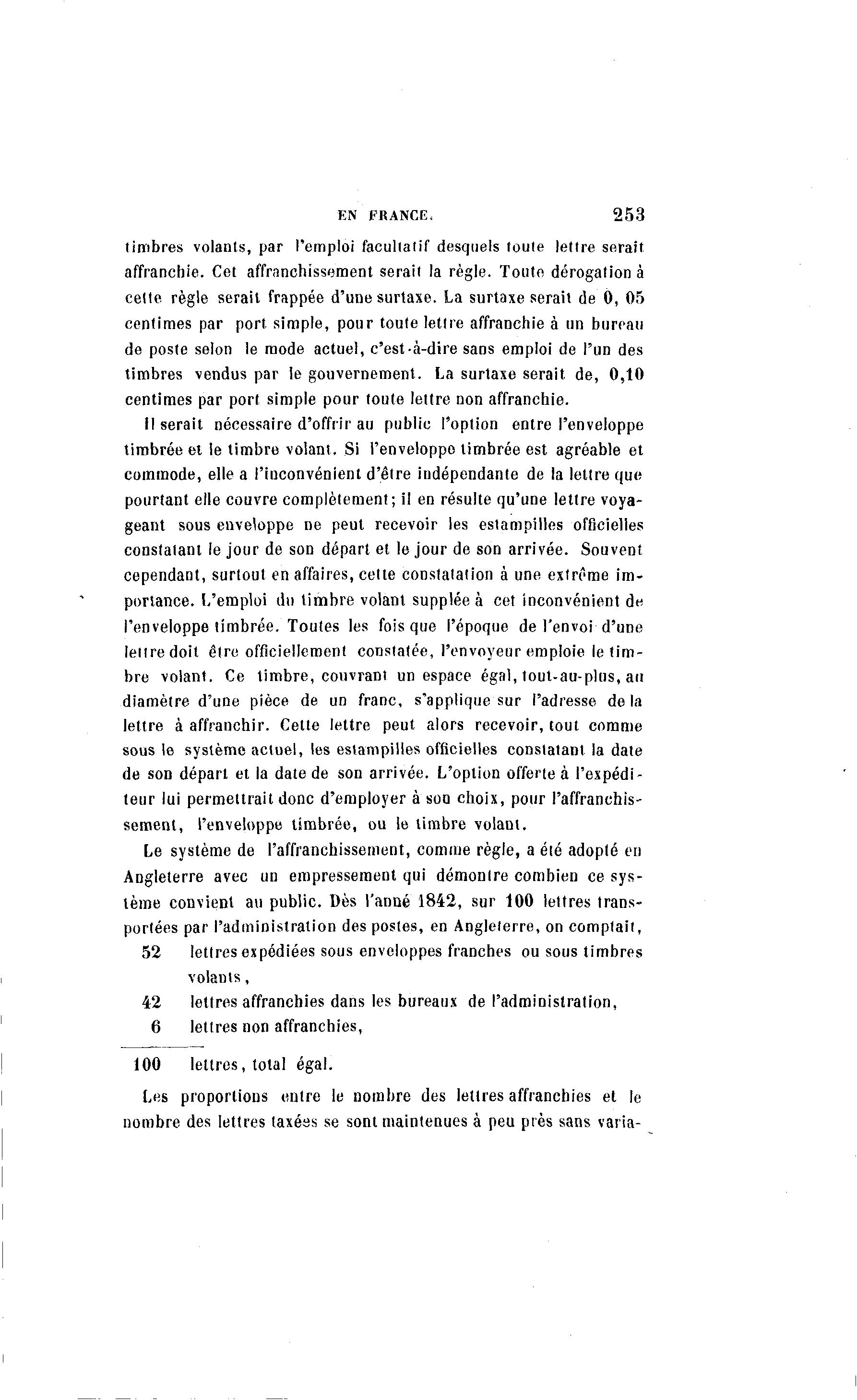 EN FRANCE, 253 timbres volants, par l'emploi facultatif desquels toute lettre serait affranchie. Cet affranchissement serait la règle. Toute dérogation à celte règle serait frappée d'une surtaxe. La surtaxe serait de 0, 05 centimes par port simple, pour toute lettre affranchie à un bureau de poste selon le mode actuel, c'est-à -dire sans emploi de l'un des timbres vendus par le gouvernement. La surtaxe serait de, 0,10 centimes par port simple pour toute lettre non affranchie. Il serait nécessaire d'offrir au public l'option entre l'enveloppe timbrée et le timbre volant. Si l'enveloppo timbrée est agréable et commode, elle a l'inconvénient d'être indépendante de la lettre que pourtant elle couvre complètement; il en résulte qu'une lettre voya- geant sous enveloppe ne peut recevoir les estampilles officielles constatant le jour de son départ et le jour de son arrivée. Souvent cependant, surtout en affaires, cette constatation à une extrême im- portance. L'emploi du timbre volant supplée à cet inconvénient de l'enveloppe timbrée. Toutes les fois que l'époque de l'envoi d'une lettre doit être officiellement constatée, l'envoyeur emploie le tim- bre volant. Ce timbre, couvrant un espace égal, tout-au-plus, au diamètre d'une pièce de un franc, s'applique sur l'adresse de la lettre à affranchir. Cette lettre peut alors recevoir, tout comme sous le syslèmo actuel, les estampilles officielles constatant la date de son départ et la date de son arrivée. L'option offerte à l'expédi- teur lui permettrait donc d'employer à son choix, pour l'affranchis- sement, l'enveloppe timbrée, ou le timbre volant. Le système de l'affranchissement, comme règle, a été adopté en Angleterre avec un empressement qui démontre combien ce sys- tème convient au public. Dès l'anné 1842, sur 100 lettres trans- portées par l'administration des postes, en Angleterre, on comptait, 52 lettres expédiées sous enveloppes franches ou sous timbres volants, 42 lettres affranchies dans les bureaux de l'administration, 6 lettres non affranchies, 100 lettres, total égal. Les proportions entre le nombre des lettres affranchies et le nombre des lettres taxées se sont maintenues à peu près sans varia-