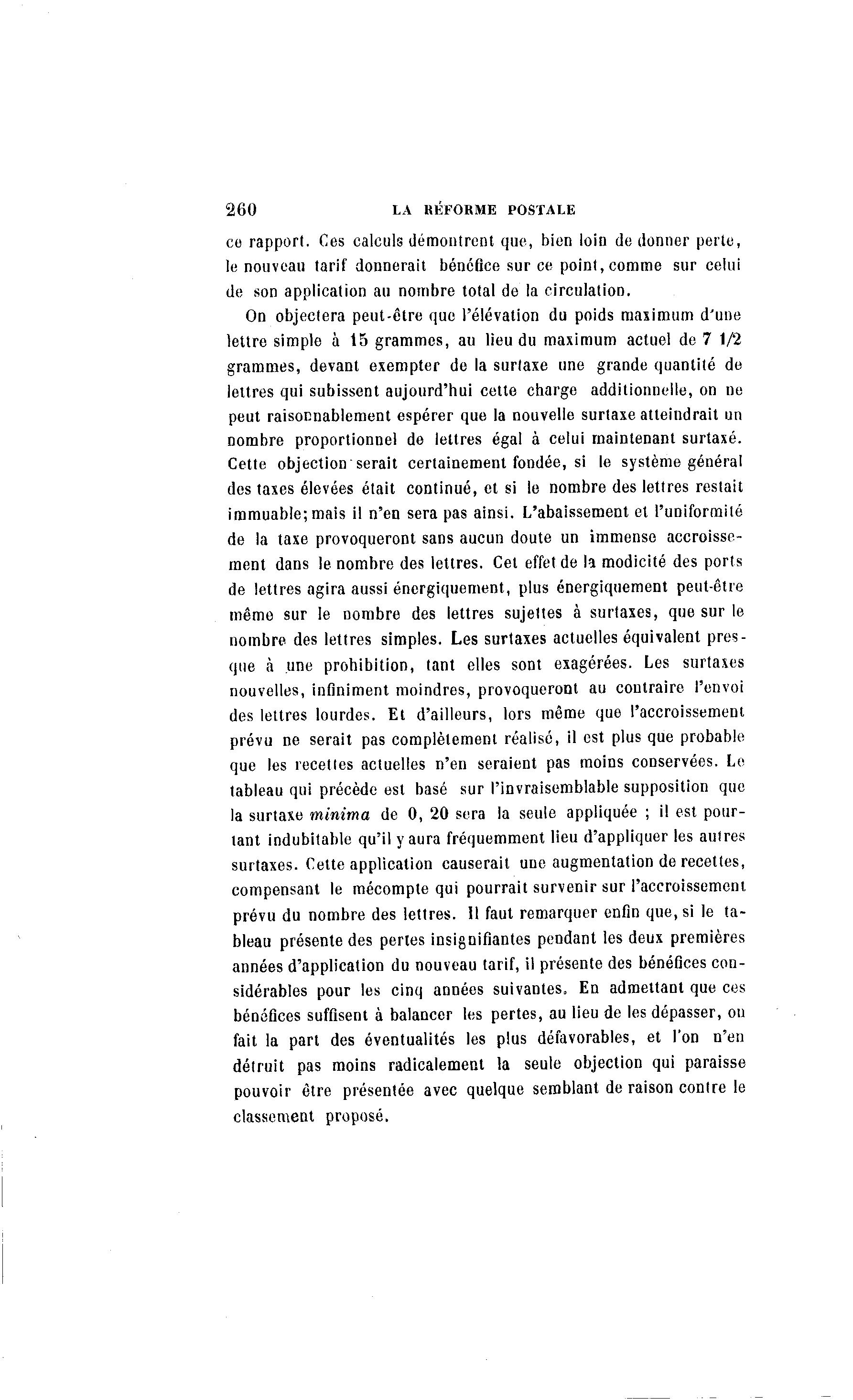 260 LA RÉFORME POSTALE ce rapport. Ces calculs démontrent que, bien loin de donner perte, le nouveau tarif donnerait bénéfice sur ce point, comme sur celui de son application au nombre total de la circulation. On objectera peut-être que l'élévation du poids maximum d'une lettre simple à 15 grammes, au lieu du maximum actuel de 7 1/2 grammes, devant exempter de la surtaxe une grande quantité de lettres qui subissent aujourd'hui cette charge additionnelle, on ne peut raisonnablement espérer que la nouvelle surtaxe atteindrait un nombre proportionnel de lettres égal à celui maintenant surtaxé. Cette objection serait certainement fondée, si le système général des taxes élevées était continué, et si le nombre des lettres restait immuable; mais il n'en sera pas ainsi. L'abaissement et l'uniformité de la taxe provoqueront sans aucun doute un immense accroisse- ment dans le nombre des lettres. Cet effet de la modicité des ports de lettres agira aussi énergiquement, plus énergiquement peut-être même sur le nombre des lettres sujettes à surtaxes, que sur le nombre des lettres simples. Les surtaxes actuelles équivalent pres- que à une prohibition, tant elles sont exagérées. Les surtaxes nouvelles, infiniment moindres, provoqueront au contraire l'envoi des lettres lourdes. Et d'ailleurs, lors même que l'accroissement prévu ne serait pas complètement réalise, il est plus que probable que les recettes actuelles n'en seraient pas moins conservées. Le tableau qui précède est basé sur l'invraisemblable supposition que la surtaxe minima de 0, 20 sera la seule appliquée ; il est pour- tant indubitable qu'il y aura fréquemment lieu d'appliquer les autres surtaxes. Cette application causerait une augmentation de recettes, compensant le mécompte qui pourrait survenir sur l'accroissement prévu du nombre des lettres. Il faut remarquer enfin que, si le ta- bleau présente des pertes insignifiantes pendant les deux premières années d'application du nouveau tarif, il présente des bénéfices con- sidérables pour les cinq années suivantes. En admettant que ces bénéfices suffisent à balancer les pertes, au lieu de les dépasser, on fait la part des éventualités les plus défavorables, et l'on n'en détruit pas moins radicalement la seule objection qui paraisse pouvoir être présentée avec quelque semblant de raison contre le classement proposé.