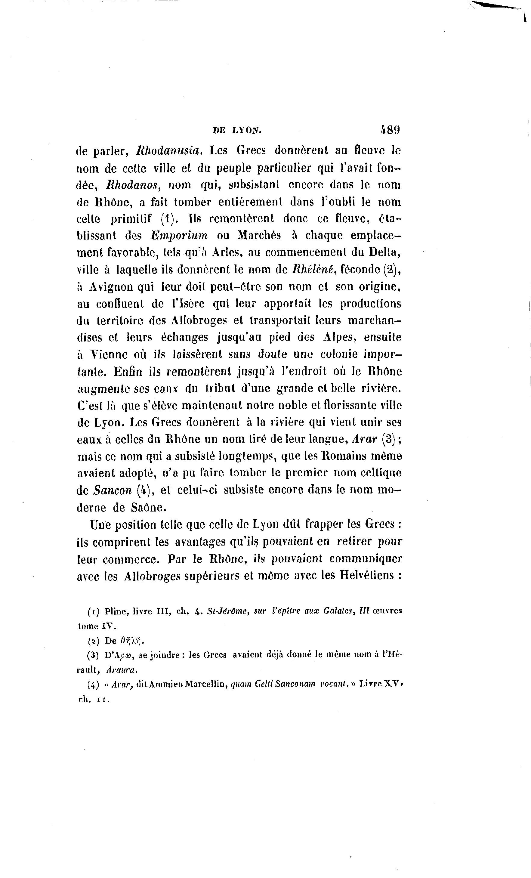 DE LVOlV. 489 de parler, Rhodanusia. Les Grecs donnèrent au fleuve le nom de cette ville et du peuple particulier qui l'avait fon- dée, Rhodanos, nom qui, subsistant encore dans le nom de Rhône, a fait tomber entièrement dans l'oubli le nom celte primitif (1). Ils remontèrent donc ce fleuve, éta- blissant des Emporium ou Marchés à chaque emplace- ment favorable, tels qu'à Arles, au commencement du Delta, ville à laquelle ils donnèrent le nom de Rhélènê, féconde (2), à Avignon qui leur doit peut-être son nom et son origine, au confluent de l'Isère qui leur apportait les productions du territoire des Allobroges et transportait leurs marchan- dises et leurs échanges jusqu'au pied des Alpes, ensuite à Vienne où ils laissèrent sans doute une colonie impor- tante. Enfin ils remontèrent jusqu'à l'endroit où le Rhône augmente ses eanx du tribut d'une grande et belle rivière. C'est là que s'élève maintenaut notre noble et florissante ville de Lyon. Les Grecs donnèrent à la rivière qui vient unir ses eaux à celles du Rhône un nom tiré de leur langue, Arar (3) ; mais ce nom qui a subsisté longtemps, que les Romains même avaient adopté, n'a pu faire tomber le premier nom celtique de Sancon (4), et celui-ci subsiste encore dans le nom mo- derne de Saône. Une position telle que celle de Lyon dût frapper les Grecs : ils comprirent les avantages qu'ils pouvaient en retirer pour leur commerce. Par le Rhône, ils pouvaient communiquer avec les Allobroges supérieurs et môme avec les Helvétiens : (t) Pline, livre III, ch. 4. St-JirCme, sur l'ttpilre aux Galettes, III œuvres tome IV. (a) De ÔT)).*;. (3) D'AjO», se joindre : les Grecs avaient déjà donné le même nom à l'Hé- rault, Araura. (4) « Arar, ditAmmieii Marcellin, quarn GeltiSanconam vocant.» LivreXV> ch. 11.