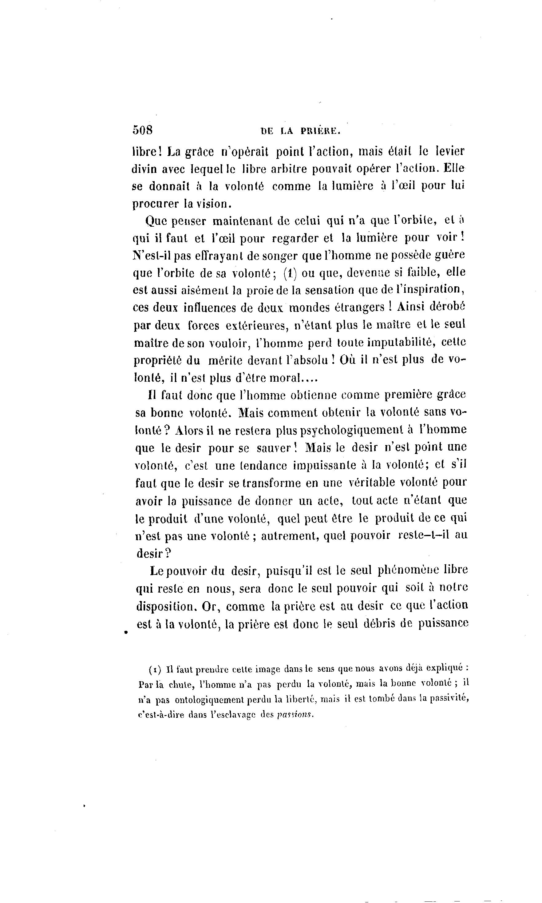 508 DE LA PRIERE. libre! La grâce n'opérait point l'action, mais était le levier divin avec lequel le libre arbitre pouvait opérer l'action. Elle se donnait à la volonté comme la lumière à l'œil pour lui procurer la vision. Que penser maintenant de celui qui n'a que l'orbite, et ii qui il faut et l'œil pour regarder et la lumière pour voir ! N'esl-il pas effrayant de songer que l'homme ne possède guère que l'orbite de sa volonté; (1) ou que, devenue si faible, elle est aussi aisément la proie de la sensation que de l'inspiration, ces deux influences de deux mondes étrangers ! Ainsi dérobé par deux forces extérieures, n'étant plus le maître et le seul maître de son vouloir, l'homme perd toute imputabilité, cette propriété du mérite devant l'absolu ! Où il n'est plus de vo- lonté, il n'est plus d'être moral.... Il faut donc que l'homme obtienne comme première grâce sa bonne volonté. Mais comment obtenir la volonté sans vo- lonté? Alors il ne restera plus psychologiquement à l'homme que le désir pour se sauver! Mais le désir n'est point une volonté, c'est une tendance impuissante à la volonté; et s'il faut que le désir se transforme en une véritable volonté pour avoir la puissance de donner un acte, tout acte n'étant que le produit d'une volonté, quel peut être le produit de ce qui n'est pas une volonté ; autrement, quel pouvoir reste—t—il au désir? Le pouvoir du désir, puisqu'il est le seul phénomène libre qui reste en nous, sera donc le seul pouvoir qui soit à notre disposition. Or, comme la prière est au désir ce que l'action est à la volonté, la prière est donc ie seul débris de puissance (i) Il faut prendre celte image dans le sens que nous avons déjà expliqué : Par la chute, l'homme n'a pas perdu la volonté, mais la bonne volonté ; il n'a pas ontologiquement perdu la liberté, mais il est tombé dans la passivité, c'est-à -dire dans l'esclavage des pallions.