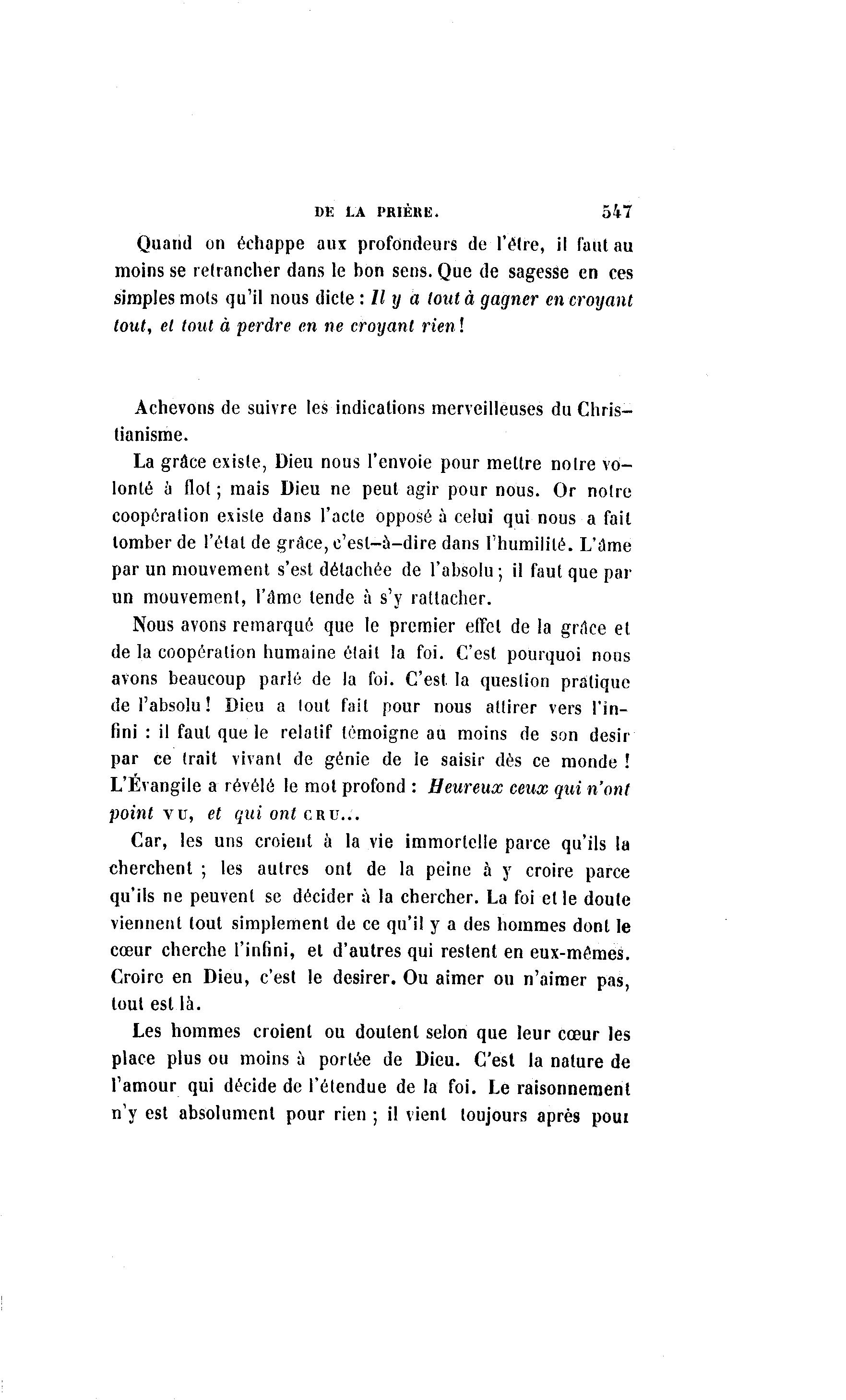 DE LA PRIÈRE. 547 Quand on échoppe aux profondeurs de l'être, il faut au moins se retrancher dans le bon sens. Que de sagesse en ces simples mots qu'il nous dicte : Il y a tout à gagner en croyant tout, et tout à perdre en ne croyant rien ! Achevons de suivre les indications merveilleuses du Chris- tianisme. La grâce existe, Dieu nous l'envoie pour mettre noire vo- lonté ù flot ; mais Dieu ne peut agir pour nous. Or notre coopération existe dans l'acte opposé à celui qui nous a fait tomber de l'état de grâce, c'est-à -dire dans l'humilité. L'âme par un mouvement s'est détachée de l'absolu ; il faut que par un mouvement, l'âme tende à s'y rattacher. Nous avons remarqué que le premier effet de la grâce et de la coopération humaine était la foi. C'est pourquoi nous avons beaucoup parlé de la foi. C'est. la question pratique de l'absolu! Dieu a tout fait pour nous attirer vers l'in- fini : il faut que le relatif témoigne au moins de son désir par ce trait vivant de génie de le saisir dès ce monde ! L'Évangile a révélé le mot profond : Heureux ceux qui n'ont point vu, et qui ont C R U . . . Car, les uns croient à la vie immortelle parce qu'ils la cherchent ; les aulres ont de la peine à y croire parce qu'ils ne peuvent se décider à la chercher. La foi elle doute viennent tout simplement de ce qu'il y a des hommes dont le cœur cherche l'infini, et d'autres qui restent en eux-mêmes. Croire en Dieu, c'est le désirer. Ou aimer ou n'aimer pas, tout est là . Les hommes croient ou doutent selon que leur cœur les place plus ou moins à portée de Dieu. C'est la nature de l'amour qui décide de l'étendue de la foi. Le raisonnement n'y est absolument pour rien ; il vient toujours après poui