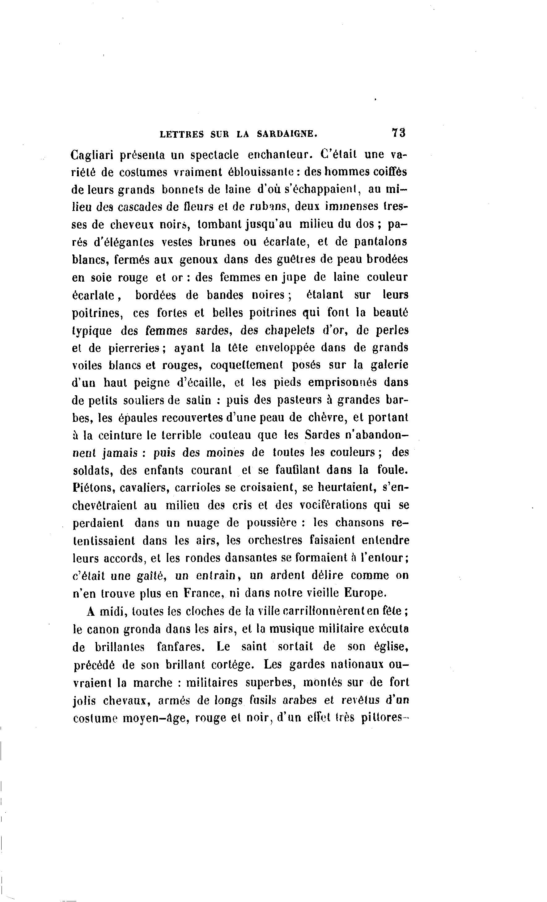 LETTRES SUR LA SARDAIGNE. 73 Cagliari présenta un spectacle enchanteur. C'était une va- riété de costumes vraiment éblouissante : des hommes coiffés de leurs grands bonnets de laine d'où s'échappaient, au mi- lieu des cascades de fleurs et de rubans, deux immenses tres- ses de cheveux noir», tombant jusqu'au milieu du dos ; pa- rés d'élégantes vestes brunes ou écarlate, et de pantalons blancs, fermés aux genoux dans des guêtres de peau brodées en soie rouge et or : des femmes en jupe de laine couleur écarlate, bordées de bandes noires ; étalant sur leurs poitrines, ces fortes et belles poitrines qui font la beauté typique des femmes sardes, des chapelets d'or, de perles et de pierreries ; ayant la tête enveloppée dans de grands voiles blancs et rouges, coquettement posés sur la galerie d'un haut peigne d'écaillé, et les pieds emprisonnés dans de petits souliers de satin : puis des pasteurs à grandes bar- bes, les épaules recouvertes d'une peau de chèvre, et portant ù la ceinture le terrible couteau que les Sardes n'abandon- nent jamais : puis des moines de toutes les couleurs ; des soldats, des enfants courant et se faufilant dans la foule. Piétons, cavaliers, carrioles se croisaient, se heurtaient, s'en- chevêtraient au milieu des cris et des vociférations qui se perdaient dans un nuage de poussière : les chansons re- tentissaient dans les airs, les orchestres faisaient entendre leurs accords, et les rondes dansantes se formaient a l'entour; c'était une gaîté, un entrain, un ardent délire comme on n'en trouve plus en France, ni dans notre vieille Europe. A midi, toutes les cloches de la ville carrillonnèrenten fête ; le canon gronda dans les airs, et la musique militaire exécuta de brillantes fanfares. Le saint sortait de son église, précédé de son brillant cortège. Les gardes nationaux ou- vraient la marche : militaires superbes, montés sur de fort jolis chevaux, armés de longs fusils arabes et revêtus d'un costume moyen-âge, rouge et noir, d'un elFet très pittores-