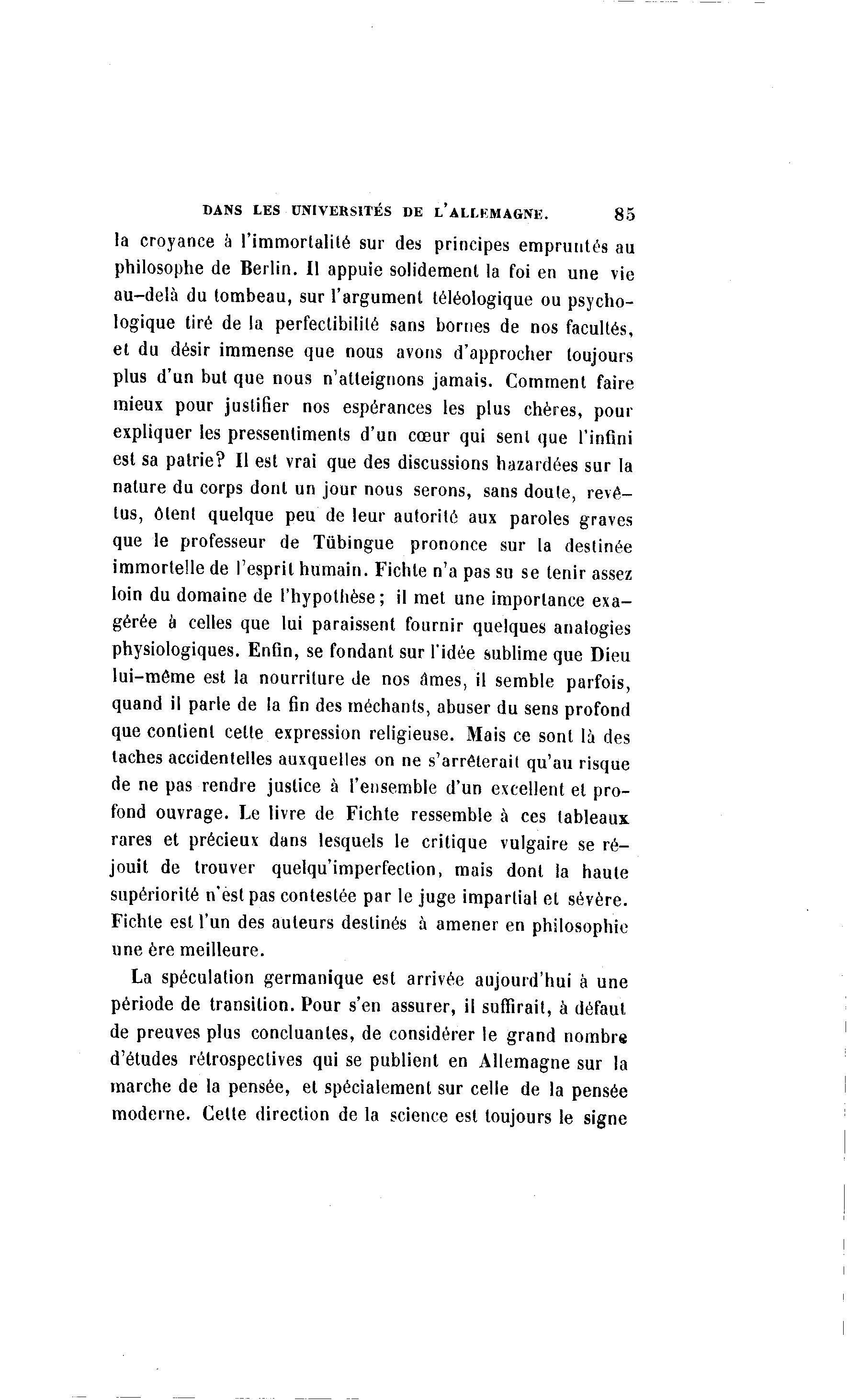 DANS LES UNIVERSITÉS DE L'ALLEMAGNE. 85 la croyance à l'immortalité sur des principes empruntés au philosophe de Berlin. Il appuie solidement la foi en une vie au-delà du tombeau, sur l'argument téléologique ou psycho- logique tiré de la perfectibilité sans bornes de nos facultés, et du désir immense que nous avons d'approcher toujours plus d'un but que nous n'atteignons jamais. Comment faire mieux pour justifier nos espérances les plus chères, pour expliquer les pressentiments d'un cœur qui sent que l'infini est sa patrie? Il est vrai que des discussions hazardées sur la nature du corps dont un jour nous serons, sans doute, revê- tus, ôlent quelque peu de leur autorité aux paroles graves que le professeur de Tûbingue prononce sur la destinée immortelle de l'esprit humain. Fichte n'a pas su se tenir assez loin du domaine de l'hypothèse; il met une importance exa- gérée a celles que lui paraissent fournir quelques analogies physiologiques. Enfin, se fondant sur l'idée sublime que Dieu lui-même est la nourriture de nos âmes, il semble parfois, quand il parle de la fin des méchants, abuser du sens profond que contient celte expression religieuse. Mais ce sont là des taches accidentelles auxquelles on ne s'arrêterait qu'au risque de ne pas rendre justice à l'ensemble d'un excellent et pro- fond ouvrage. Le livre de Fichte ressemble à ces tableaux rares et précieux dans lesquels le critique vulgaire se ré- jouit de trouver quelqu'imperfeclion, mais dont la haute supériorité n'est pas contestée par le juge impartial et sévère. Fichte est l'un des auteurs destinés à amener en philosophie une ère meilleure. La spéculation germanique est arrivée aujourd'hui à une période de transition. Pour s'en assurer, il suffirait, à défaut de preuves plus concluantes, de considérer le grand nombre d'études rétrospectives qui se publient en Allemagne sur la marche de la pensée, et spécialement sur celle de la pensée moderne. Celte direction de la science est toujours le signe