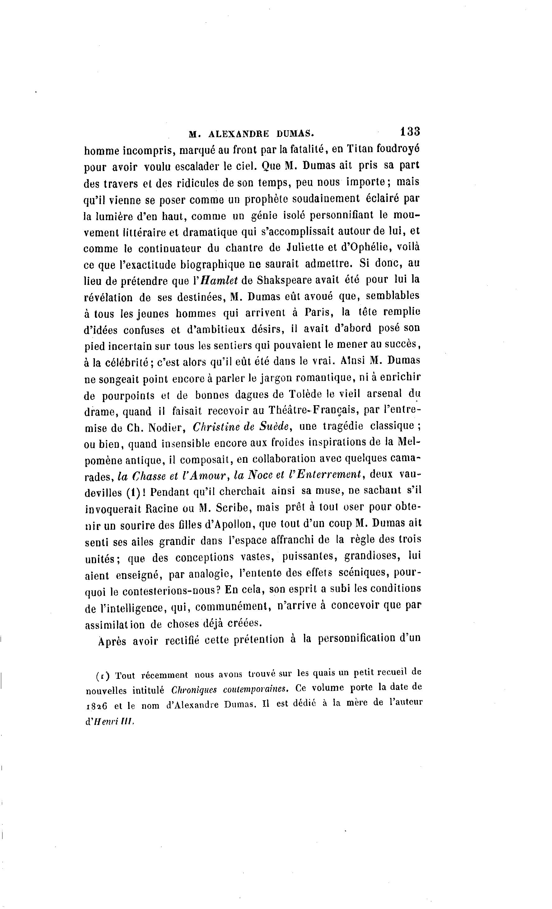 M. ALEXANDRE DUMAS. 133 homme incompris, marqué au front par la fatalité, en Titan foudroyé pour avoir voulu escalader le ciel. Que M. Dumas ait pris sa part des travers et des ridicules de son temps, peu nous importe; mais qu'il vienne se poser comme un prophète soudainement éclairé par la lumière d'en haut, comme un génie isolé personnifiant le mou- vement littéraire et dramatique qui s'accomplissait autour de lui, et comme le continuateur du chantre de Juliette et d'Ophélie, voilà ce que l'exactitude biographique ne saurait admettre. Si donc, au lieu de prétendre que VHamlet de Shakspeare avait été pour lui la révélation de ses destinées, M. Dumas eût avoué que, semblables à tous les jeunes hommes qui arrivent à Paris, la tête remplie d'idées confuses et d'ambitieux désirs, il avait d'abord posé son pied incertain sur tous les sentiers qui pouvaient le mener au succès, à la célébrité; c'est alors qu'il eût été dans le vrai. Ainsi M. Dumas ne songeait point encore à parler le jargon romantique, ni à enrichir de pourpoints et de bonnes dagues de Tolède le vieil arsenal du drame, quand il faisait recevoir au Théâtre- Français, par l'entre- mise de Ch. Nodier, Christine de Suède, une tragédie classique ; ou bien, quand insensible encore aux froides inspirations de la Mel- pomène antique, il composait, en collaboration avec quelques cama- rades, la Chasse et l'Amour, la Noce et l'Enterrement, deux vau- devilles (1)! Pendant qu'il cherchait ainsi sa muse, ne sachant s'il invoquerait Racine ou M. Scribe, mais prêt à tout oser pour obte- nir un sourire des filles d'Apollon, que tout d'un coup M. Dumas ait senti ses ailes grandir dans l'espace affranchi de la règle des trois unités; que des conceptions vastes, puissantes, grandioses, lui aient enseigné, par analogie, l'entente des effets scéniques, pour- quoi le contesterions-nous? En cela, son esprit a subi les conditions de l'intelligence, qui, communément, n'arrive à concevoir que par assimilation de choses déjà créées. Après avoir rectifié cette prétention à la personnification d'un ( i ) Tout récemment nous avons trouvé sur les quais un petit recueil de nouvelles intitulé Chroniques contemporaines. Ce volume porte la date de 1826 et le nom d'Alexandre Dumas. Il est dédié à la mère de l'auteur d'Henri lit.