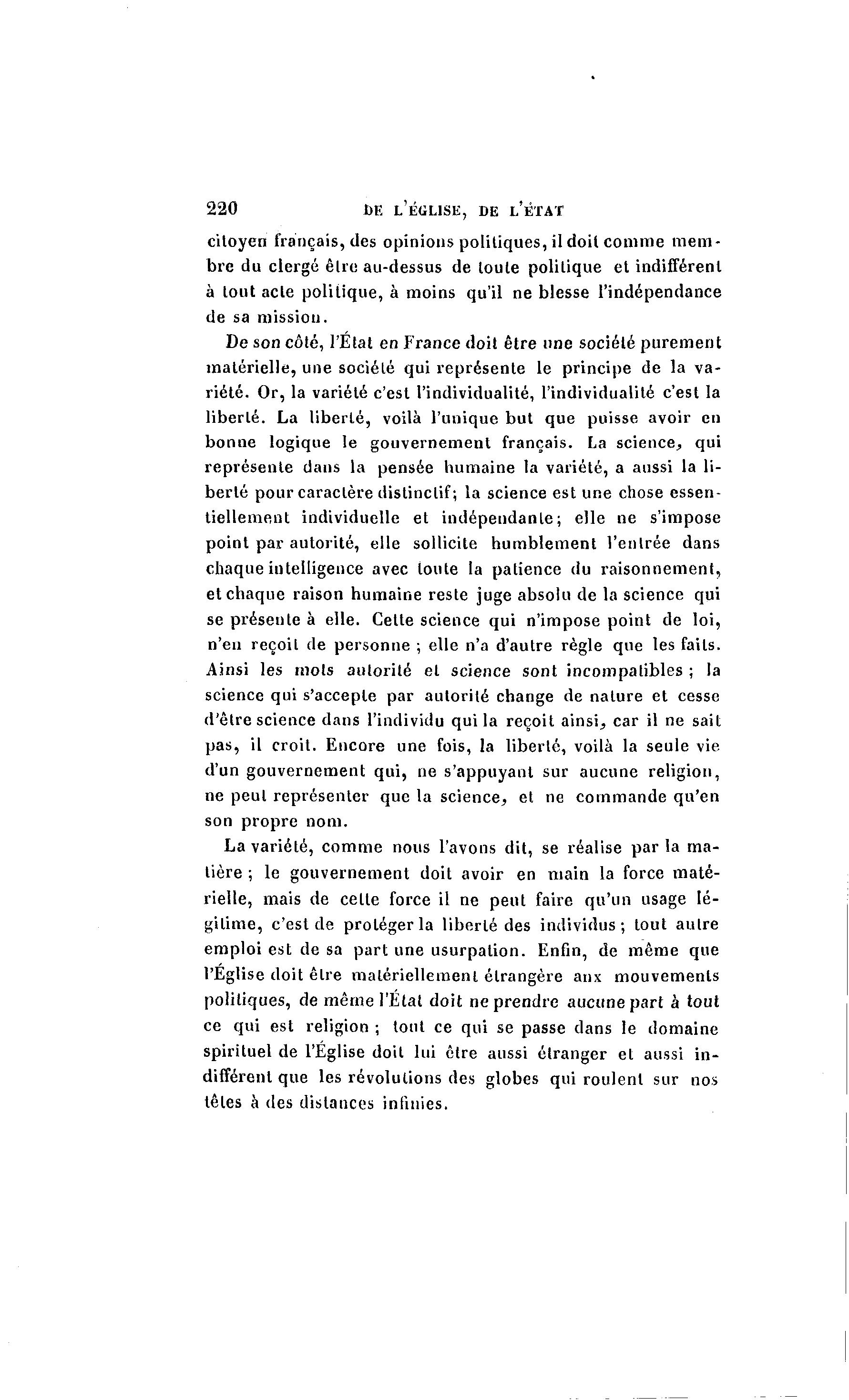220 DE L'ÉGLISE, DE L'ÉTAT citoyen français, des opinions politiques, il doit comme mem- bre du clergé être au-dessus de toute politique et indifférent à tout acte politique, à moins qu'il ne blesse l'indépendance de sa mission. De son côté, l'Etat en France doit être une société purement matérielle, une société qui représente le principe de la va- riété. Or, la variété c'est l'individualité, l'individualité c'est la liberté. La liberté, voilà l'unique but que puisse avoir en bonne logique le gouvernement français. La science, qui représente dans la pensée humaine la variété, a aussi la li- berté pour caractère distinclif; la science est une chose essen- tiellement individuelle et indépendante; elle ne s'impose point par autorité, elle sollicite humblement l'entrée dans chaque intelligence avec toute la patience du raisonnement, et chaque raison humaine reste juge absolu de la science qui se présente à elle. Cette science qui n'impose point de loi, n'en reçoit de personne ; elle n'a d'autre règle que les faits. Ainsi les mots autorité et science sont incompatibles ; la science qui s'accepte par autorité change de nature et cesse d'être science dans l'individu qui la reçoit ainsi, car il ne sait pas, il croit. Encore une fois, la liberté, voilà la seule vie d'un gouvernement qui, ne s'appuyanl sur aucune religion, ne peut représenter que la science, et ne commande qu'en son propre nom. La variété, comme nous l'avons dit, se réalise par la ma- tière ; le gouvernement doit avoir en main la force maté- rielle, mais de cette force il ne peut faire qu'un usage lé- gitime, c'est de proléger la liberté des individus; tout autre emploi est de sa part une usurpation. Enfin, de même que l'Eglise doit être matériellement étrangère aux mouvements politiques, de même l'Etat doit ne prendre aucune part à tout ce qui est religion ; tout ce qui se passe dans le domaine spirituel de l'Église doit lui être aussi étranger et aussi in- différent que les révolutions des globes qui roulent sur nos têtes à des distances infinies.