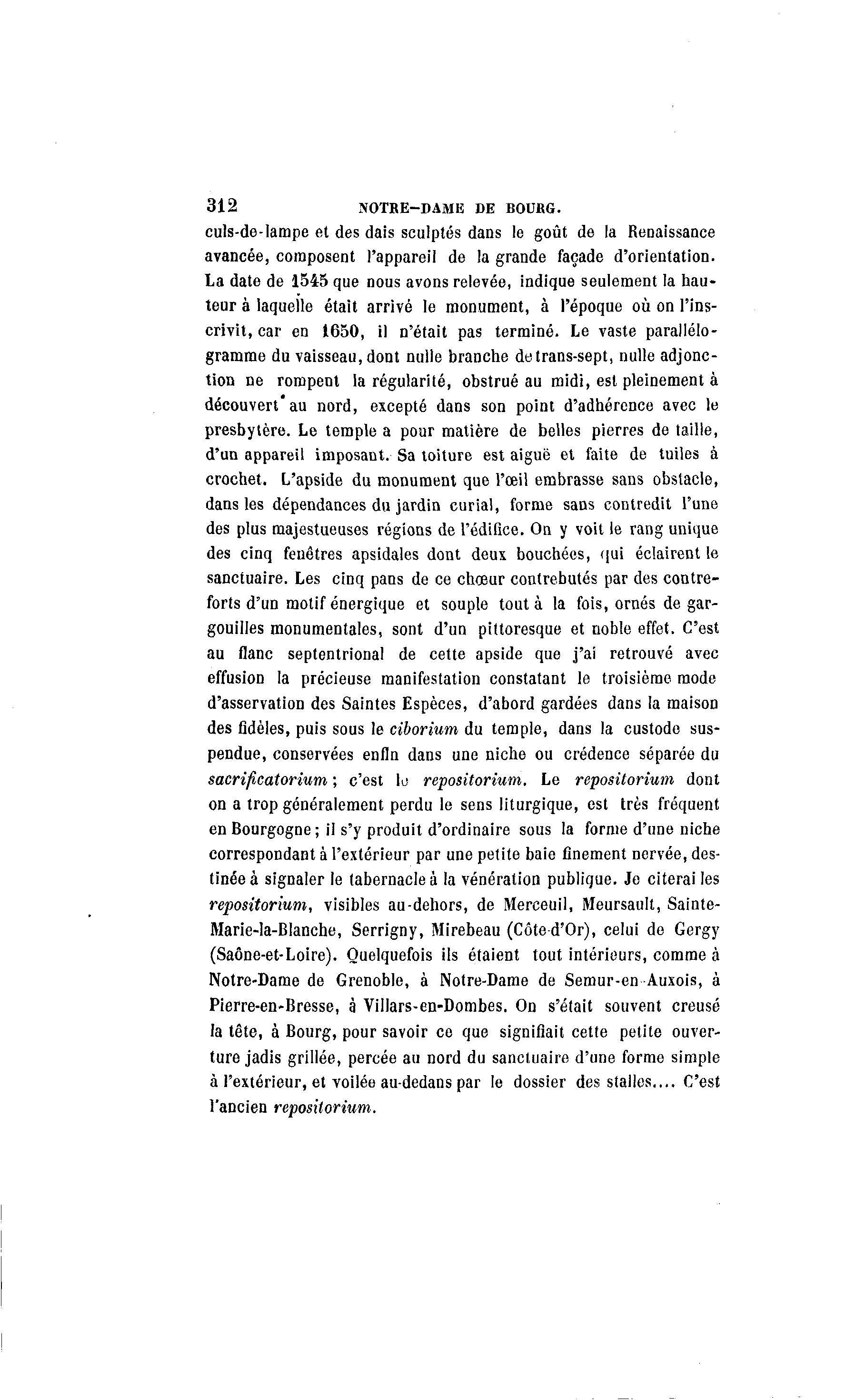 312 NOTRE-DAME DE BOUBG. culs-de-Iampe et des dais sculptés dans le goût de la Renaissance avancée, composent l'appareil de la grande façade d'orientation. La date de 1545 que nous avons relevée, indique seulement la hau- teur à laquelle était arrivé le monument, à l'époque où on l'ins- crivit, car en 1650, il n'était pas terminé. Le vaste parallélo- gramme du vaisseau, dont nulle branche detrans-sept, nulle adjonc- tion ne rompent la régularité, obstrué au midi, est pleinement à découvert'au nord, excepté dans son point d'adhérence avec le presbytère. Le temple a pour matière de belles pierres de taille, d'un appareil imposant. Sa toiture est aiguë et faite de tuiles à crochet. L'apside du monument que l'œil embrasse sans obstacle, dans les dépendances du jardin curial, forme sans contredit l'une des plus majestueuses régions de l'édifice. On y voit le rang unique des cinq fenêtres apsidales dont deux bouchées, qui éclairent le sanctuaire. Les cinq pans de ce chœur contrebutés par des contre- forts d'un motif énergique et souple tout à la fois, ornés de gar- gouilles monumentales, sont d'un pittoresque et noble effet. C'est au flanc septentrional de cette apside que j'ai retrouvé avec effusion la précieuse manifestation constatant le troisième mode d'asservation des Saintes Espèces, d'abord gardées dans la maison des fidèles, puis sous le ciborium du temple, dans la custode sus- pendue, conservées enfin dans une niche ou crédence séparée du sacrificatorium ; c'est lo repositorium. Le repositorium dont on a trop généralement perdu le sens liturgique, est très fréquent en Bourgogne ; il s'y produit d'ordinaire sous la forme d'une niche correspondant à l'extérieur par une petite baie finement nervée, des- tinée à signaler le tabernacle à la vénération publique. Je citerai les repositorium, visibles au-dehors, de Merceuil, Meursault, Sainte- Marie-la-Blanche, Serrigny, Mirebeau (Côted'Or), celui de Gergy (Saône-et-Loire). Quelquefois ils étaient tout intérieurs, comme à Notre-Dame de Grenoble, à Notre-Dame de Semur-en Auxois, à Pierre-en-Bresse, à Villars-en-Dombes. On s'était souvent creusé la tête, à Bourg, pour savoir ce que signifiait cette petite ouver- ture jadis grillée, percée au nord du sanctuaire d'une forme simple à l'extérieur, et voilée au-dedans par le dossier des stalles.... C'est l'ancien repositorium.